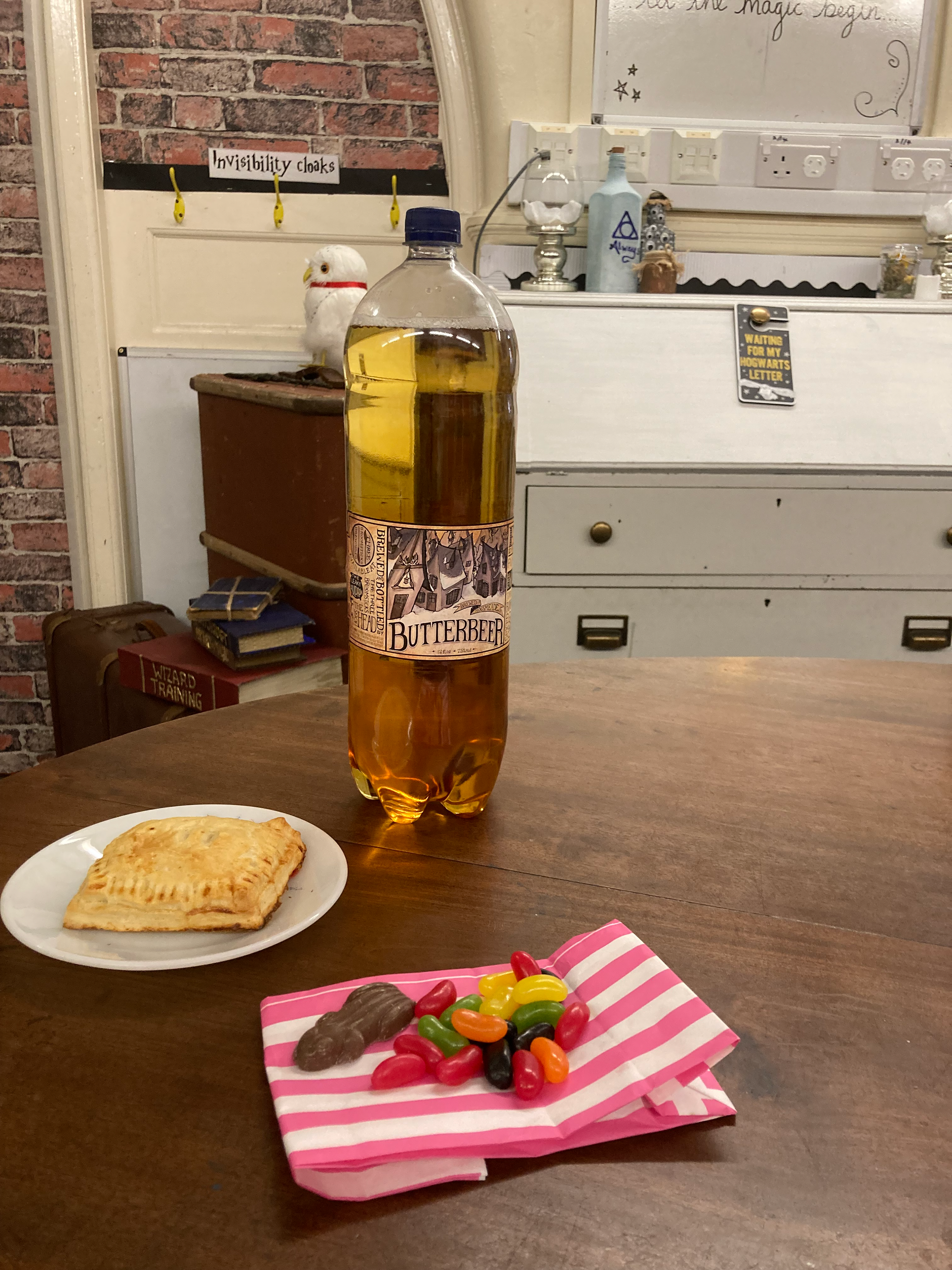 We had butter beer (Cream soda with caramel essence), Pumpkin Pasties (it was actually butternut squash but still), Bertie Botts Every Flavour Beans (just normal flavours but they looked good) and Chocolate Frogs (big box from bookers for £3.40)