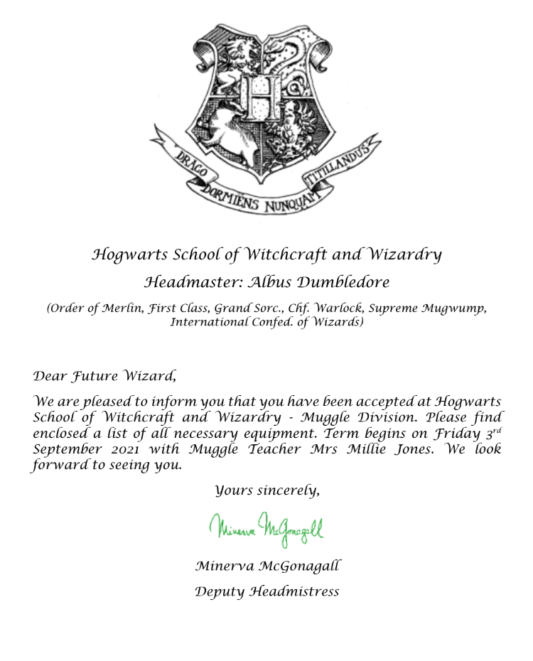 Within the envelope, they found their Hogwarts letter explaining that they had been accepted into the Hogwarts School for Witchcraft and Wizardry - Muggle Division. They were told that there would be a series of surprise arrivals during the day and to keep a look out for owls as they went about their day.