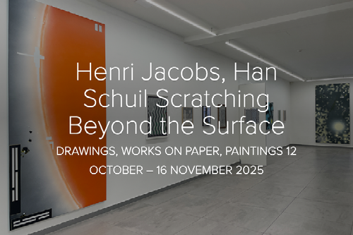 Where Henri Jacobs explores the surface of the drawing Han Schuil attempts to capture the absolute, to penetrate the mystery of life and death. In the gallery exhibition, Henri Jacobs’s interwoven drawings are presented in partitions perpendicular to the wall that contain a window displaying his pleated drawing making both sides visible. Between the partitions the paintings by Han Schuil are presented together with further drawings by Henry Jacobs. Besides this an elongated leporello drawing of a mountain range by Henri Jacobs is shown and as a pendant a long horizontal painting on shaped aluminium by Han Schuil.