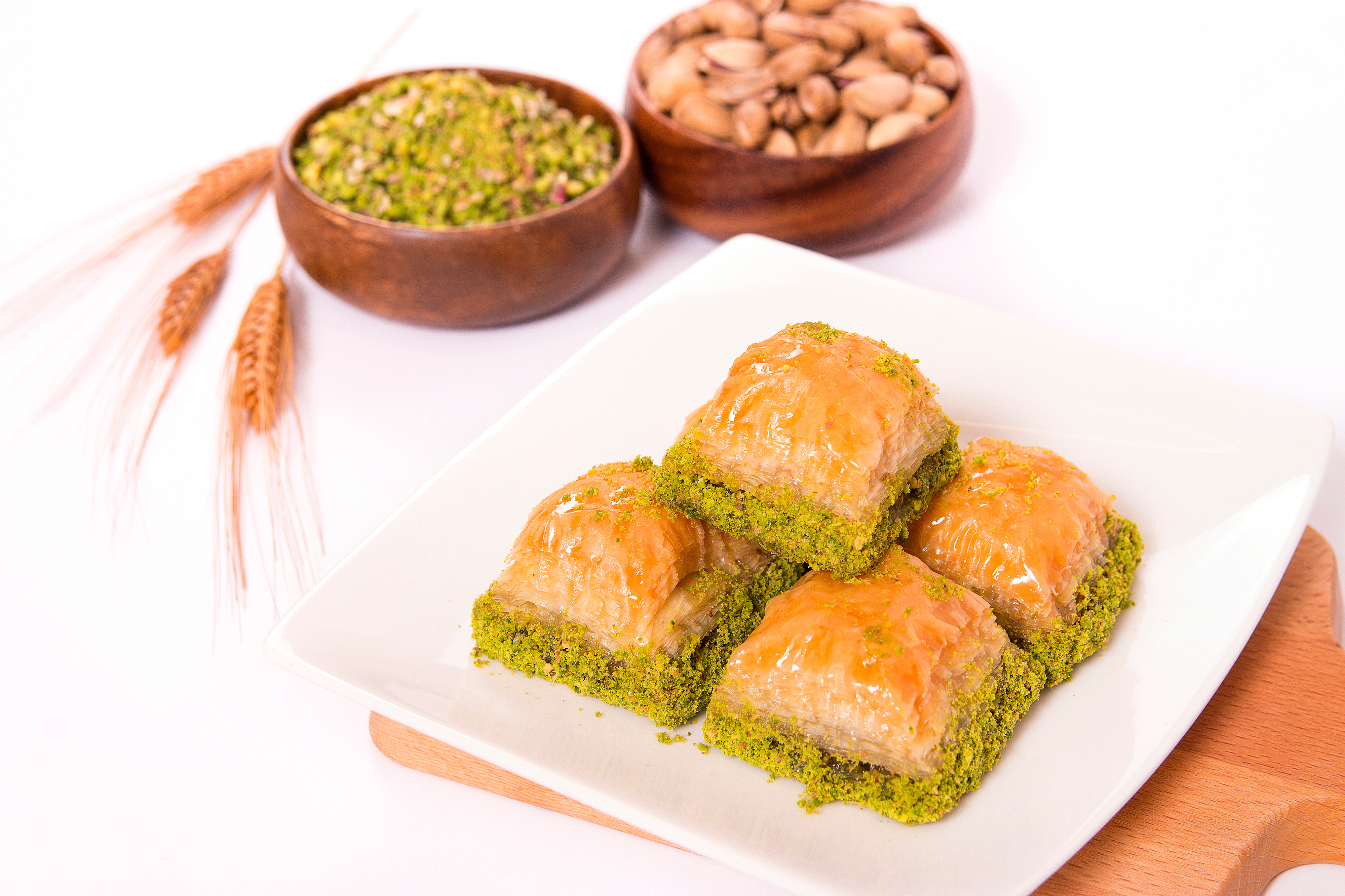 „Baklava ist ein köstliches, süsses Gebäck aus der nahöstlichen Küche, das aus vielen Schichten hauchdünnem Blätterteig, gefüllt mit gehackten Nüssen und süssem Sirup besteht.“