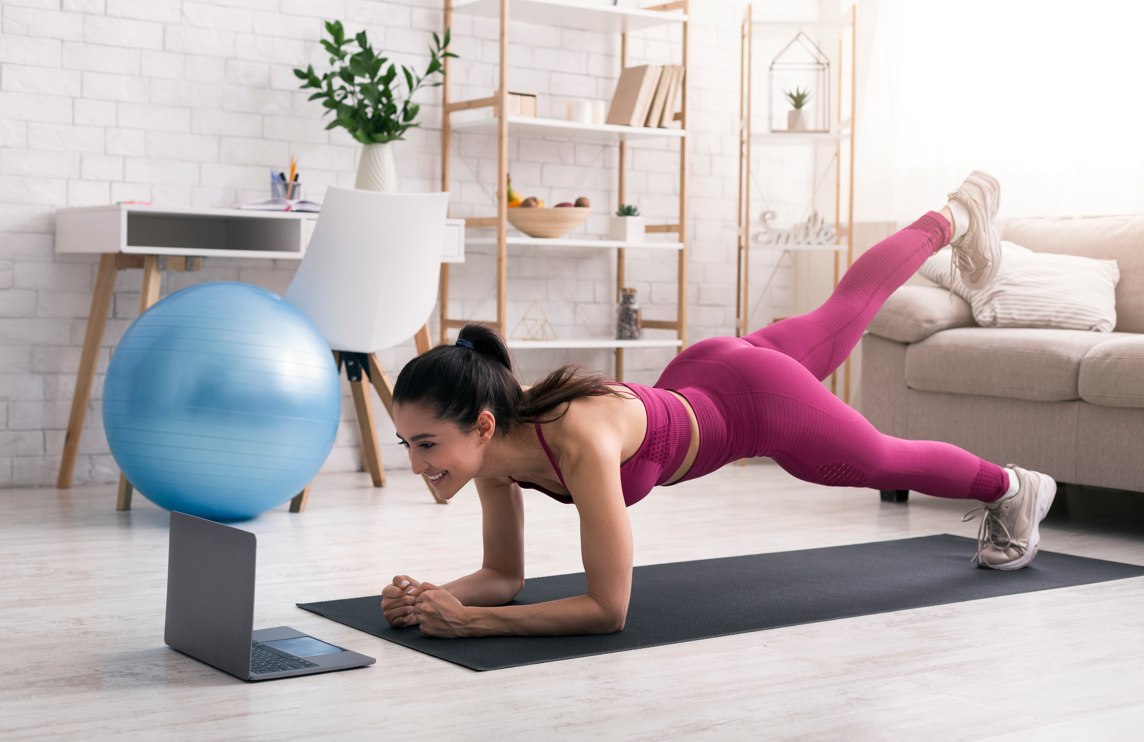 Créé à partir d’images de : Prostock-studio - "Sports during quarantine. Beautiful girl participating in online fitness class via laptop at home" • F8 \ Suport Ukraine - "Two active sportive women exercise hand up yoga class in a gym." • Prostock-studio - "Woman doing upward plank exercise at modern studio" • Somkiat - "Women exercising in fitness studio yoga classes"