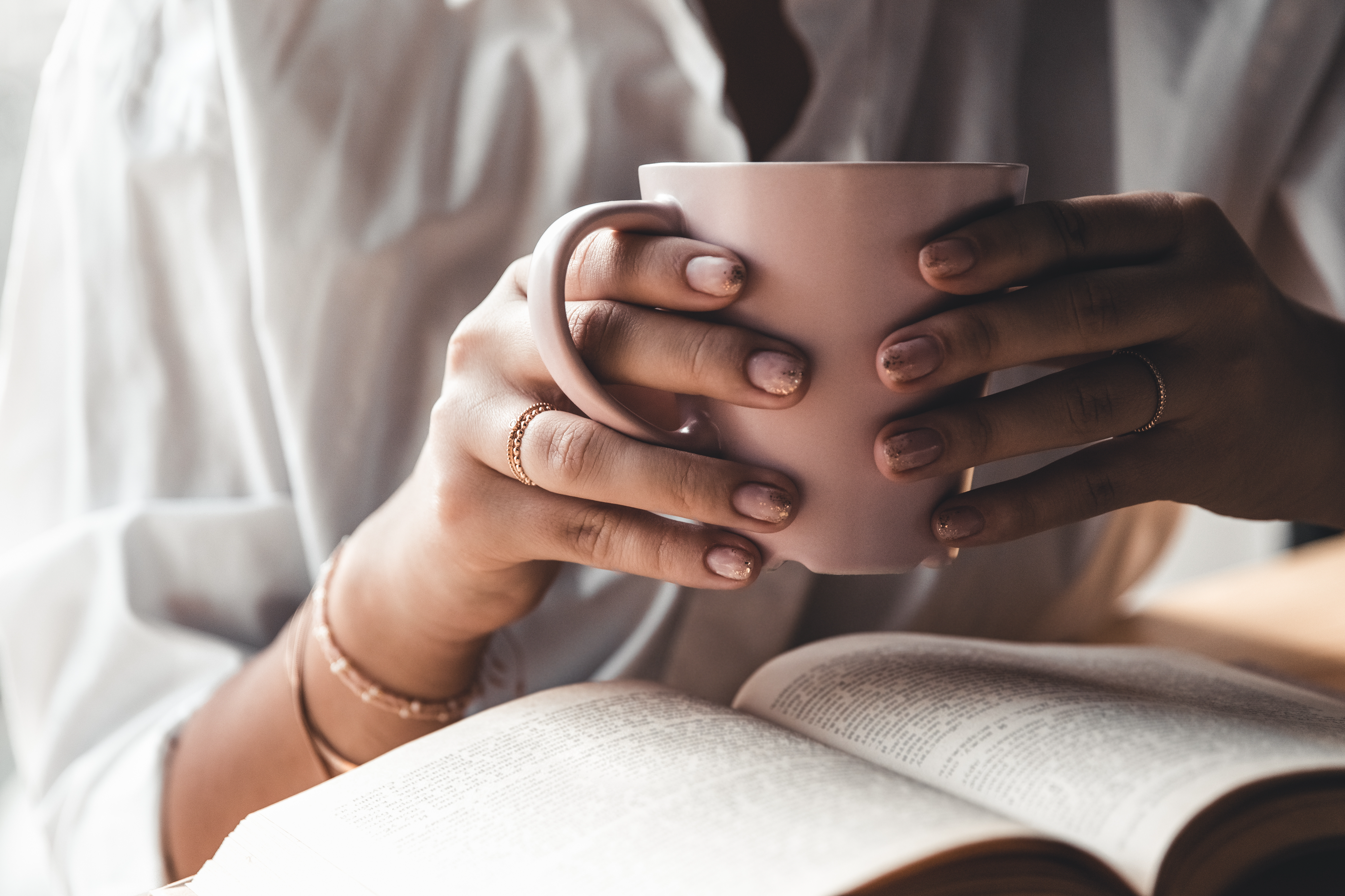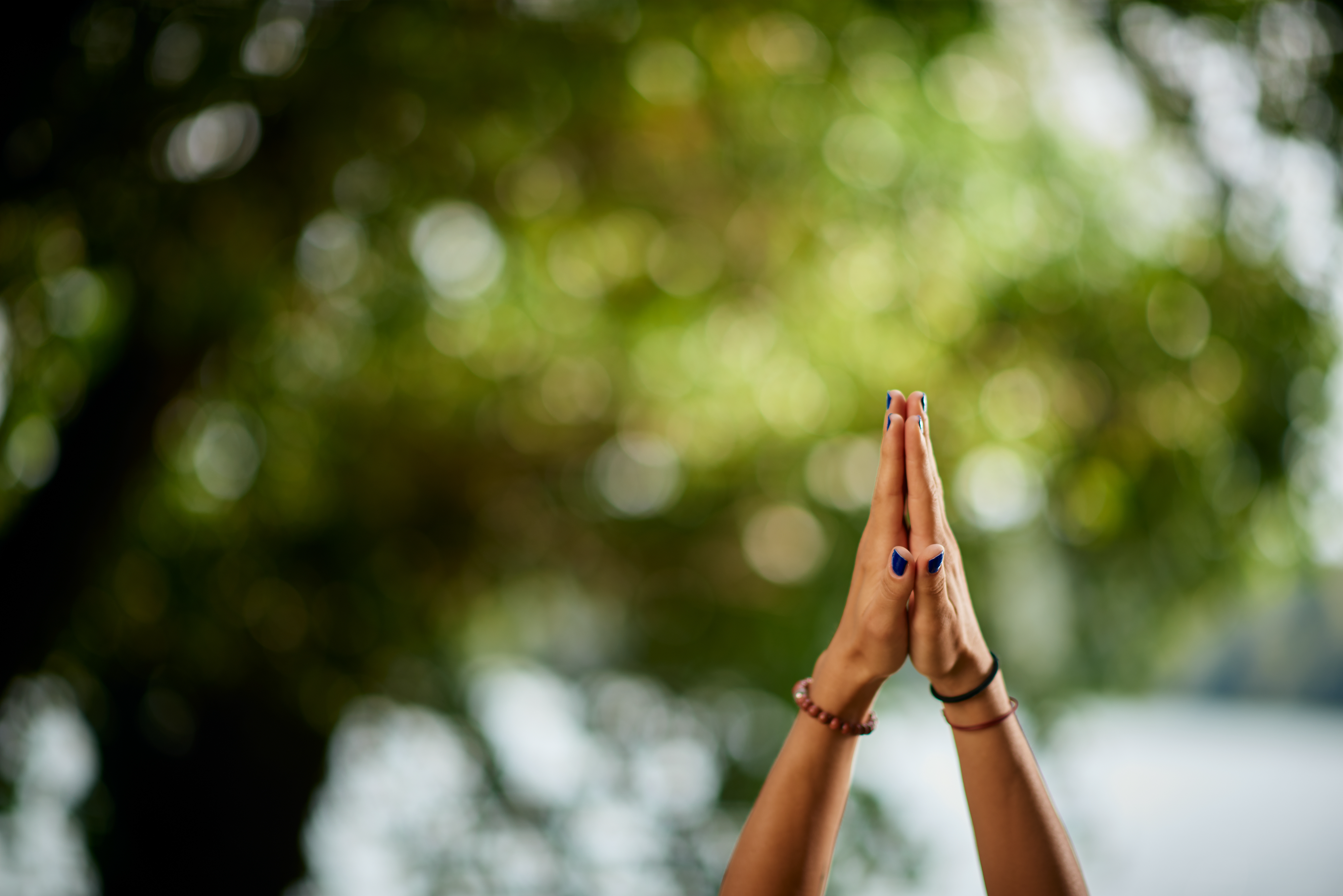 Created with images by chika_milan - "Picture of female`s hands in praying position. Yoga exercising in nature concept." • SianStock - "Woman practicing yoga in various poses" • amenic181 - "Sprouts watered from a watering can( focus on right plant )" • Svetlana - "Woman in the morning drinks coffee and reads old book in a white shirt. Education, drink. manicure" • 1000 Words - "Playing field with leafy trees and cloudy sky above" • sebra - "A loving hug at home" • Mahemud - "Marathon running race, people feet on city road "