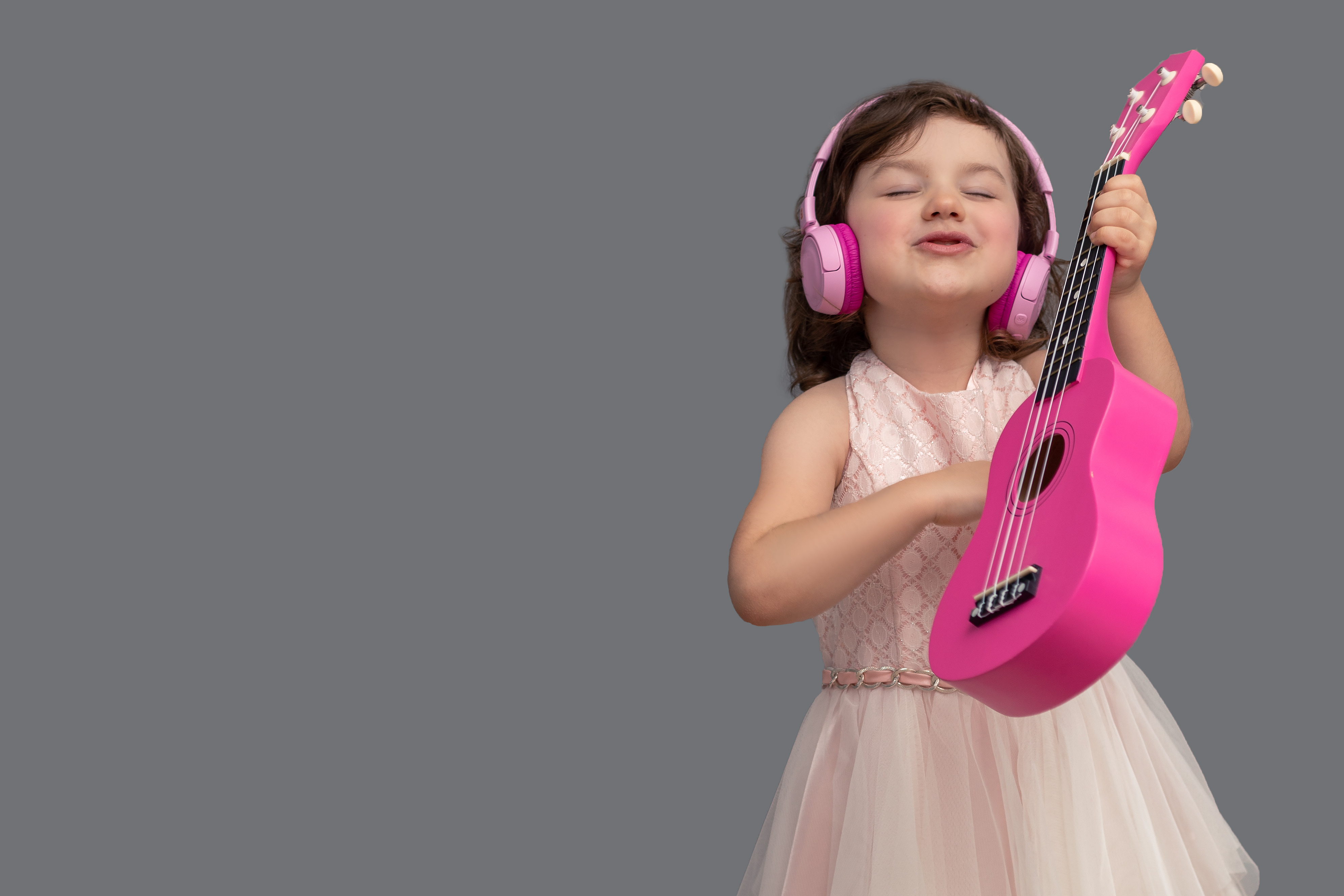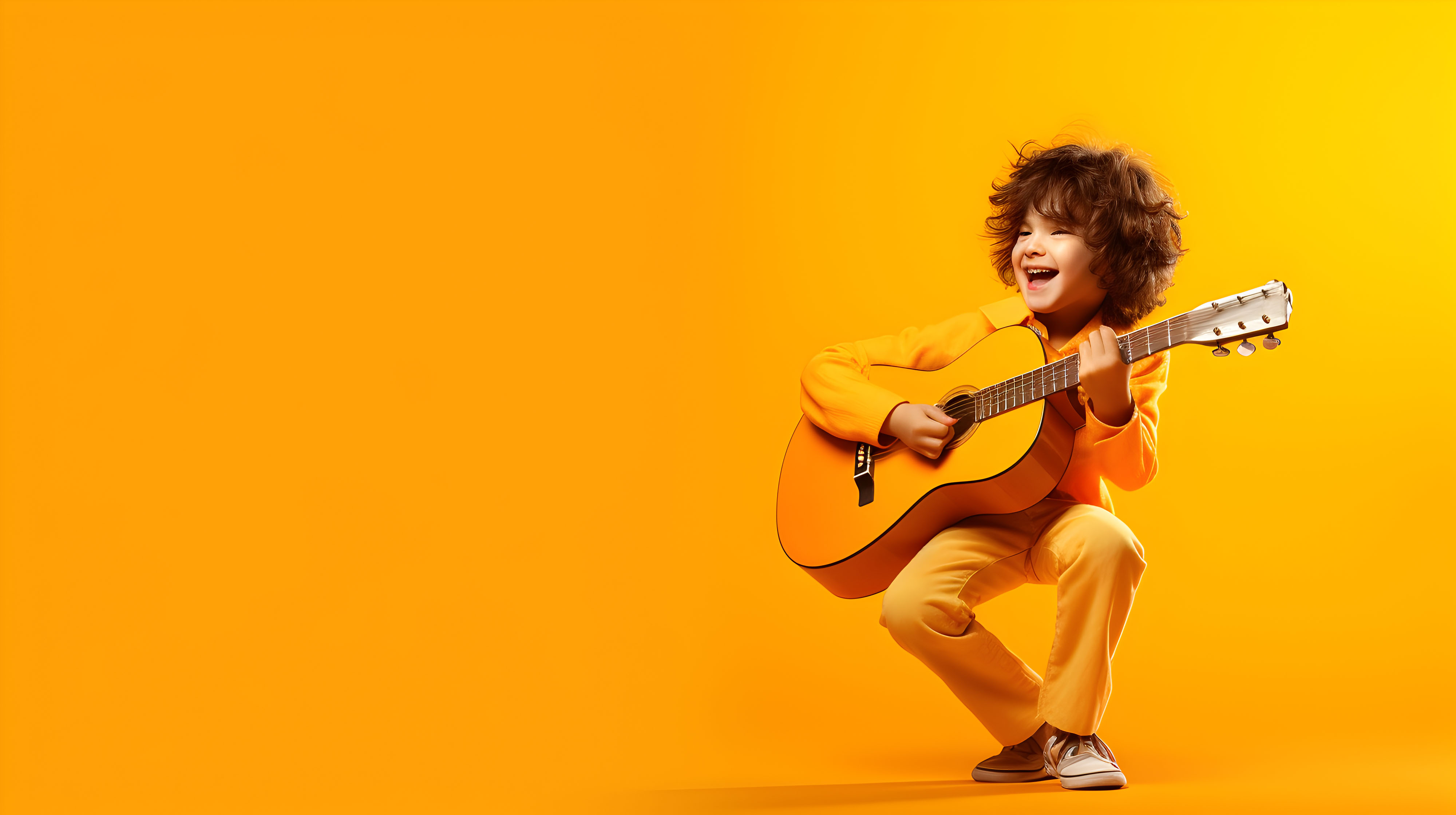 Created with images by Aboltin - "Children's hobbies: a little boy in black glasses plays the electric guitar, imitates a rock star." • Татьяна Волкова - "A beautiful and funny little girl playfully playing the pink toy guitar in the studio on gray background. Close-up photo for musical vocal studios, nursery child development centers" • SnowElf - "Joyful child playing guitar isolated on flat green background with copy space. Creative banner for children's music school." • Trendy Graphics - "Cheerful boy child playing guitar on orange background, kids music classes concept"