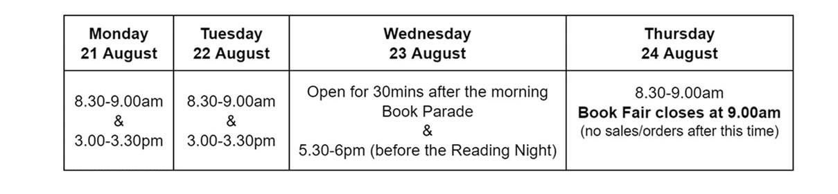 - Parents/carers can visit the Fair (opening times below) to review the books and make purchases using EFTPOS or cash (please note that we will have only limited cash for change).