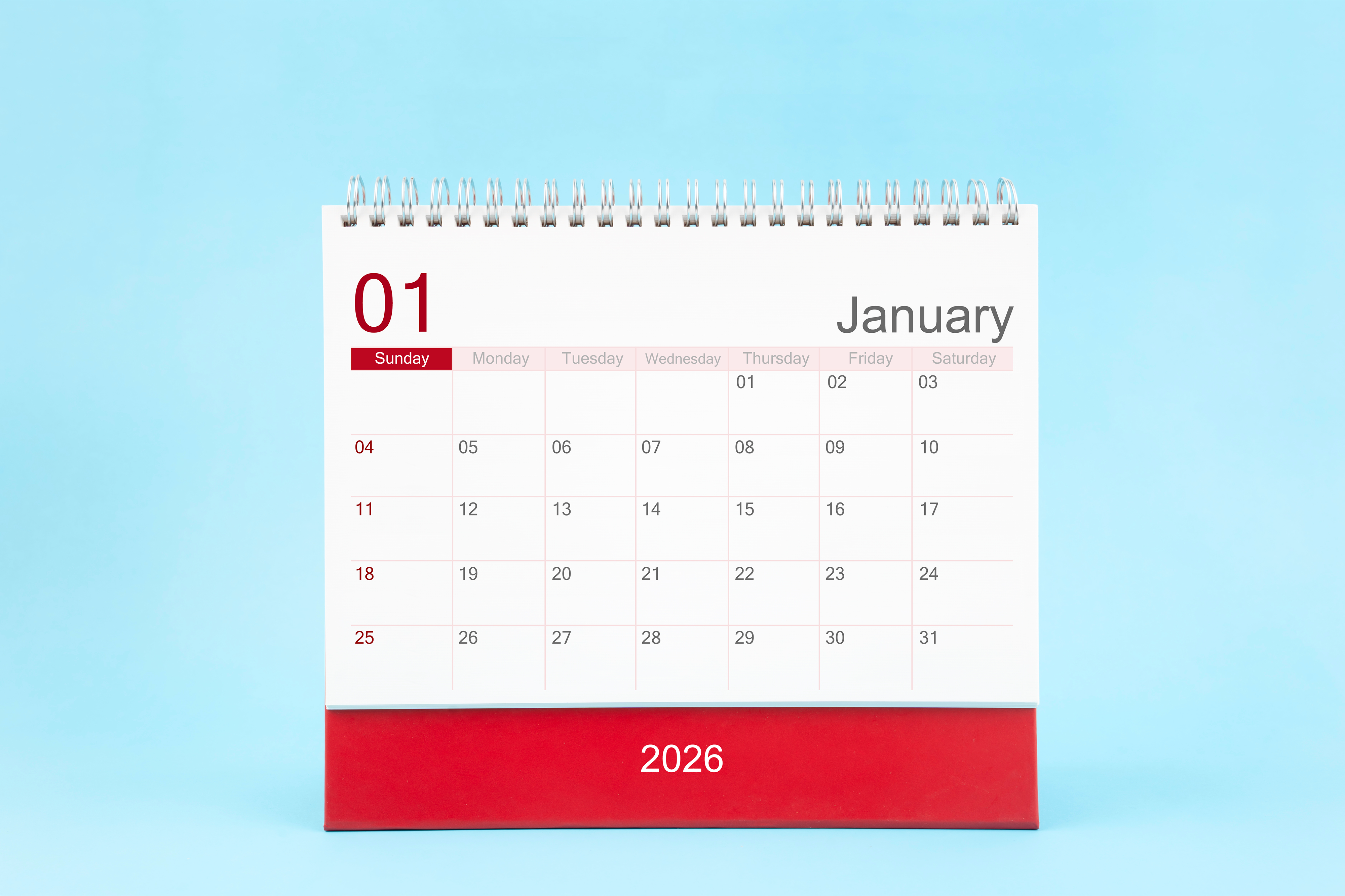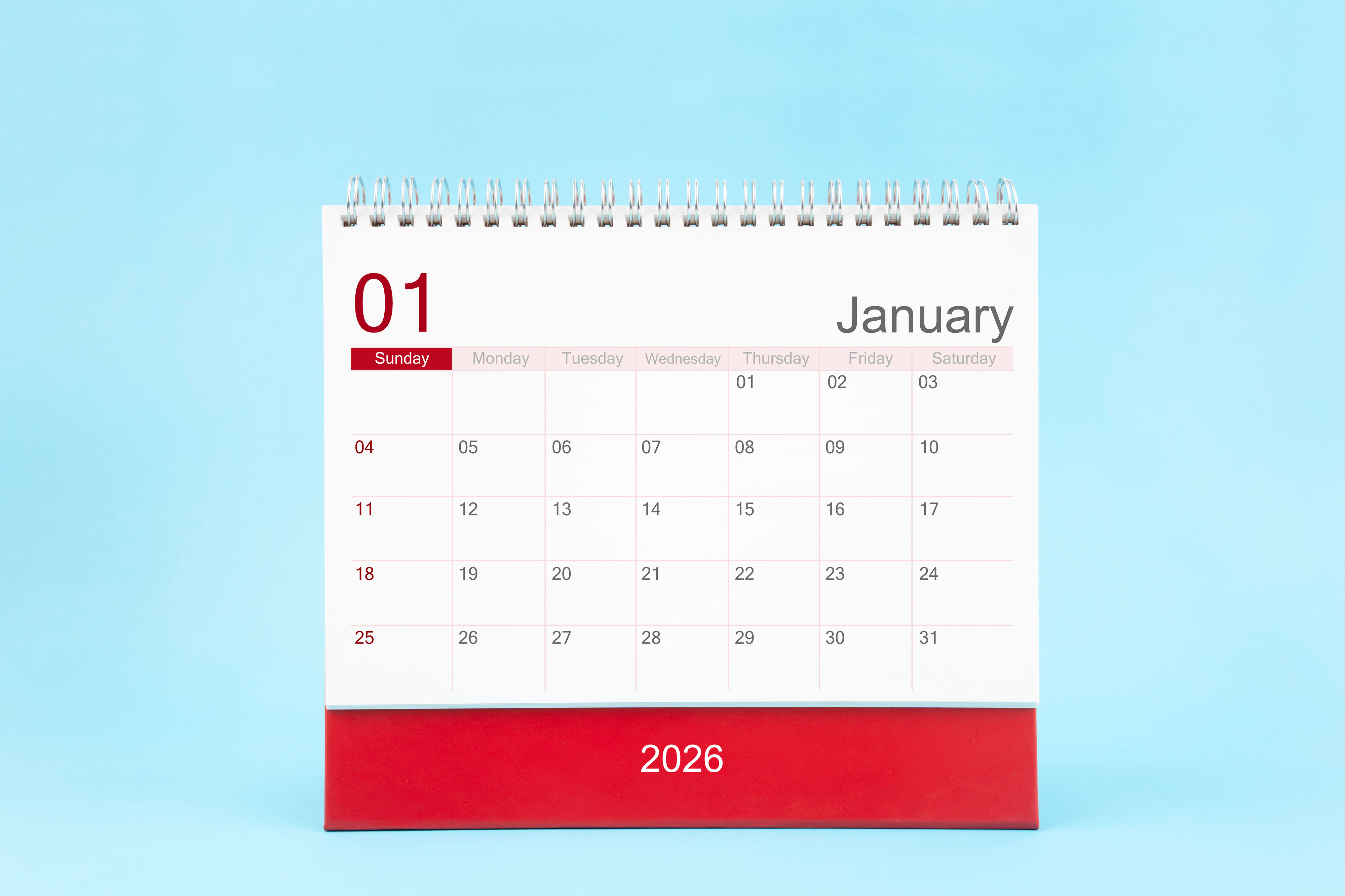 Created with images by Anastassiya - "Blue christmas ball on branch of spruce outdoor, happy new year." • Southtownboy Studio - "January 2026 Monthly desk calendar for 2026 year on blue color background, Front view."