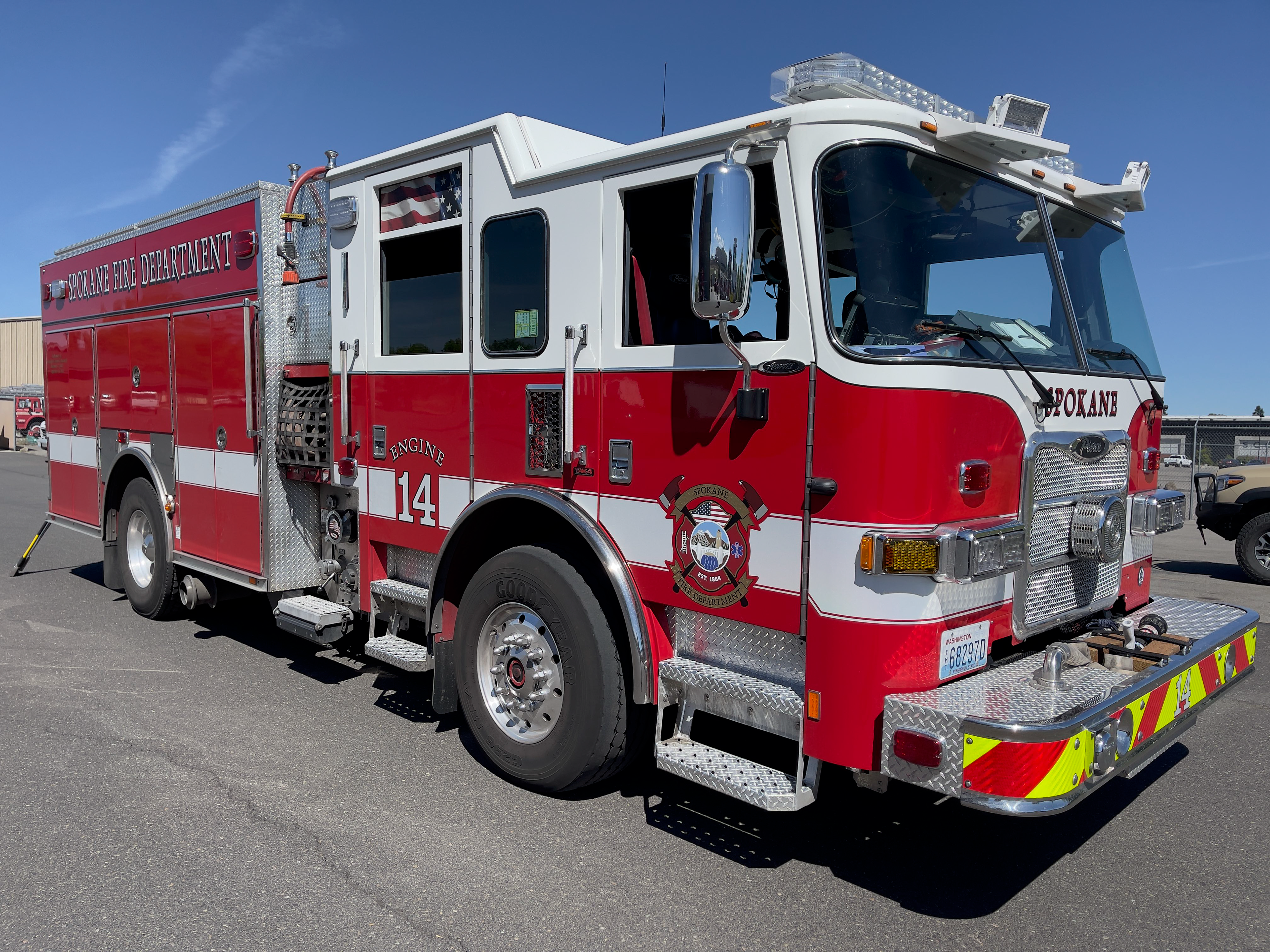 Spokane Fire Department’s (SFD) original Station 14 was commissioned in 1914 and has been relocated twice, once in 1949 and once in 1992. The current station at 1807 S. Ray houses a 3-person ALS Engine and one of Spokane’s Brush units. Engine 14 is (1) one of (3) three engine companies that is a Rescue Task Force team, trained to work in tactical environments supporting the SPD SWAT. Responses would include active shooter, high risk warrants and post-explosive incidents that involve responses from both SFD and SPD. Station 14 continues to serve the Lincoln Heights and East Central neighborhoods.