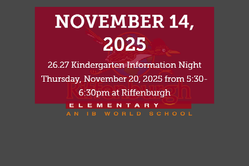 2026.27 Kindergarten Information Night will be held on Thursday, November 20th from 5:30 to 6:30pm - Please tell your friends and neighbors who may have incoming Kindergarteners!!! Parents will have an opportunity to meet our Kindergarten Team and learn about Kindergarten at Riffenburgh.