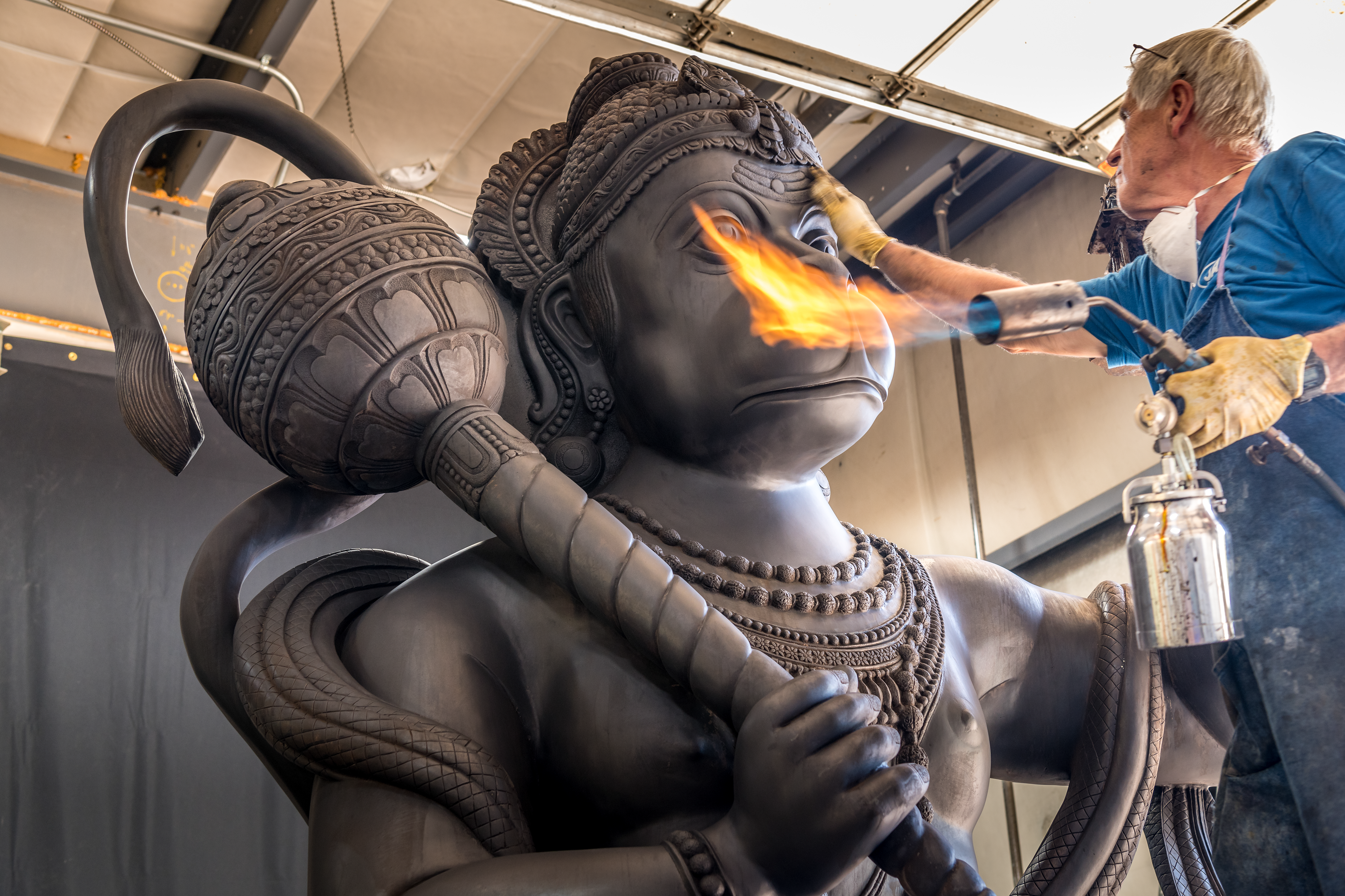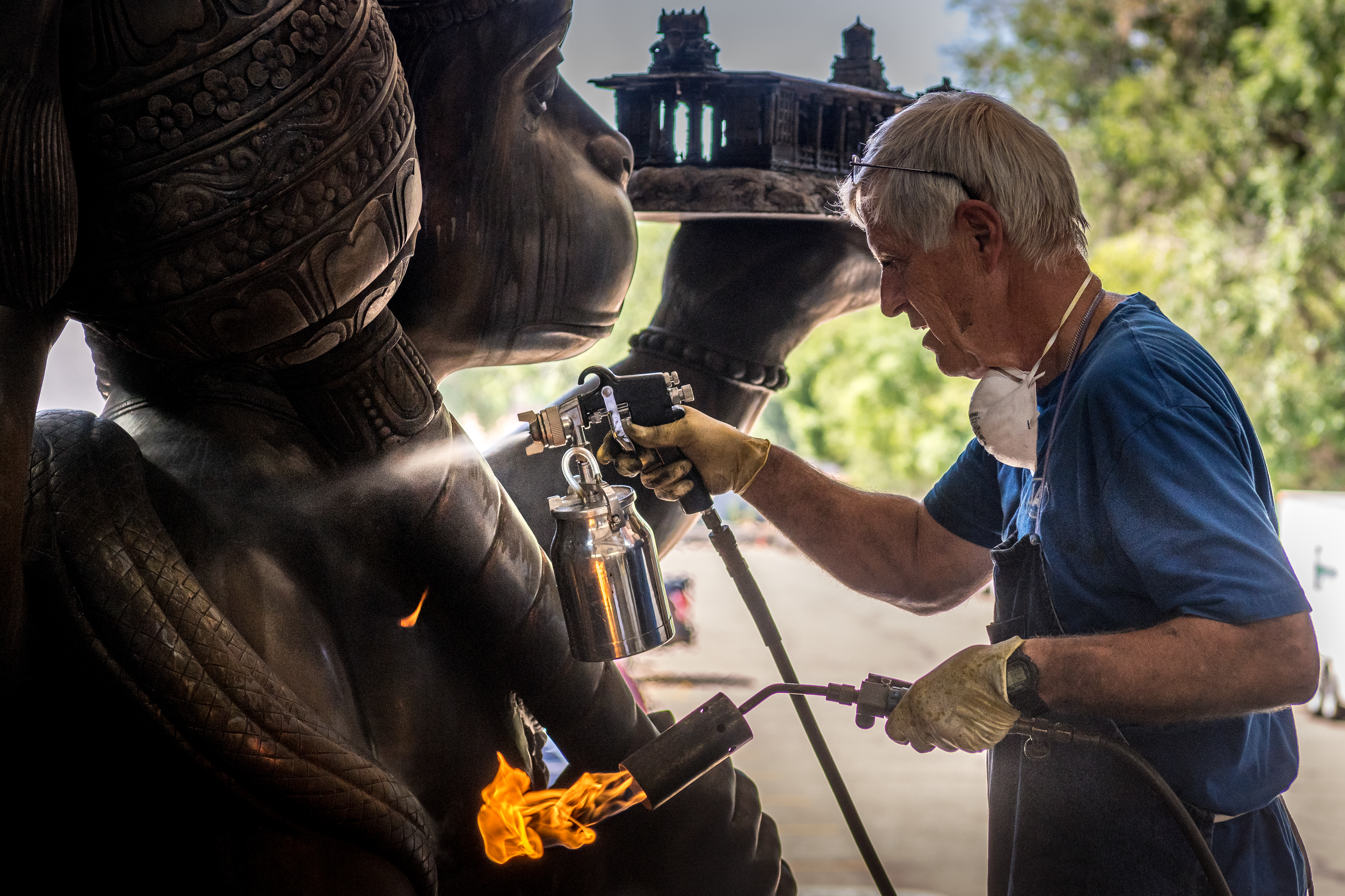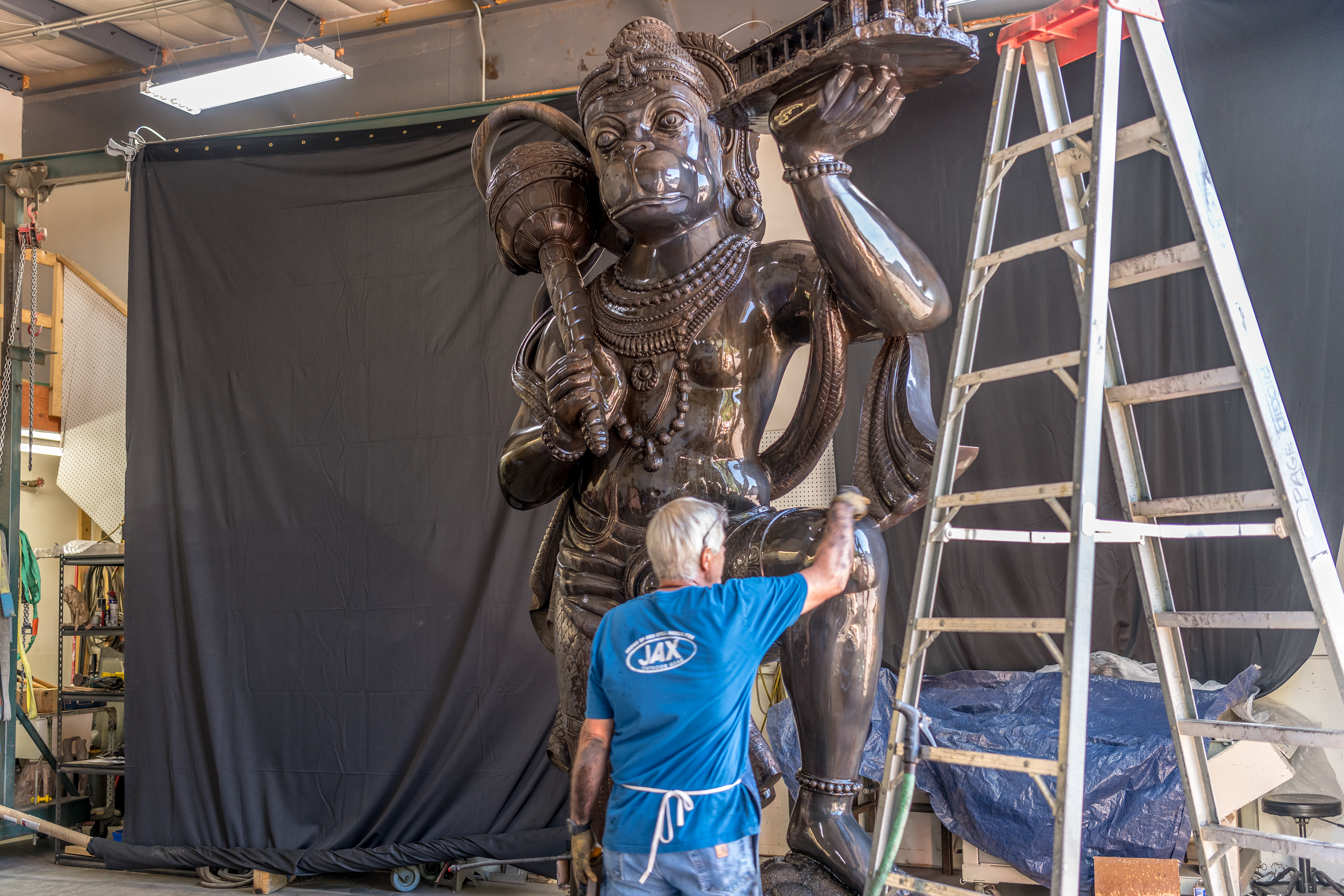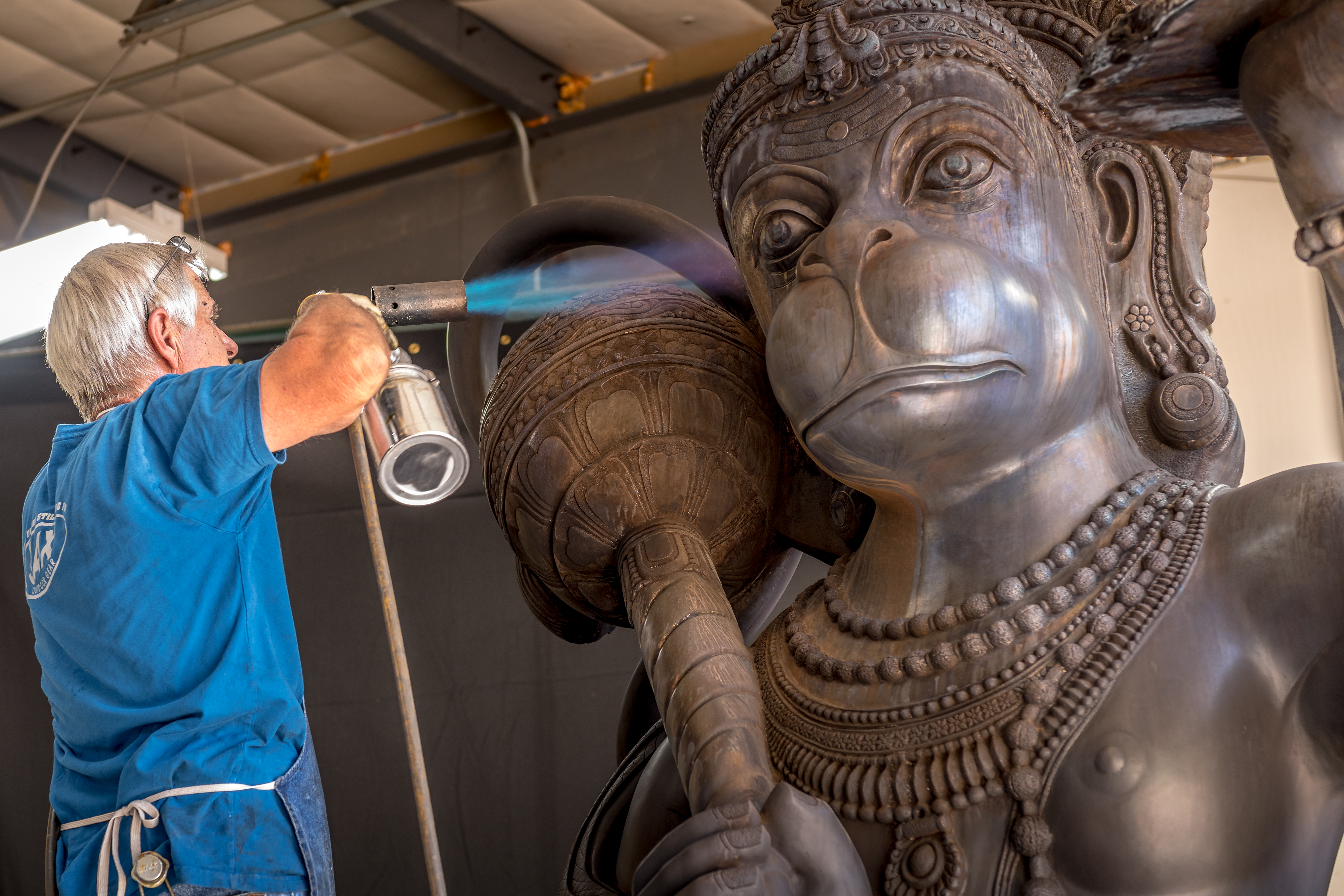 Several artists were involved in this momentous and awe-inspiring project for Patrick Kipper’s final touches in the Patination process. It’s only appropriate to mention them here: Holly Young, Bronze Sculptor and Artist, Kathy Page, Wax Chasing Artist, Bob Page, Metal Chasing Artist, Chris Buford, Metal Chasing Artist and Chris Gugelman, Metal foundry work. Each individual had a team of co-workers that played a significant role in materializing the spectacular Hanuman, currently standing tall in front of the picturesque Rudraksha Forest backdrop at Kauai Hindu Monastery.