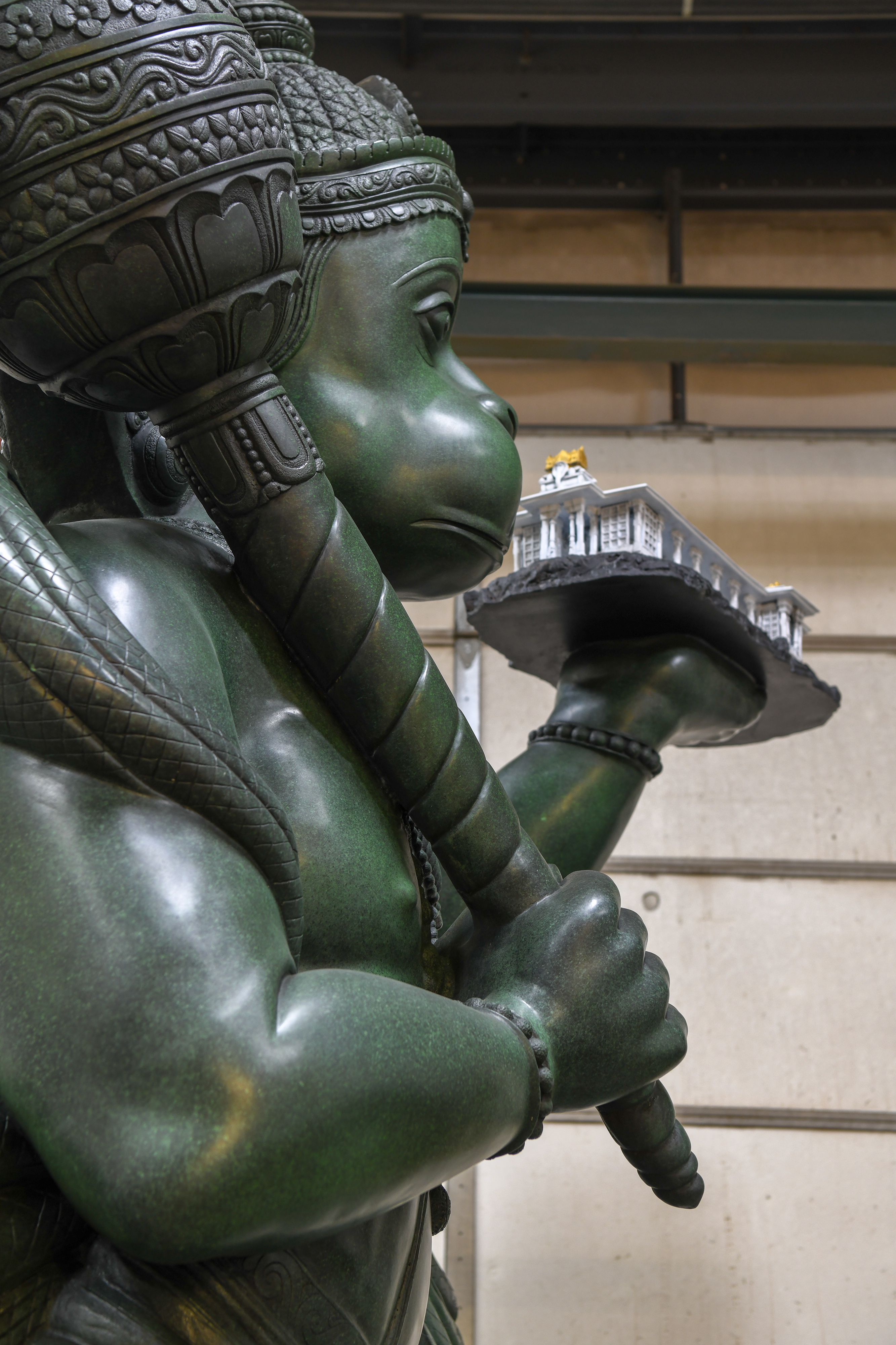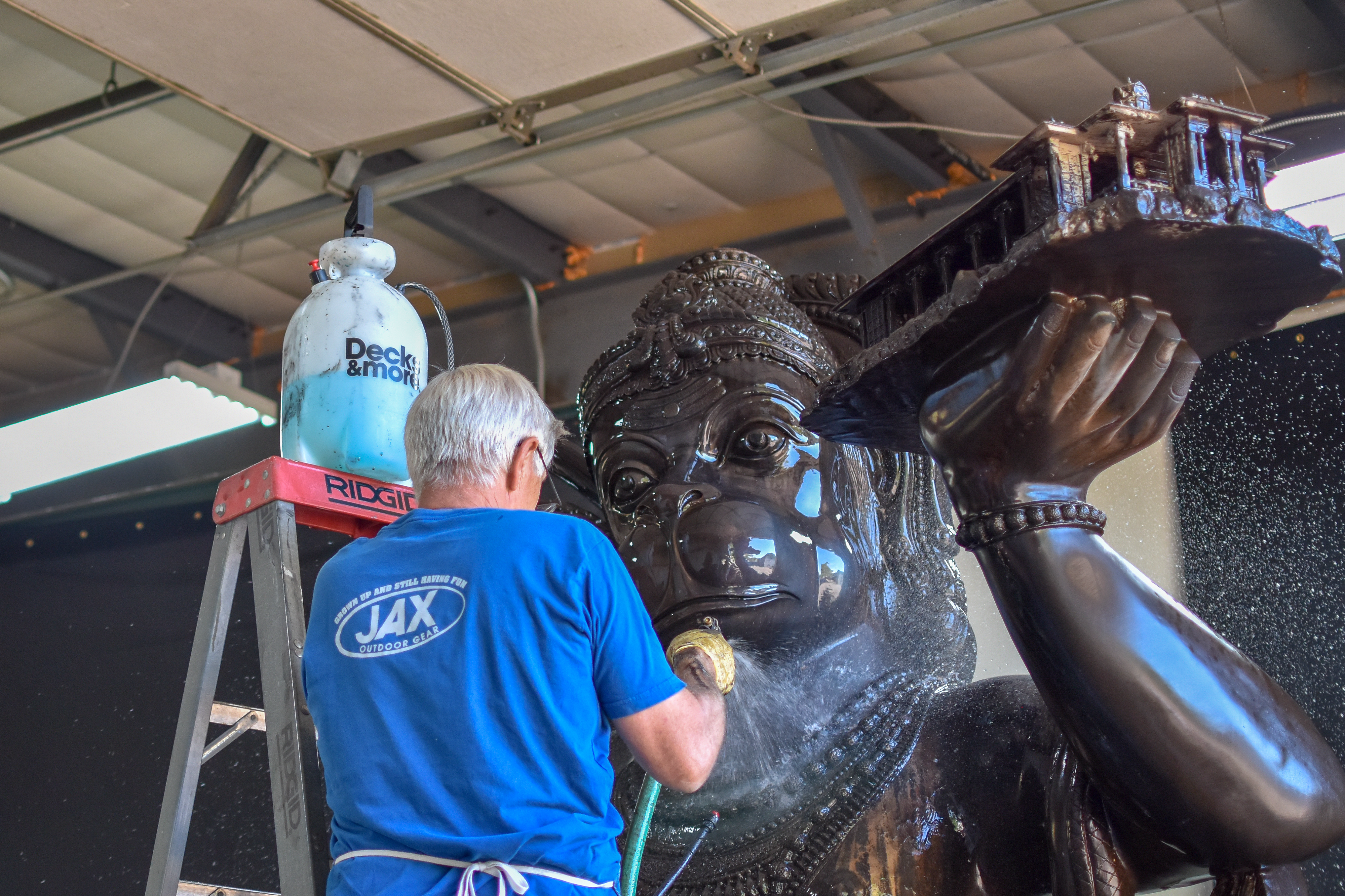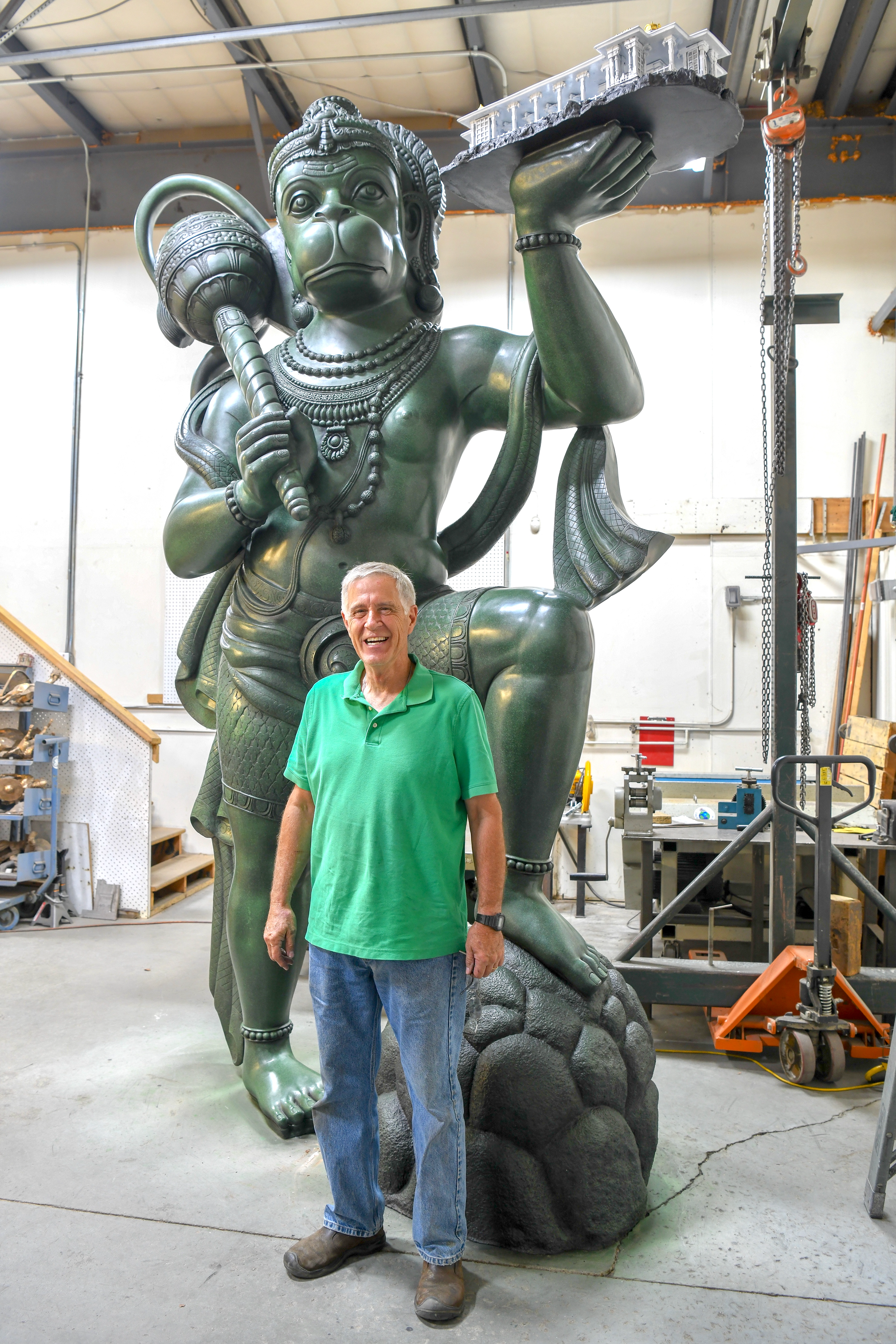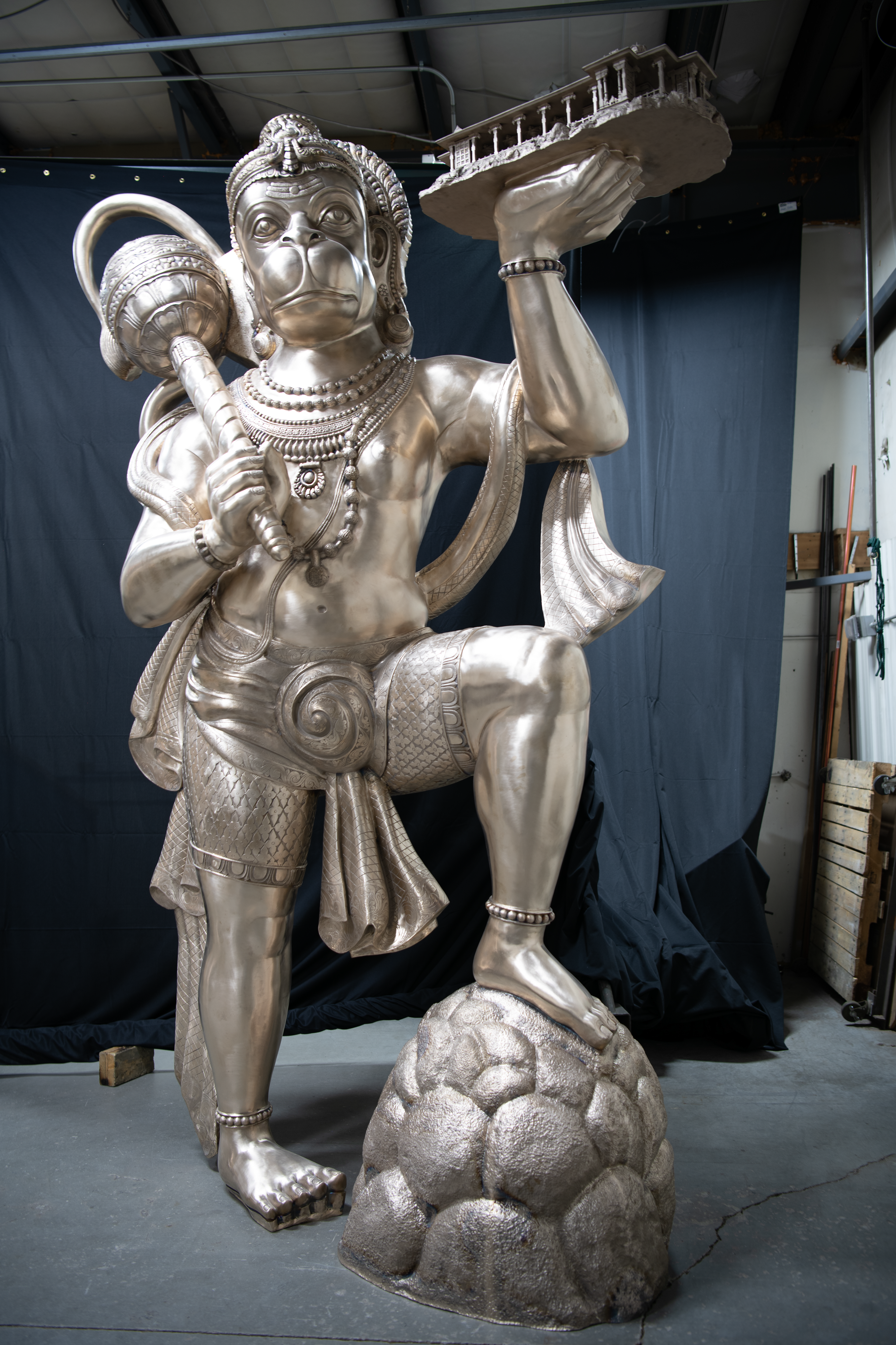 Several artists were involved in this momentous and awe-inspiring project for Patrick Kipper’s final touches in the Patination process. It’s only appropriate to mention them here: Holly Young, Bronze Sculptor and Artist, Kathy Page, Wax Chasing Artist, Bob Page, Metal Chasing Artist, Chris Buford, Metal Chasing Artist and Chris Gugelman, Metal foundry work. Each individual had a team of co-workers that played a significant role in materializing the spectacular Hanuman, currently standing tall in front of the picturesque Rudraksha Forest backdrop at Kauai Hindu Monastery.