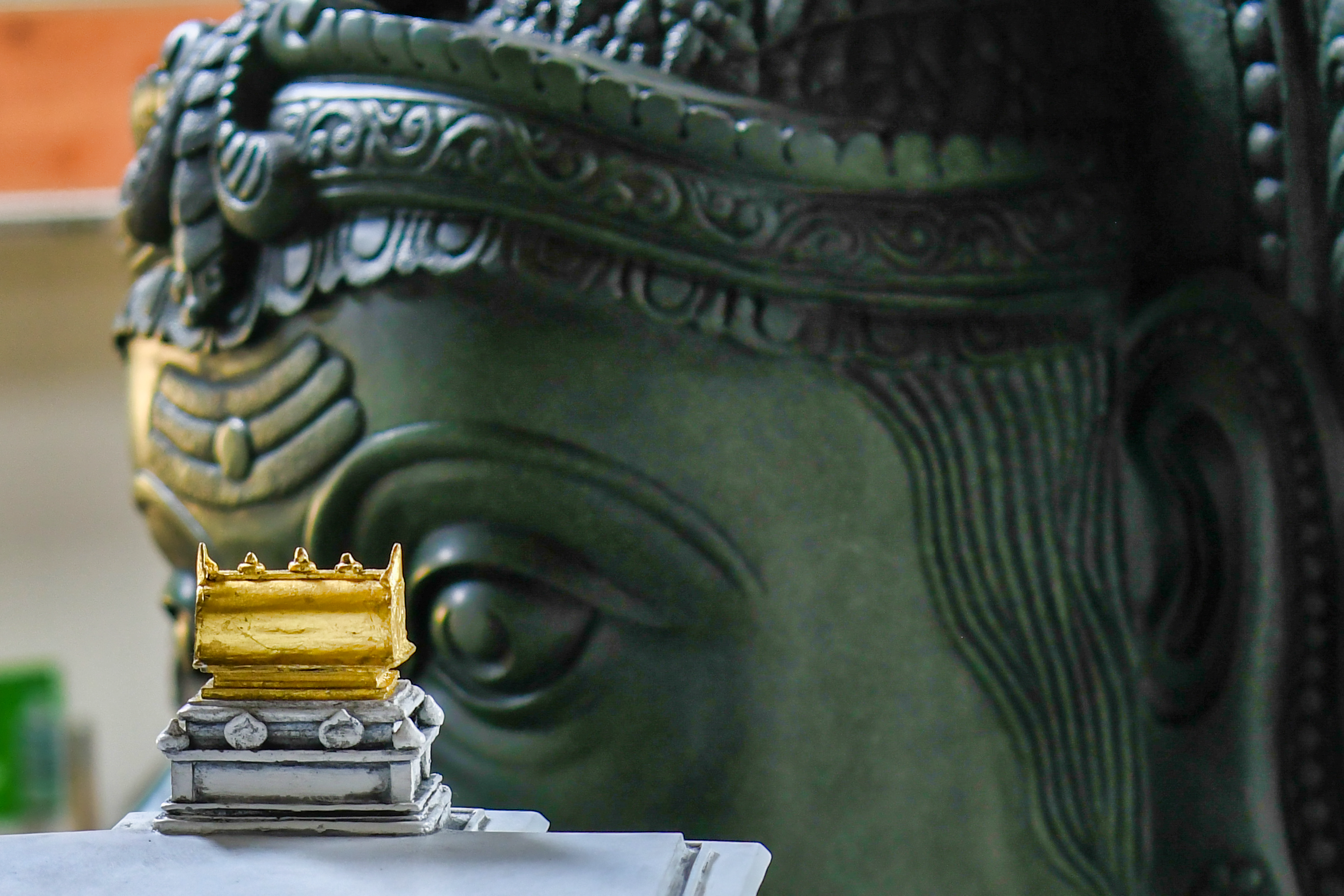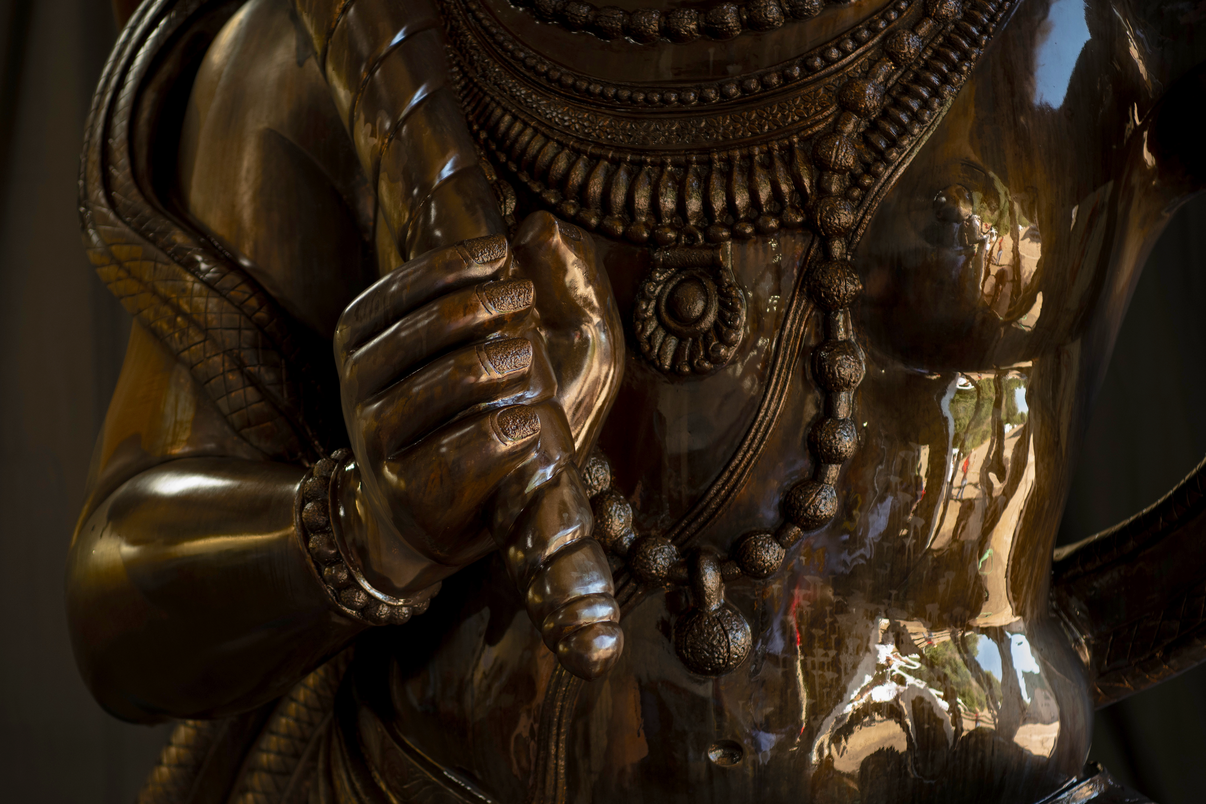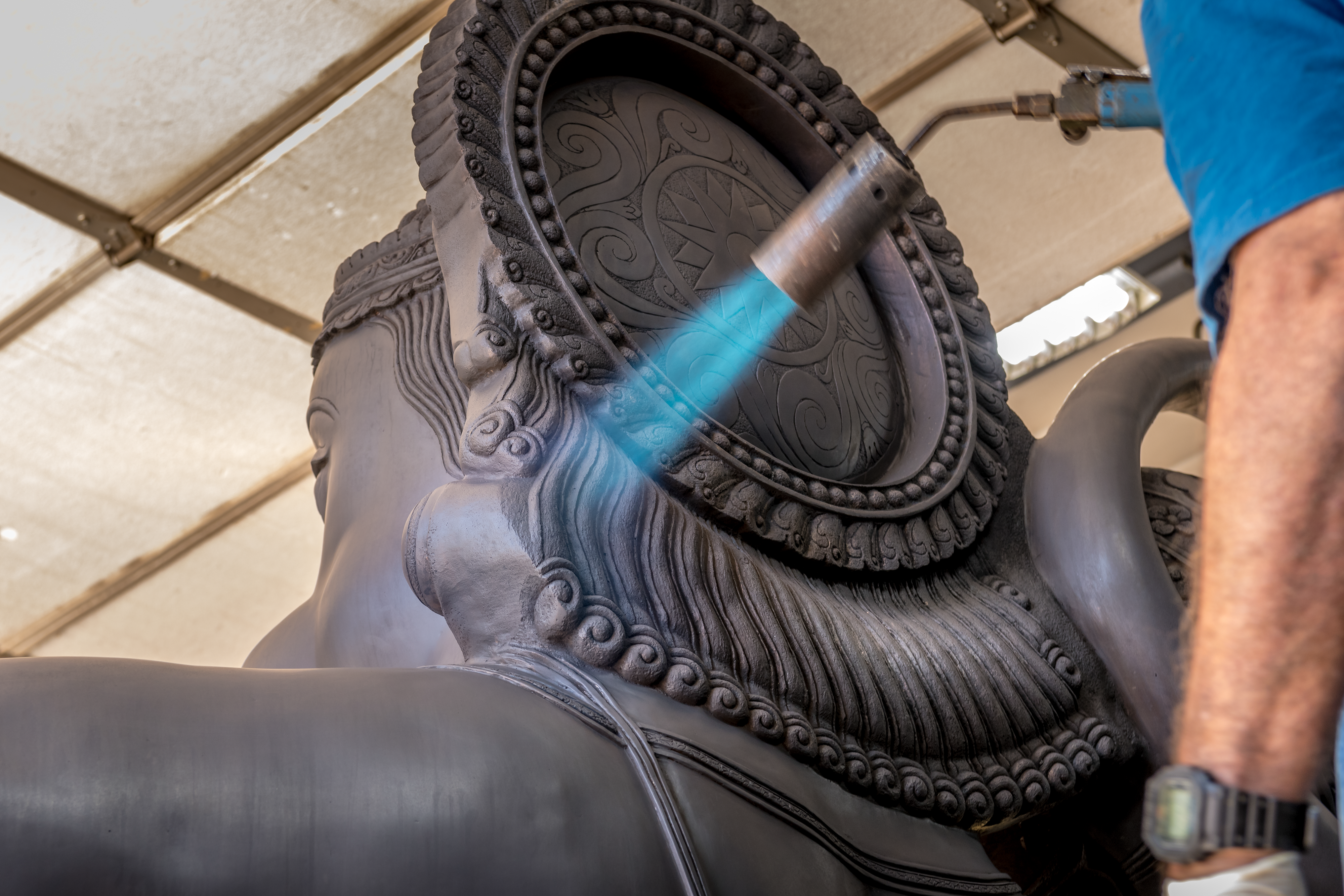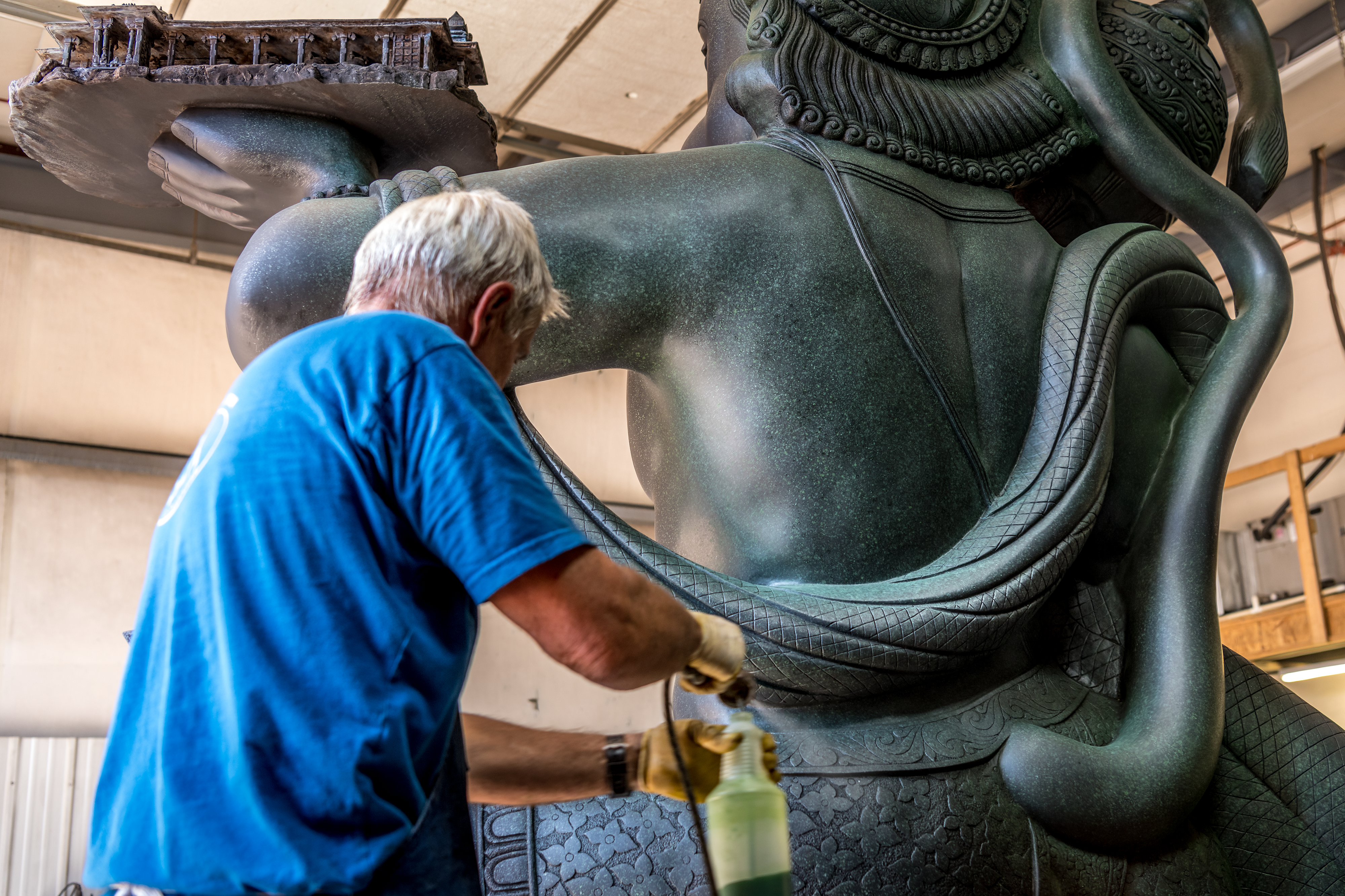 Several artists were involved in this momentous and awe-inspiring project for Patrick Kipper’s final touches in the Patination process. It’s only appropriate to mention them here: Holly Young, Bronze Sculptor and Artist, Kathy Page, Wax Chasing Artist, Bob Page, Metal Chasing Artist, Chris Buford, Metal Chasing Artist and Chris Gugelman, Metal foundry work. Each individual had a team of co-workers that played a significant role in materializing the spectacular Hanuman, currently standing tall in front of the picturesque Rudraksha Forest backdrop at Kauai Hindu Monastery.