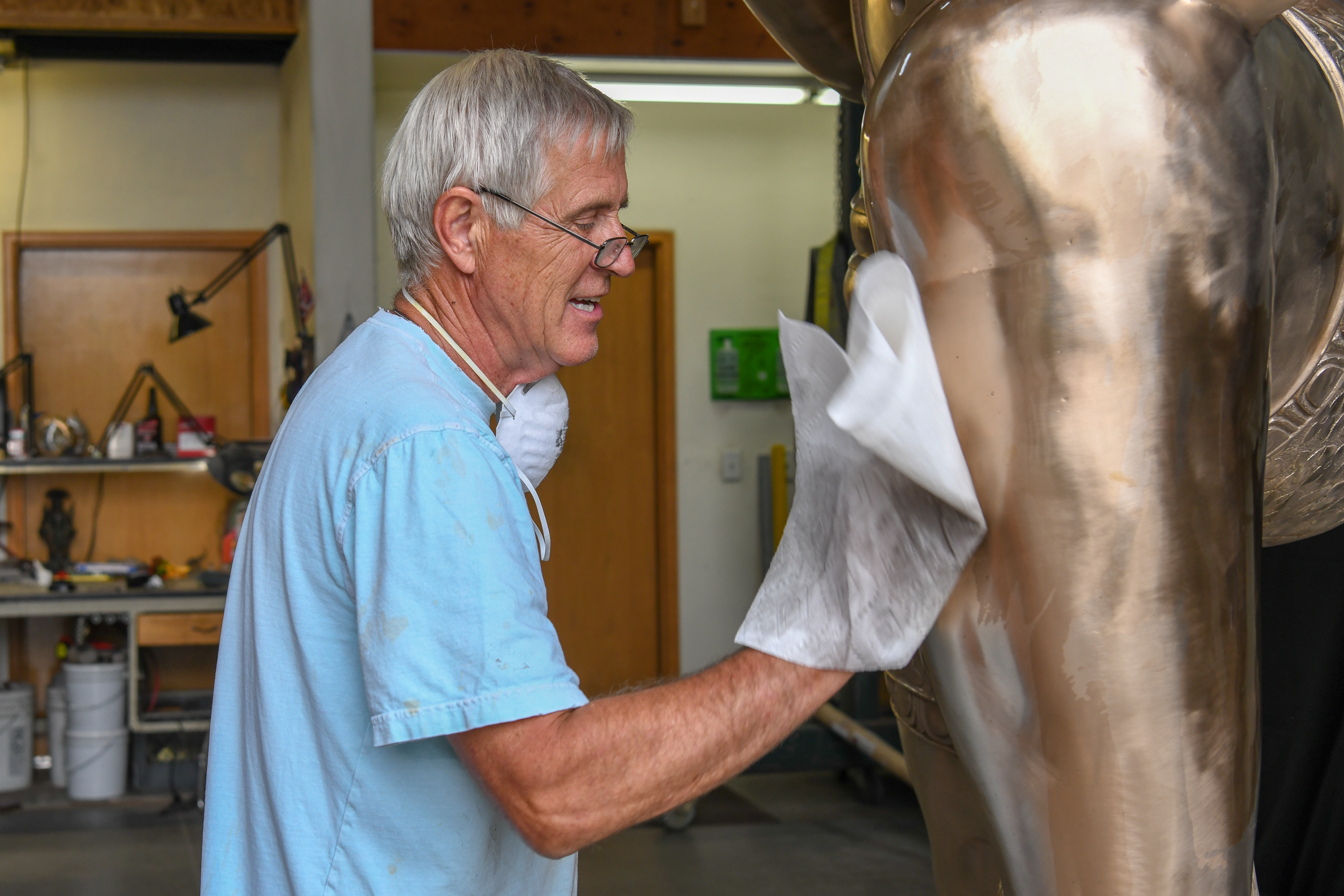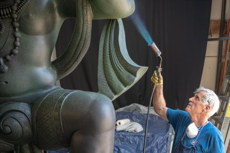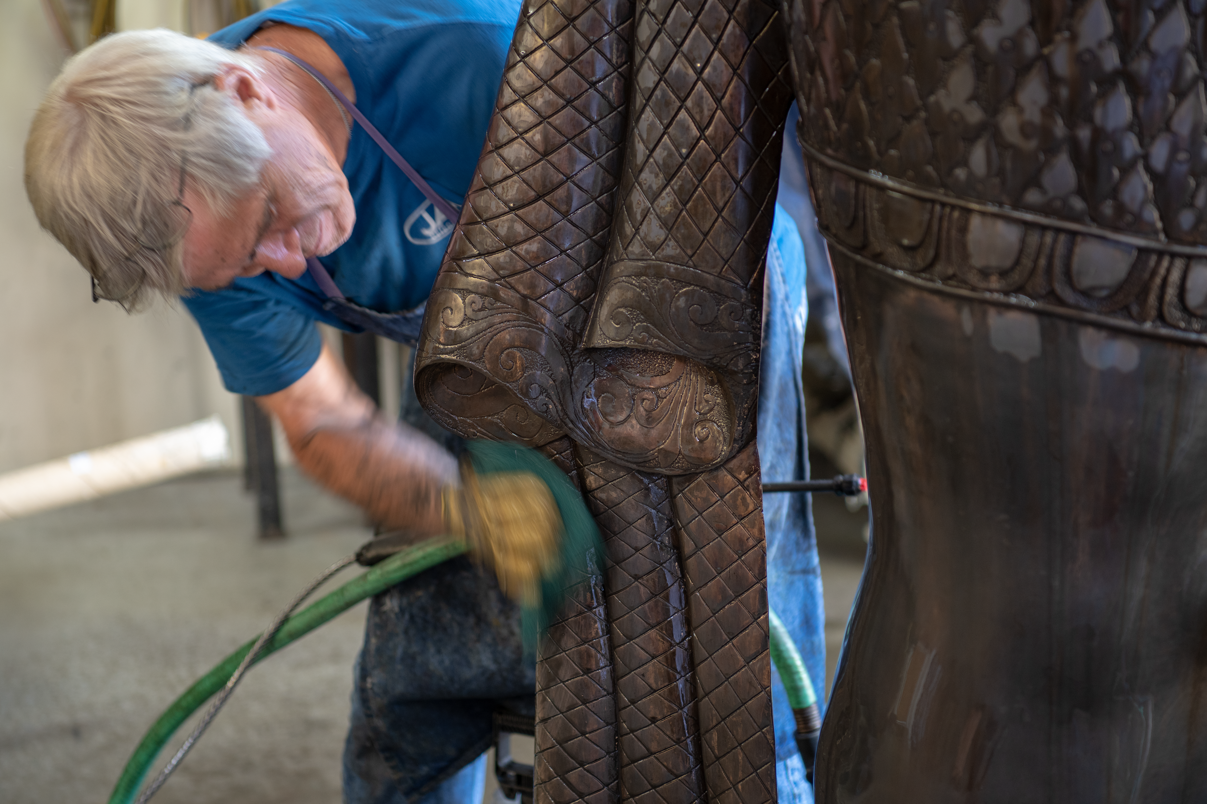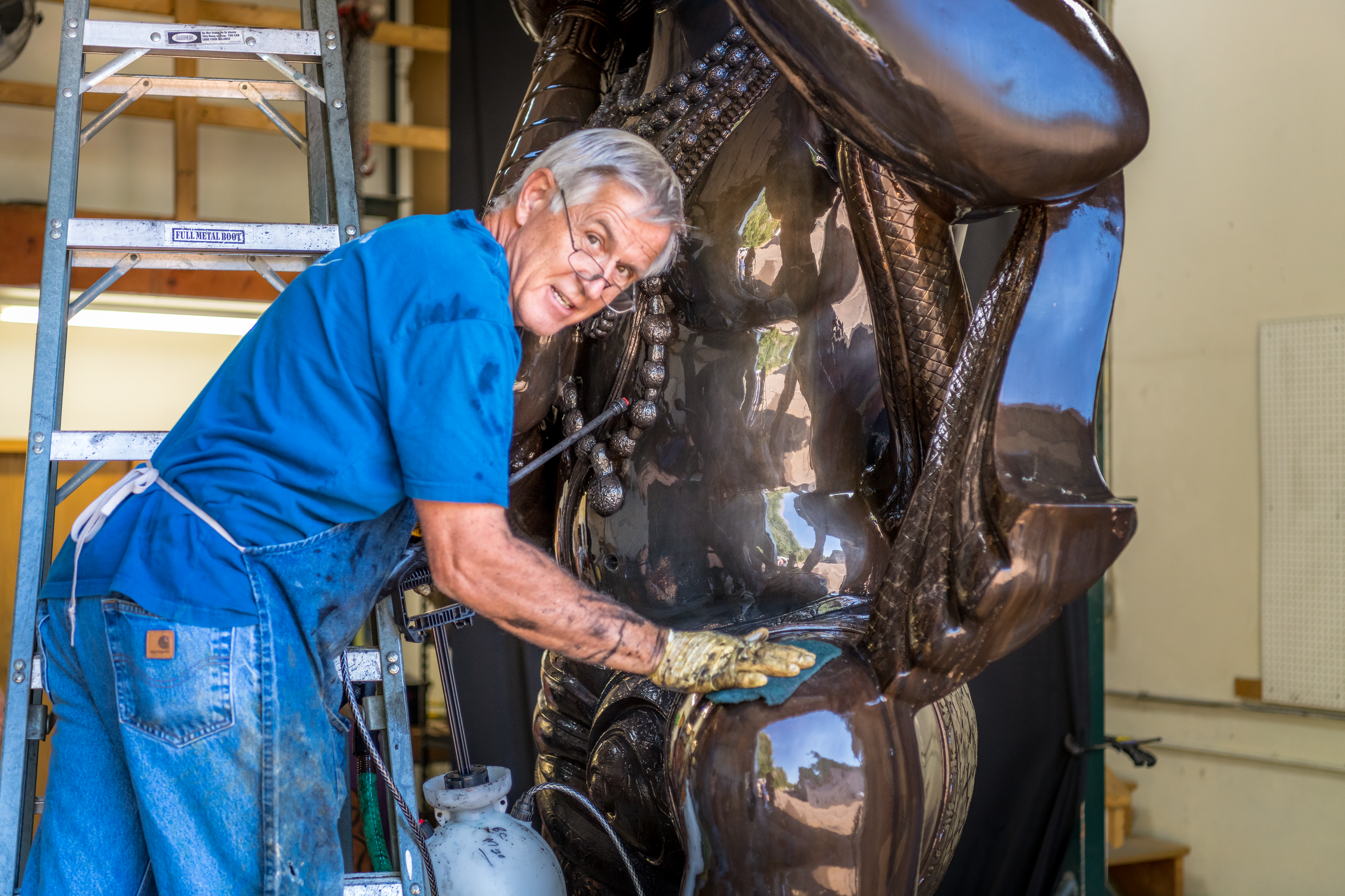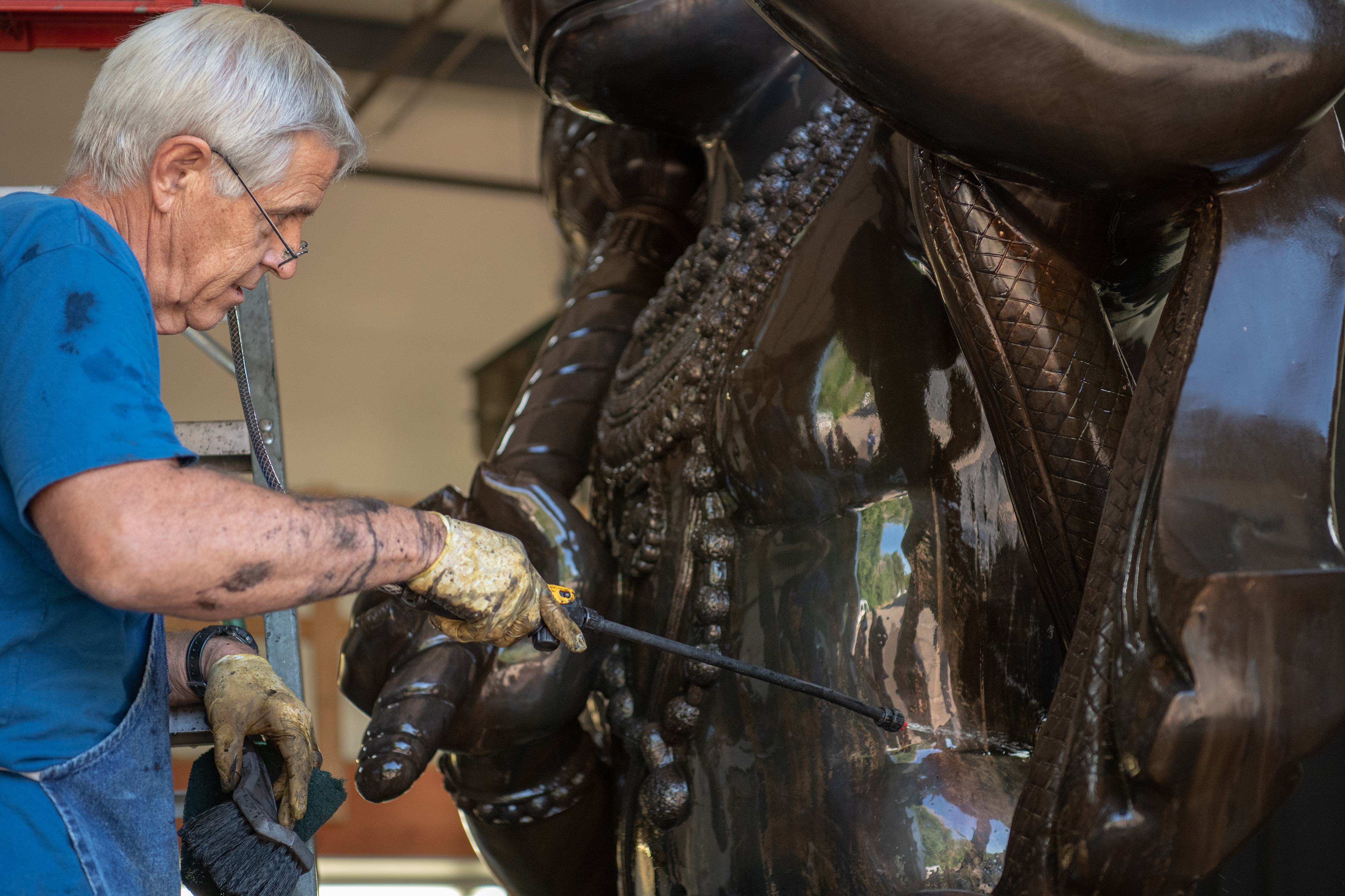 Patrick’s meticulous work enables copper within the bronze to accept the reactions of chemical compounds from his patina process.