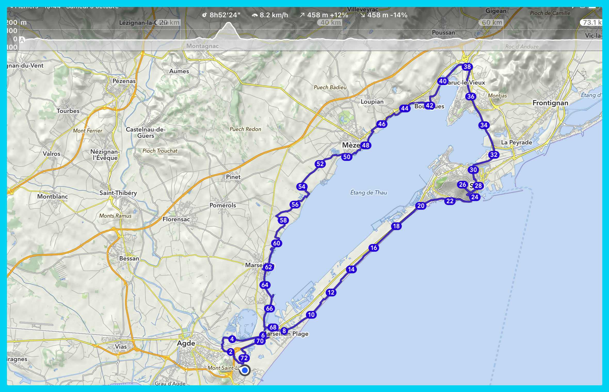 73,1 km, en passant par l’embouchure du canal du Midi.