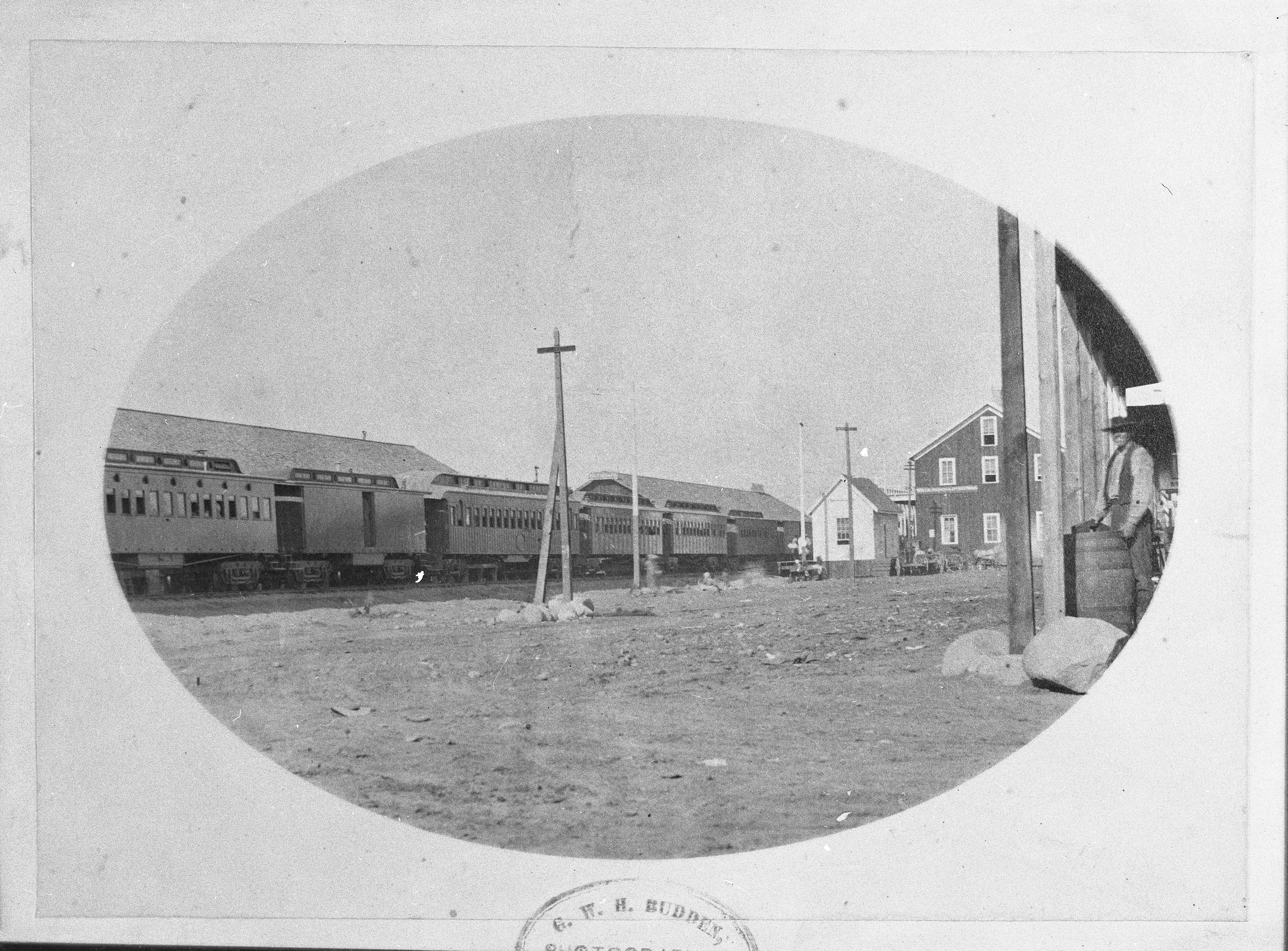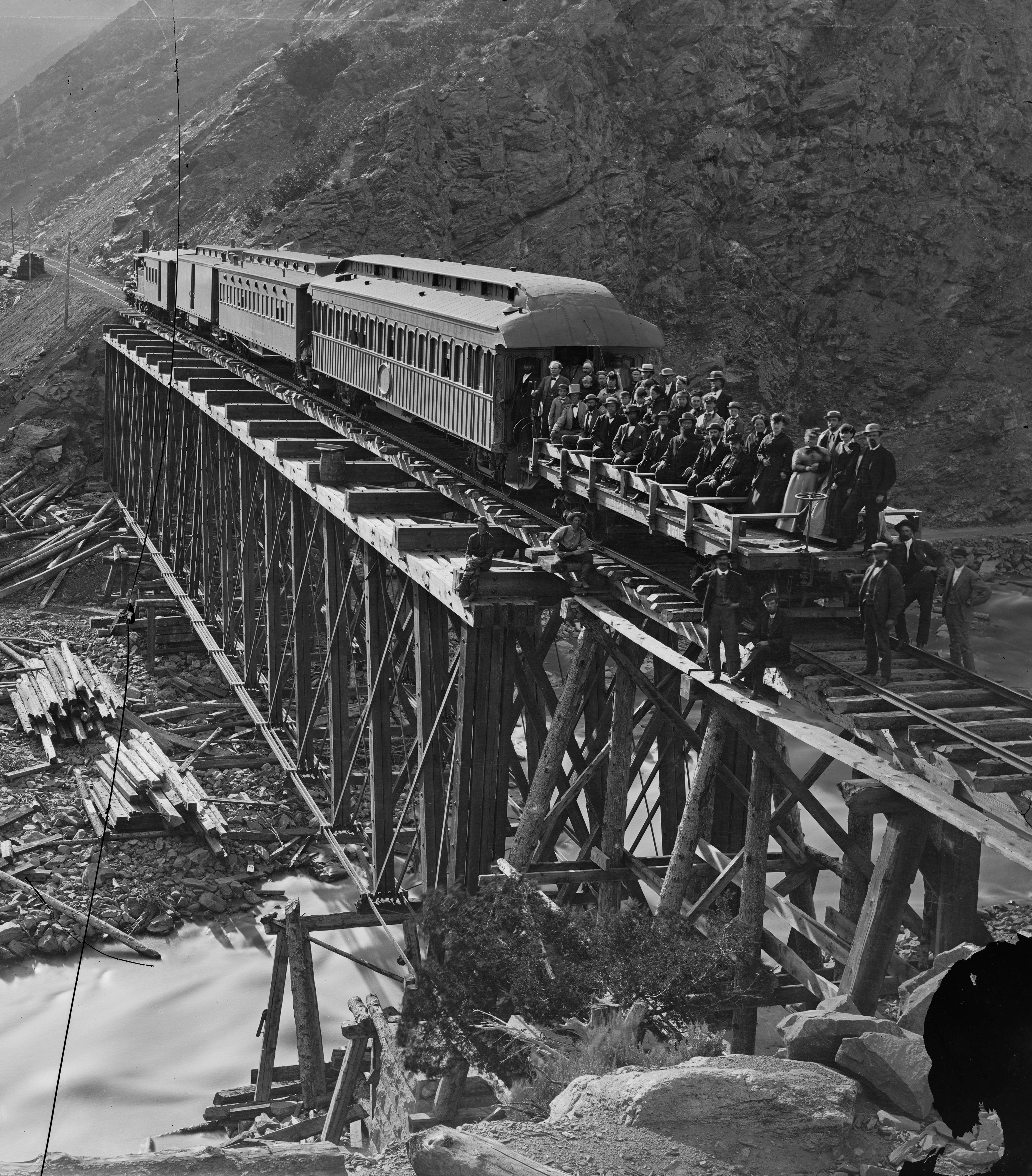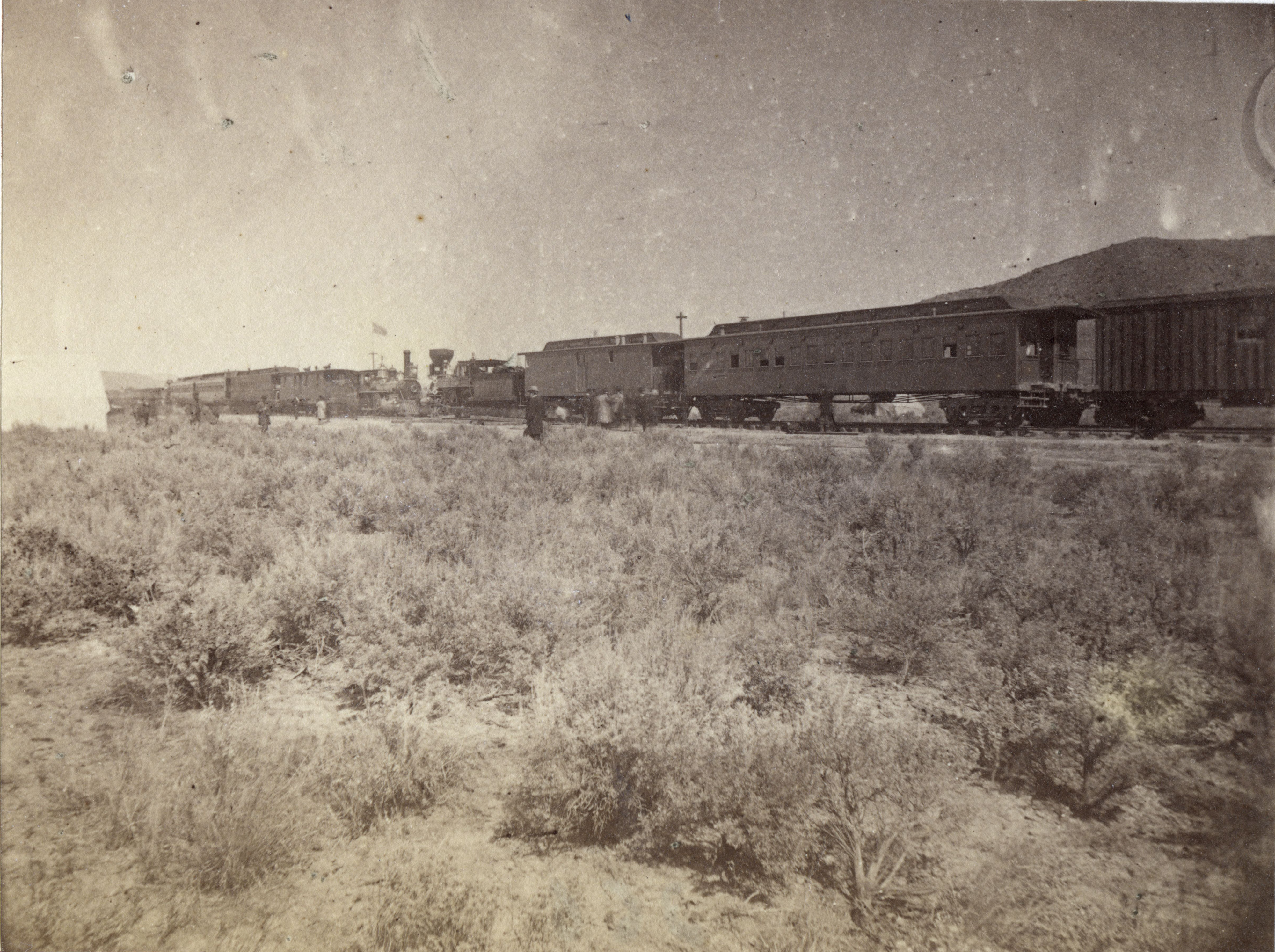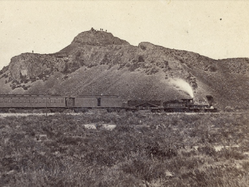 Antecedente: El vagón de Crocker es el tercero desde la derecha en esta fotografía de 1869 tomada en Devils Gate, Utah. Crocker fue a Ogden, Utah y luego regresó a Sacramento en este viaje. Cortesía del Museo Oakland de California.
