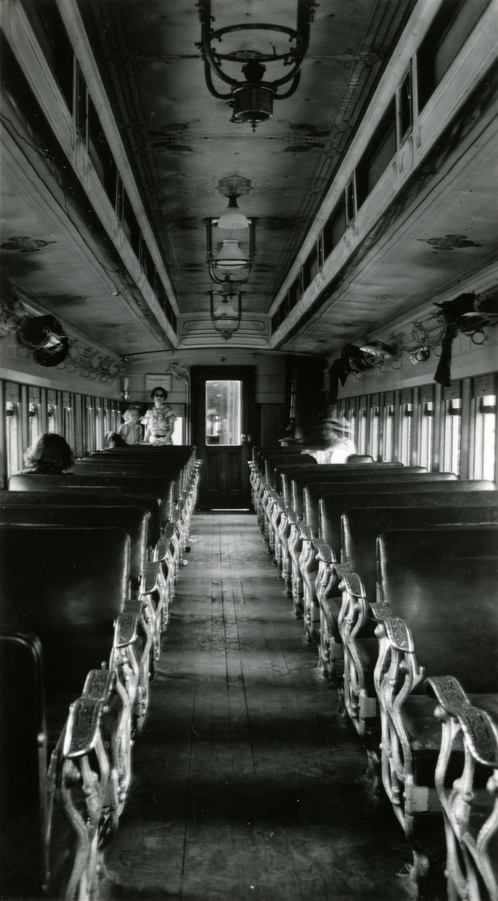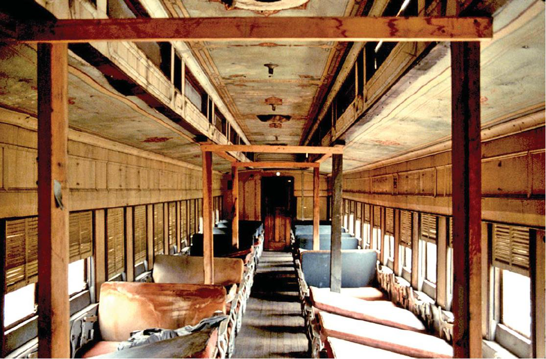 Izquierda: Interior del vagón 17 en Abril de 1938, tal como habría aparecido en el servicio Express. Museo del Ferrocarril del Estado de California.
