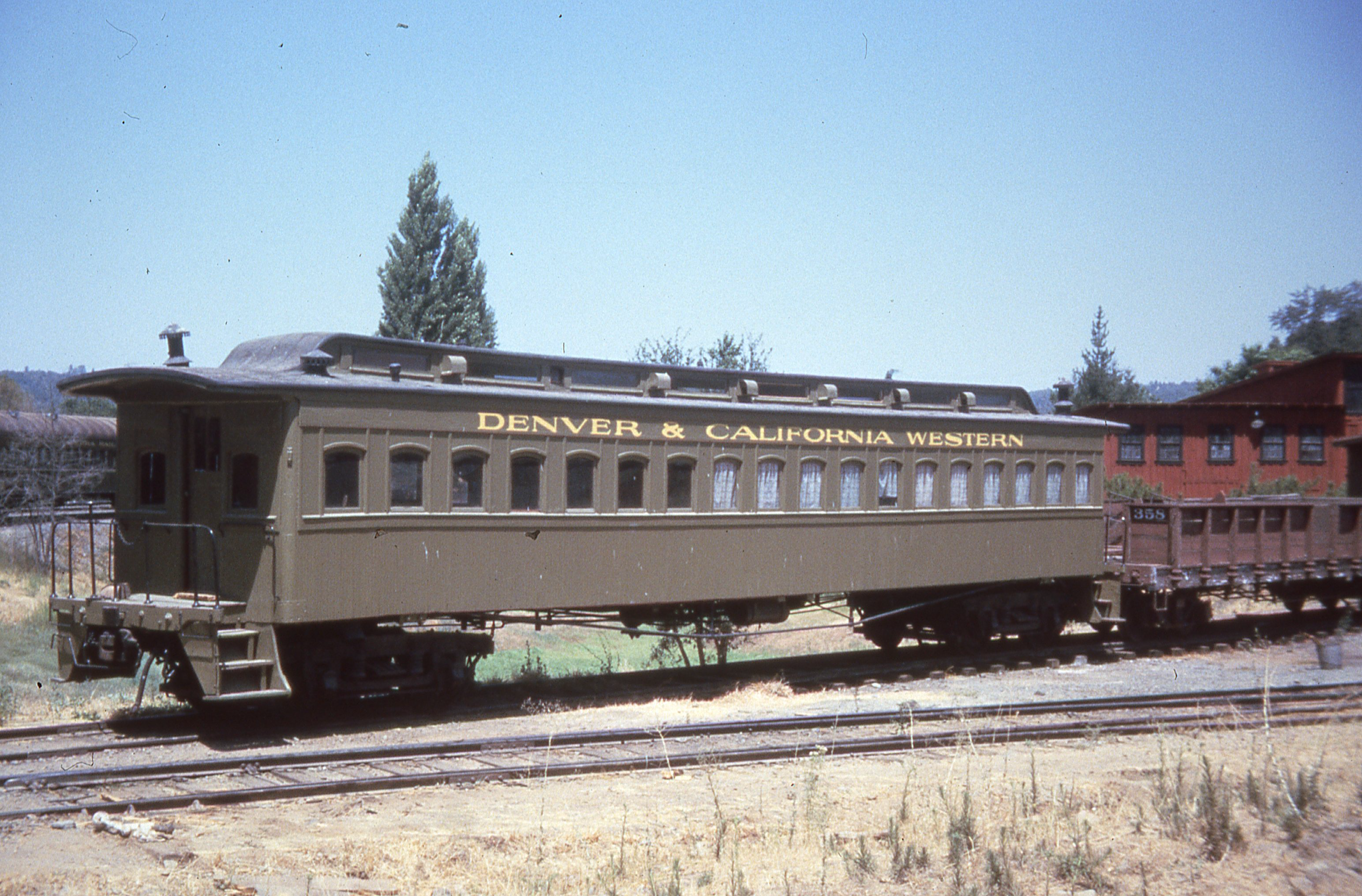 Antecedente: Short Line reemplazó y pintó el revestimiento de verde, y agregaron letras "Denver & California Western" para la segunda película de Kenny Roger's Gambler. Se ve aquí durante el rodaje en Jamestown, California, en 1983. Cortesía del Museo del Ferrocarril del Estado de Nevada.