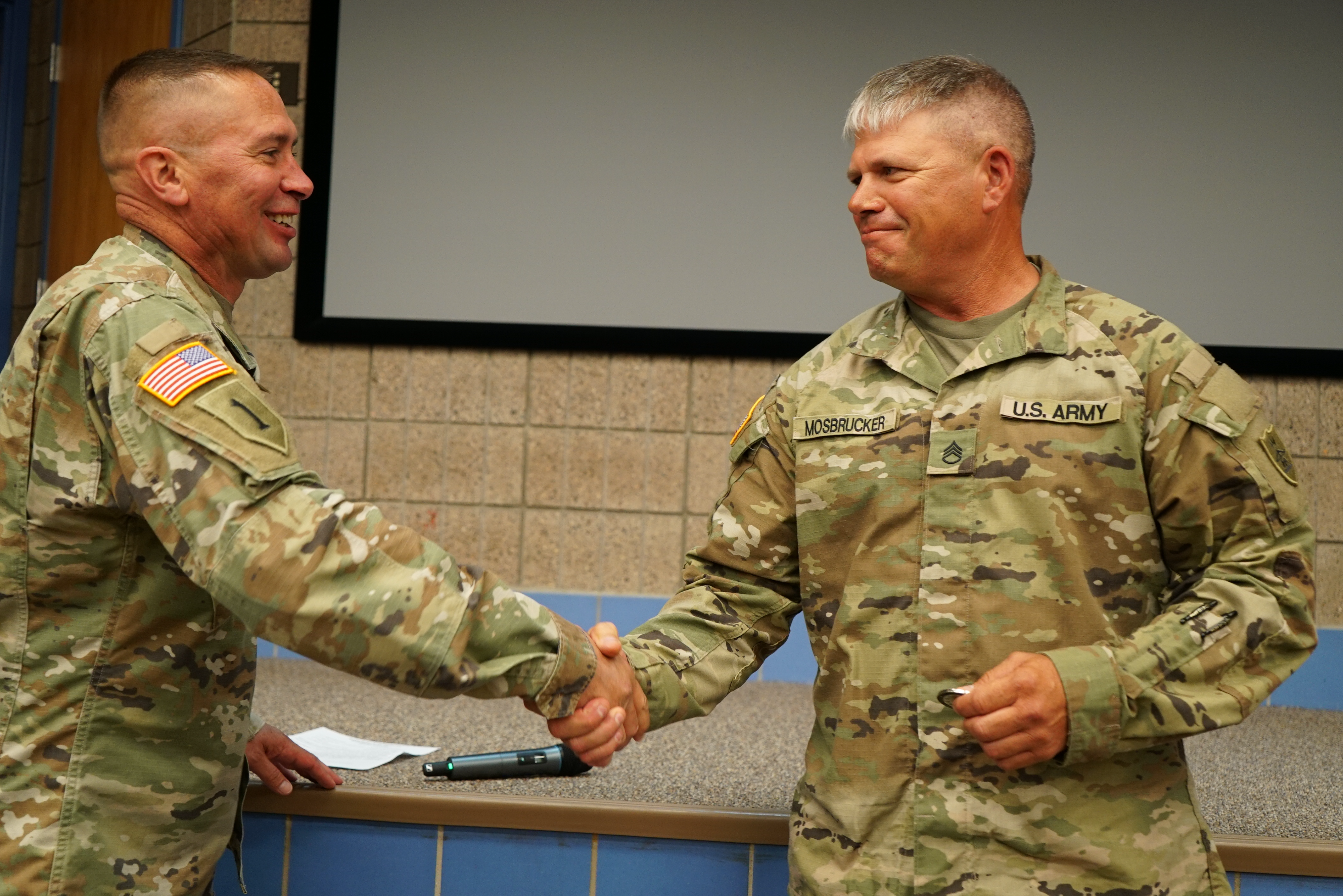 Command Sgt. Maj. Derek Heck, N.D. Army National Guard state command sergeant major presented Staff Sgt. Marty Mosbrucker, Joint Force Headquarters, a recognition coin, Raymond J. Bohn armory, Bismarck, N.D., July 13, 2022.