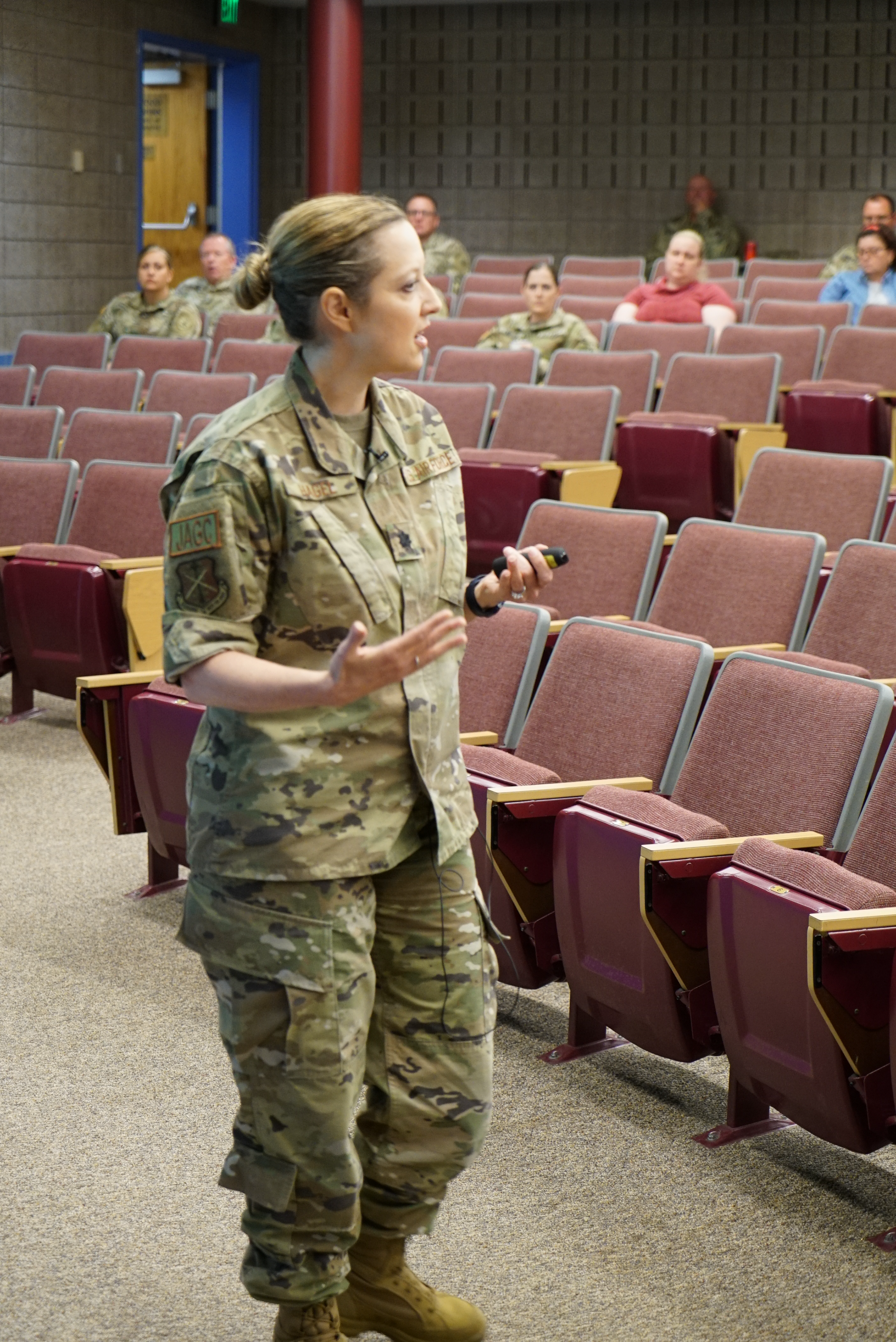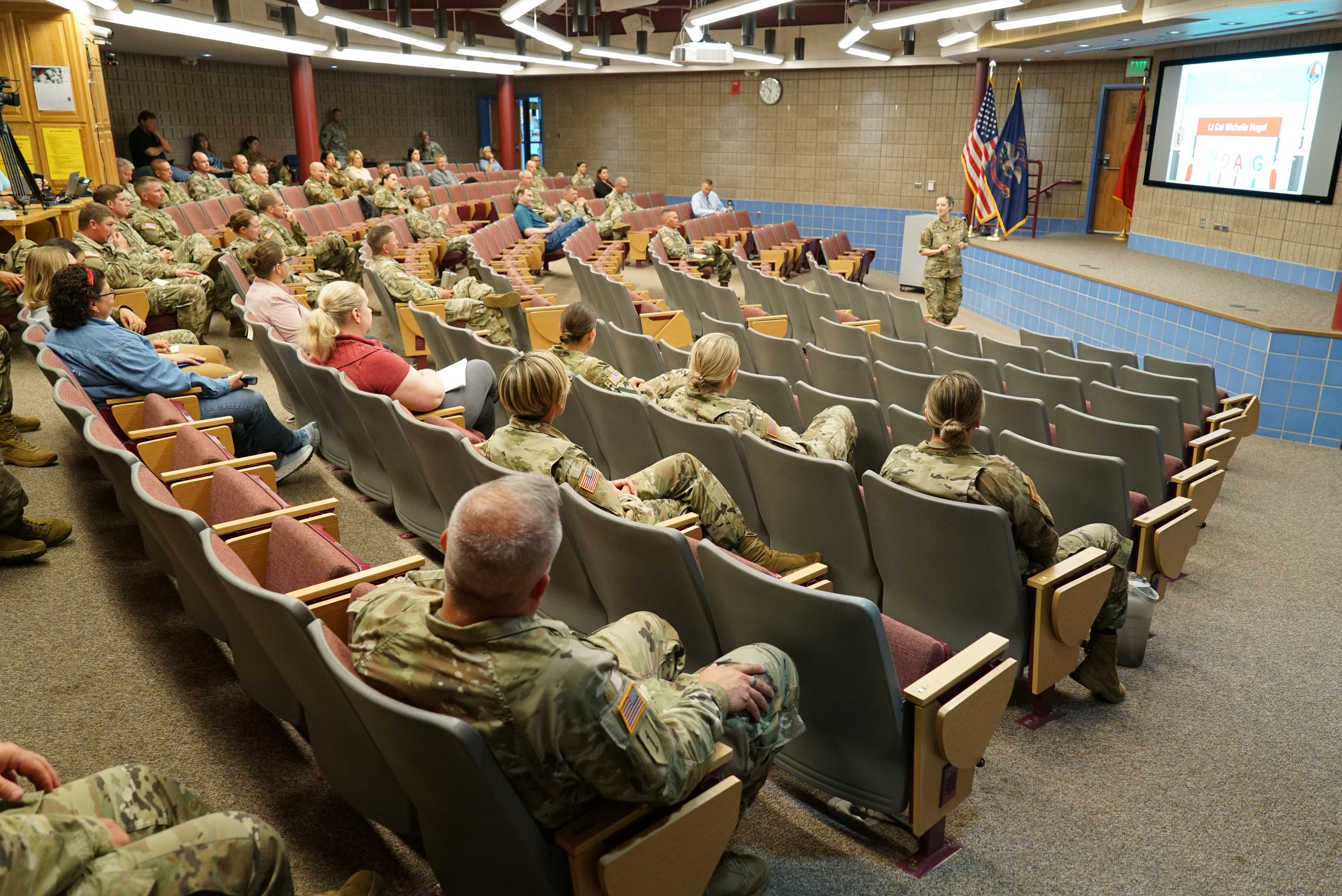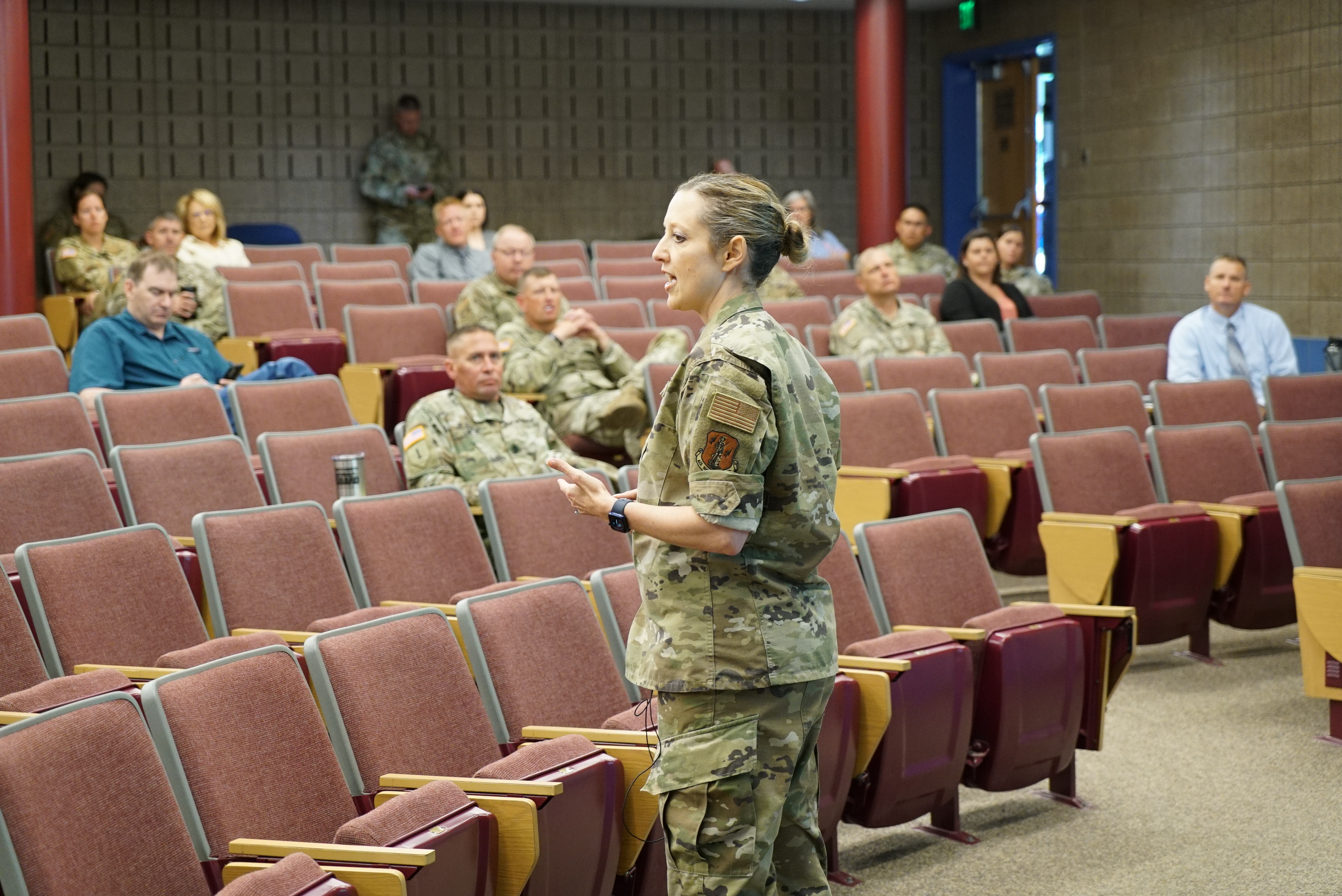 Lt. Col. Michelle Hagel, N.D. National Guard joint staff judge advocate, conducted this month's professional development at the Raymond J. Bohn armory, Bismarck, N.D., July 13, 2022. Her briefing was livestreamed state-wide to all N.D. National Guard full-time members. (National Guard story and photos by Sgt. 1st Class Charles Highland, N.D. National Guard Public Affairs Office)