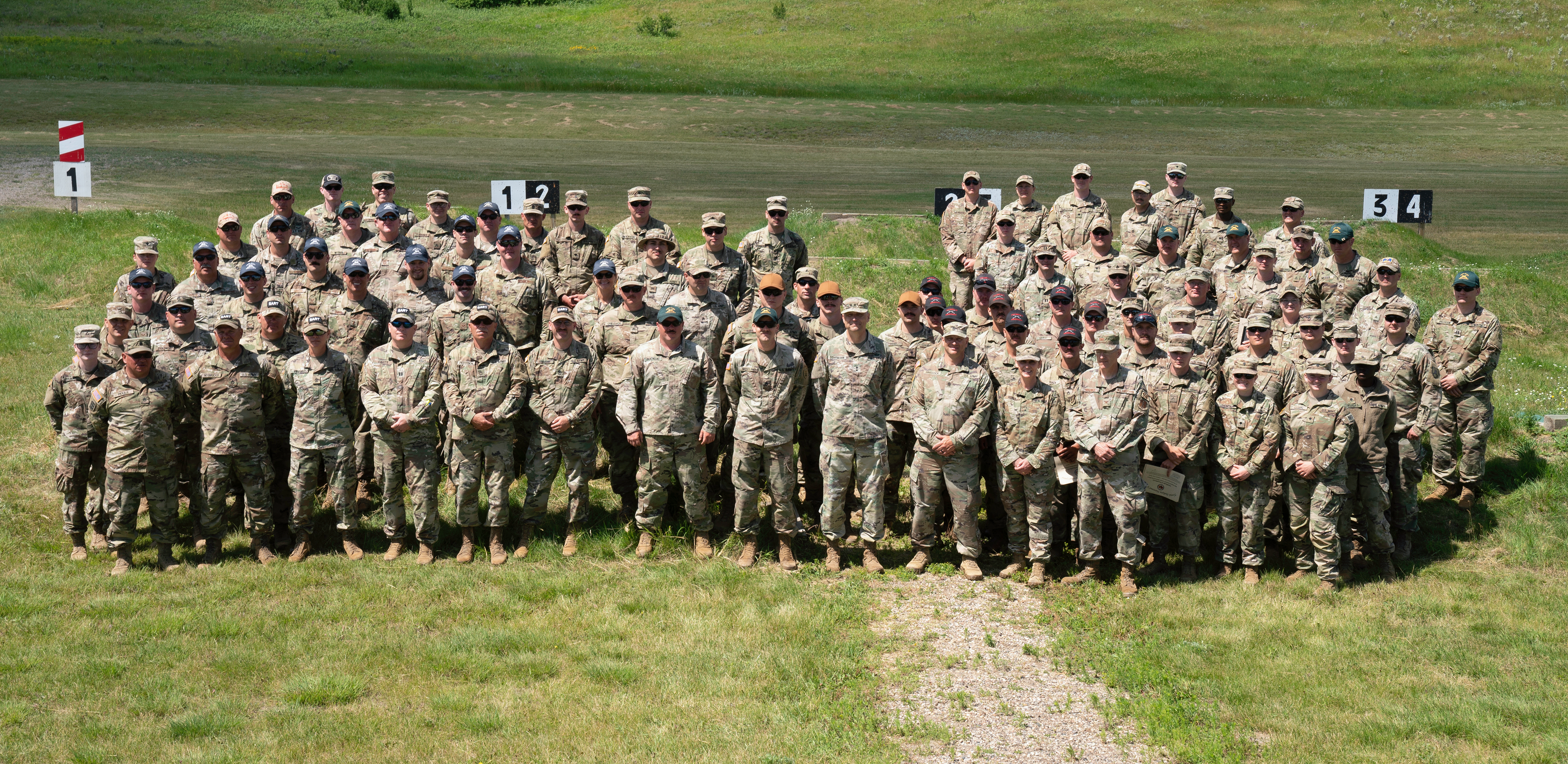 North Dakota National Guard Soldiers and Airmen participating in the annual Adjutant General’s Combat Marksmanship Match pose with senior N.D. National Guard leaders at the Camp Grafton Training Center firing complex, near McHenry, N.D., July 11, 2022. (National Guard photo by David Lipp, 119th Wing Public Affairs Office)