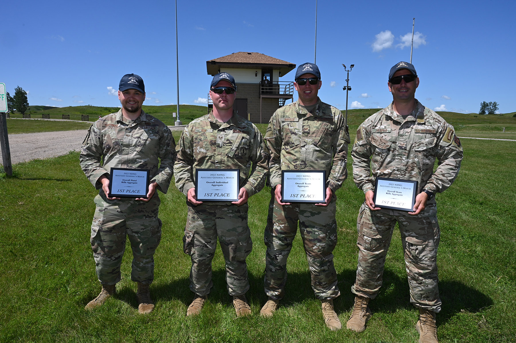 The 119th Wing Alpha team took first place at the N.D. National Guard annual Adjutant General’s Combat Marksmanship Match. From left, Staff Sgt. Hunter Martineau, Staff Sgt. Gavin Rook, Staff Sgt. Josh Renville and Staff Sgt. Matthew Jasper, Camp Grafton Training Center, N.D., July 11, 2022. (U.S. National Guard photo by David H. Lipp, 119th Wing Public Affairs Office)