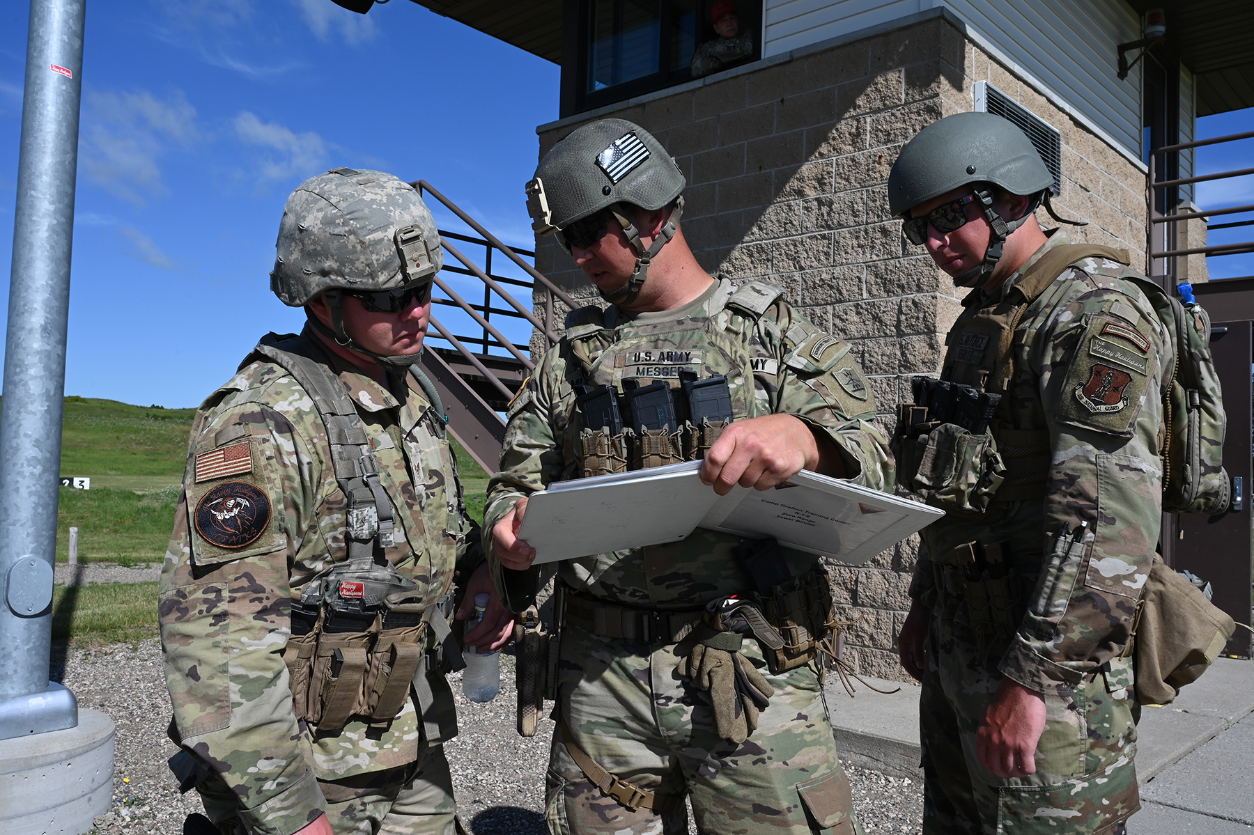 From left to right Staff Sgt. Gavin Rook, 119th Wing, Staff Sgt. Evan Messer, N.D. Army National Guard Recruiting and Retention Battalion, and Staff Sgt. Josh Renville, 119th Wing, discuss marksmanship during the annual N.D. National Guard Adjutant General’s Combat Marksmanship Match, Camp Grafton Training Center, N.D. July 11, 2022. (National Guard photo by David Lipp, 119th Wing Public Affairs Office)