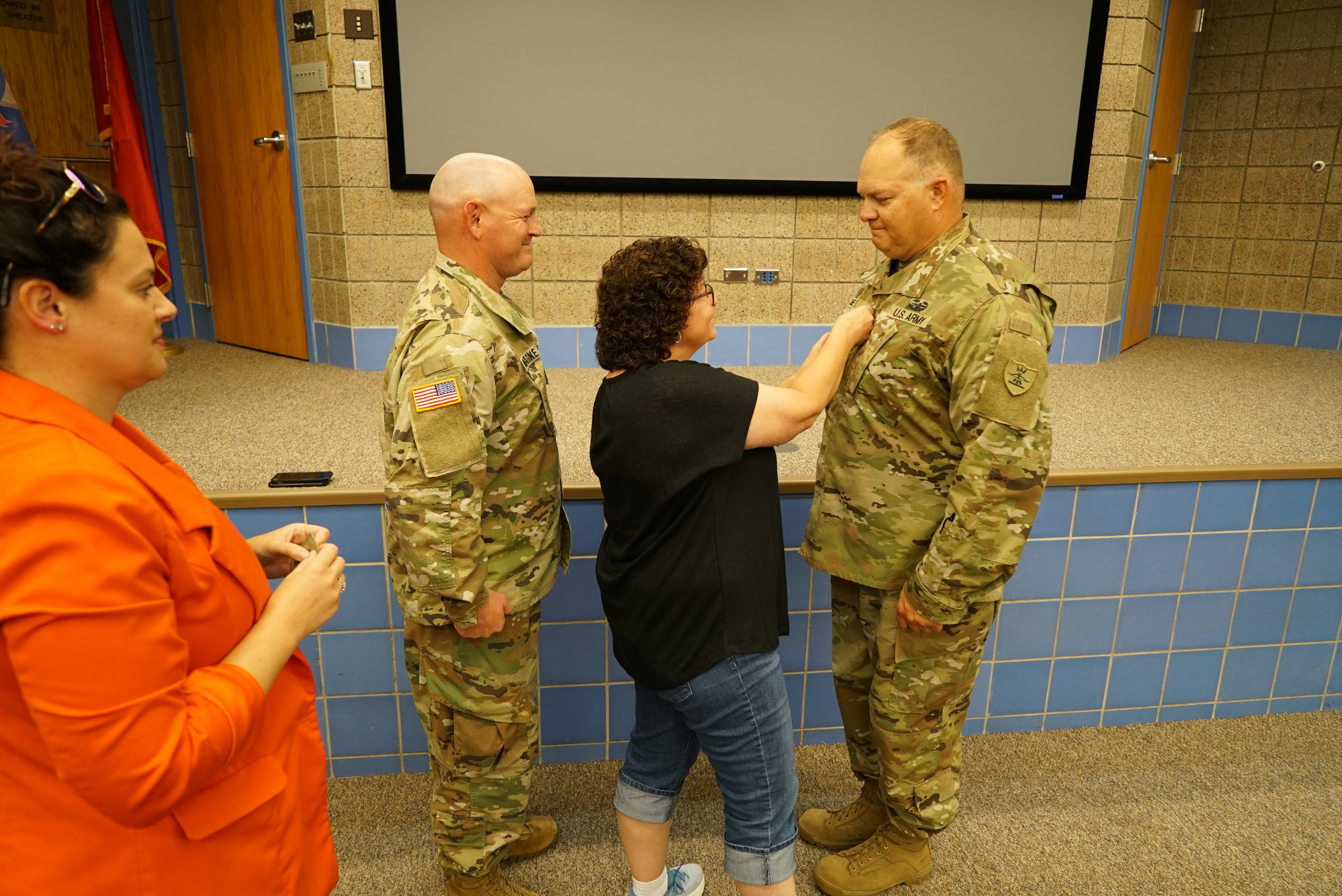 Chris Dietz, watches his wife Tanya affix the rank of first sergeant on his uniform at his promotion ceremony at the Raymond J. Bohn armory, Bismarck, N.D., July 14, 2022. At left is Maj. Mike Champagne, commander, N.D. National Guard Joint Force Headquarters, who presided over the promotion ceremony.