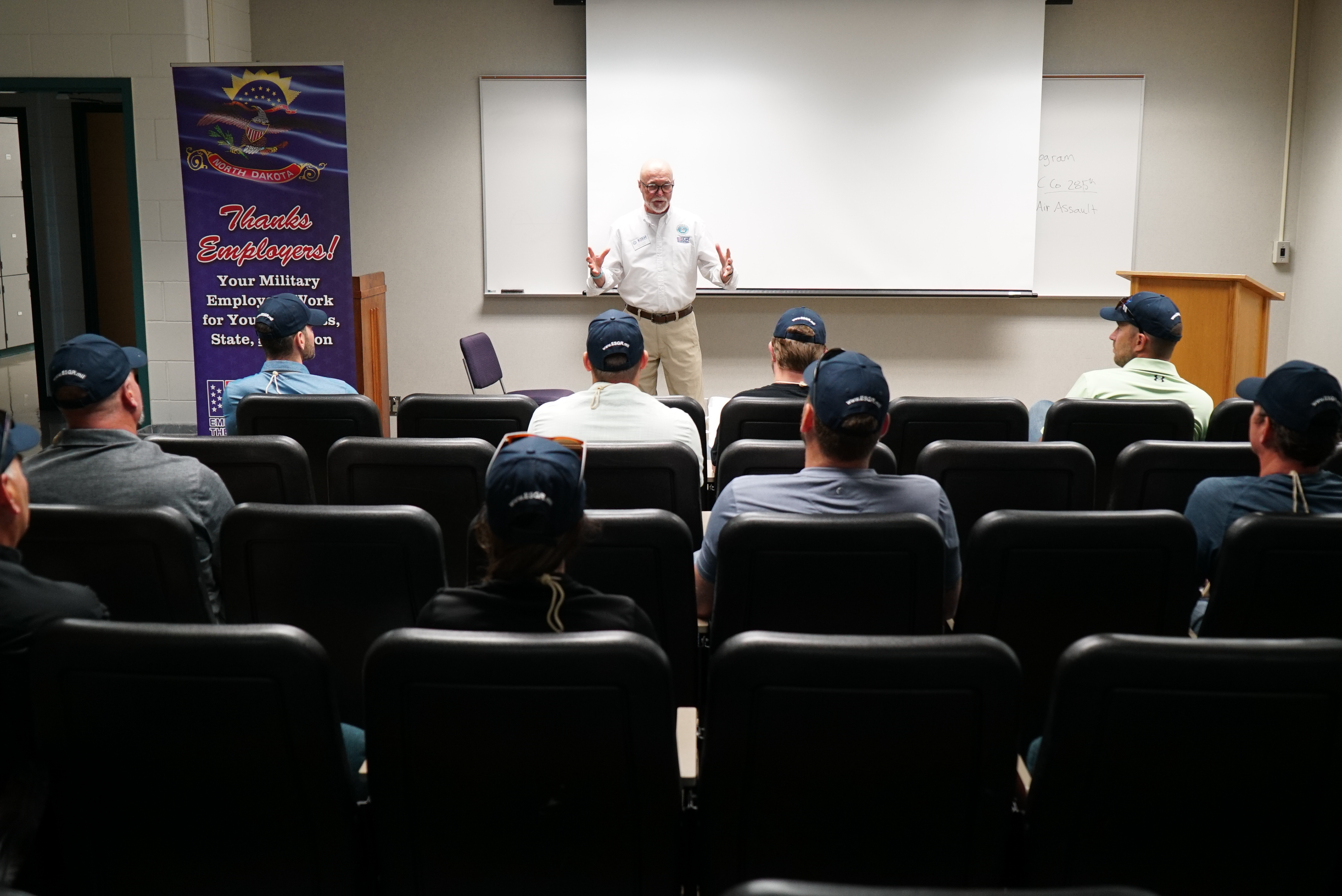Rob Keller, ESGR Volunteer, briefs ten employers on what the N.D. Employer Support of the Guard and Reserve (ESGR) can do to support the military service of National Guard and reserve component Soldiers, Airmen, and their families, N.D. National Guard Army Aviation Support Facility, Bismarck, July 8, 2022.