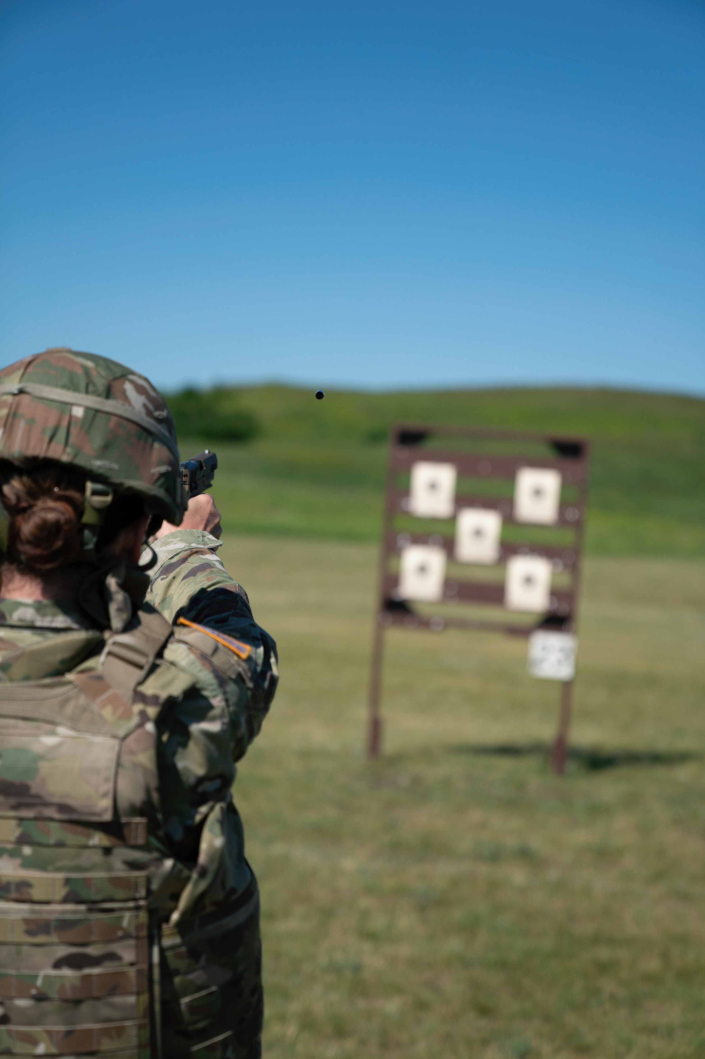 Maj. Gen. Al Dohrmann, N.D. adjutant general, aims a M17 Sig Sauer 9mm pistol at the Camp Grafton Training Center firing complex, near McHenry, N.D. during a distinguished visitor shooting portion at the annual N.D. National Guard Adjutant General’s Combat Marksmanship Match, July 11, 2022. (National Guard photos by Capt. Vanessa Lennick, N.D. National Guard Visual Information)