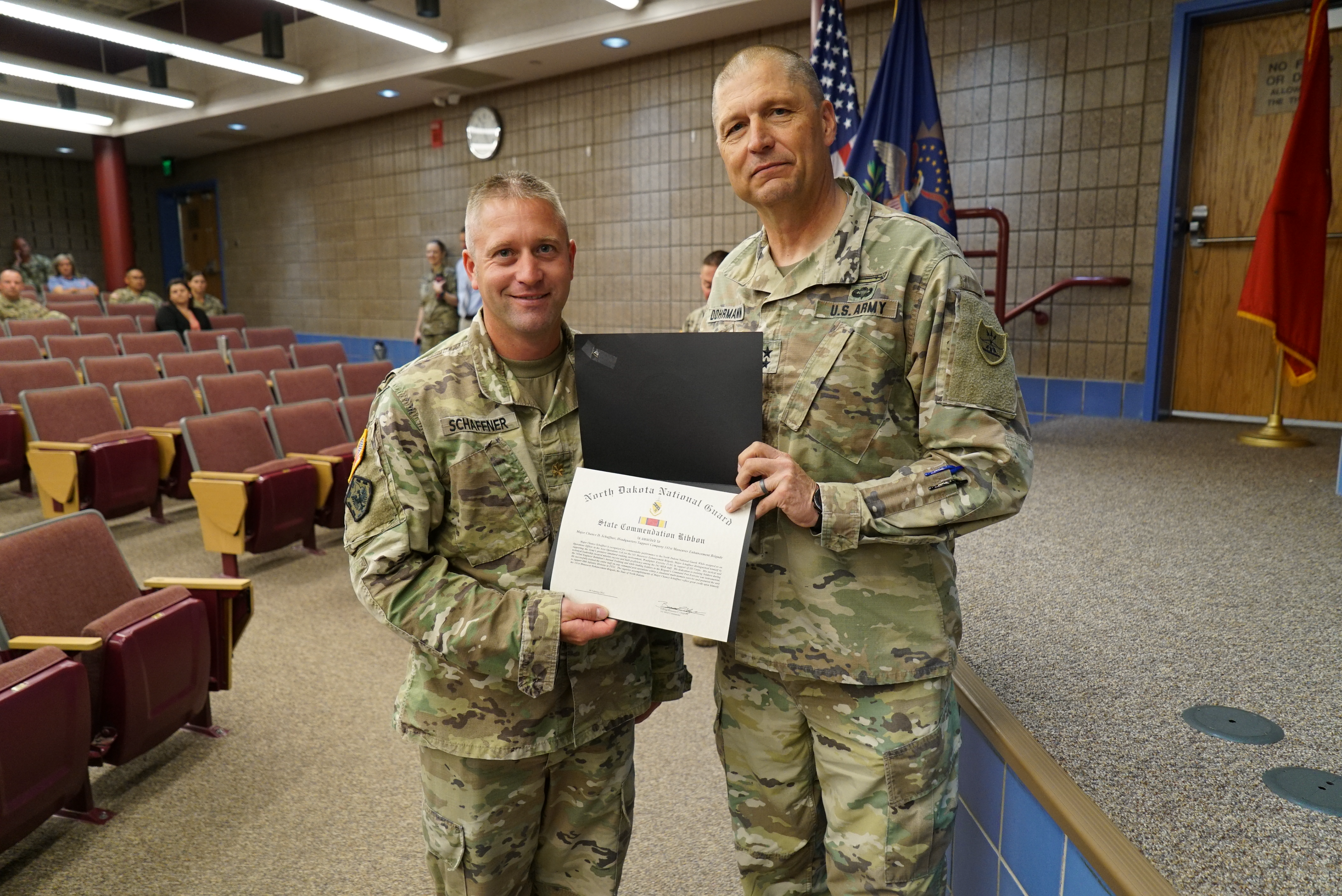 Maj. Gen. Al Dohrmann, N.D. adjutant general, right, awarded Maj. Chance Schaffner, 141st Maneuver Enhancement Brigade, the N.D. National Guard State Commendation Ribbon, Raymond J. Bohn armory, Bismarck, N.D. July 13, 2022.