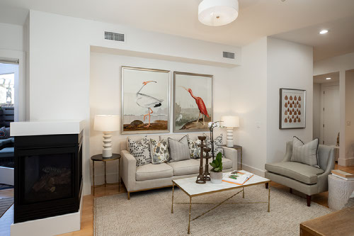 - Elegant living room highlighted by a soothing gas fireplace, recessed lighting, and beautiful hardwood floor