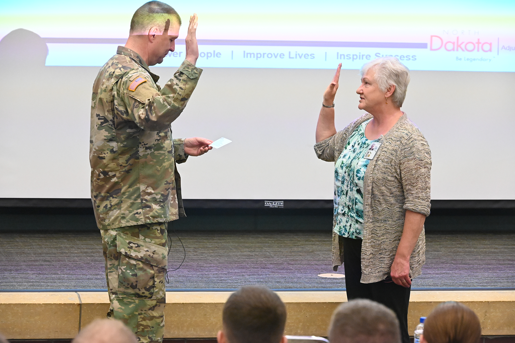 Last Tuesday, Maj. Gen. Al Dohrmann, adjutant general, hosted a townhall and full-time employee appreciation event at the Fargo Armed Forces Reserve Center. Both N.D. Army and Air uniformed and civilian employees attended to hear Dohrmann and other senior leaders provide updates on the activities of our organization. The event was streamed live across the state for other N.D. Guard members and employees. Before closing, Dohrmann responded to questions from those present and those submitted by text. After the townhall, attendees were treated to a free lunch served by senior leaders. Top photo: Maj. Gen. Al Dohrmann renders remarks at a townhall at the Fargo Armed Forces Reserve Center Oct. 8.