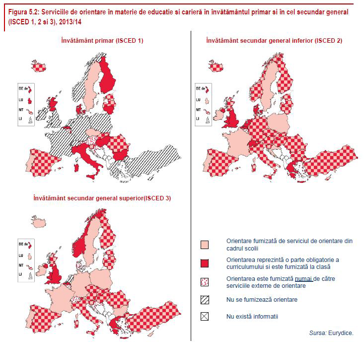 Țările europene raportează că promovează o abordare generală a orientării în materie de educație și carieră, combinând diferite forme de servicii și utilizând o gamă largă de metode individuale și de grup. Scolile din majoritatea țărilor furnizează orientarea prin intermediul activităților extra-curriculare, în cooperare cu parteneri locali, precum serviciile externe de orientare și angajatorii.