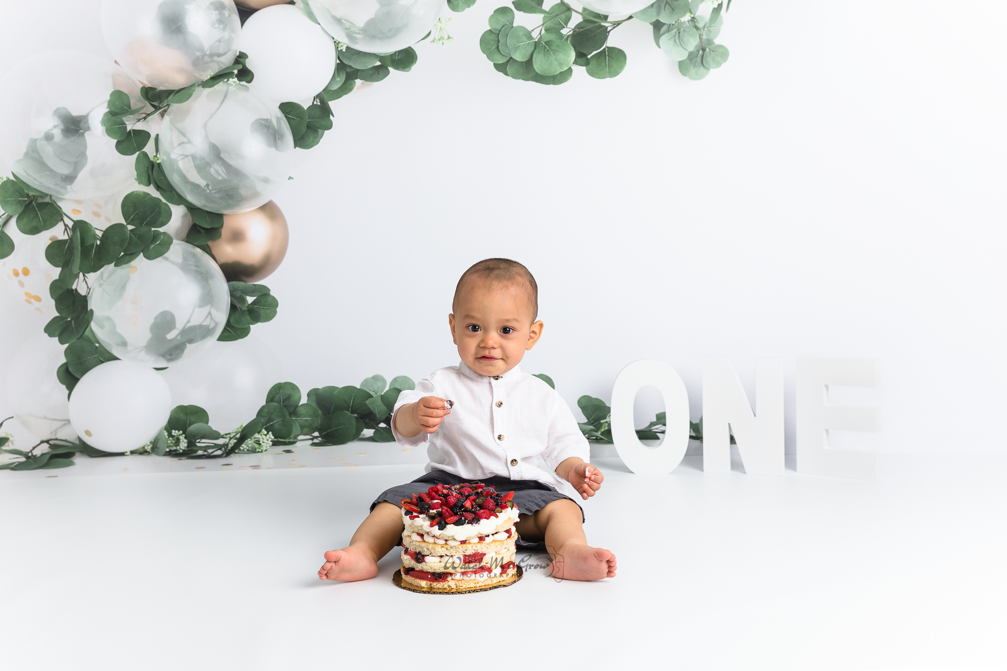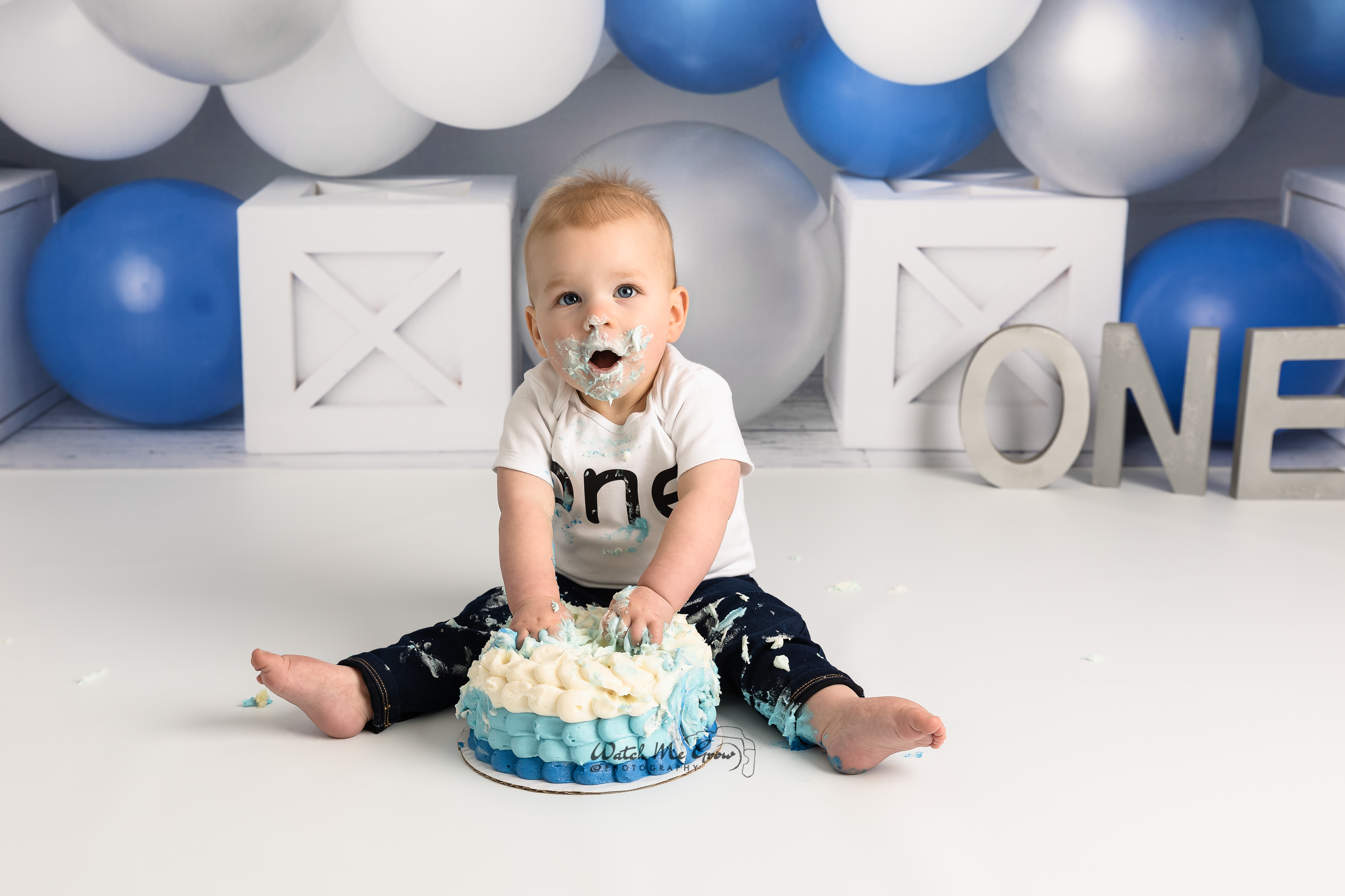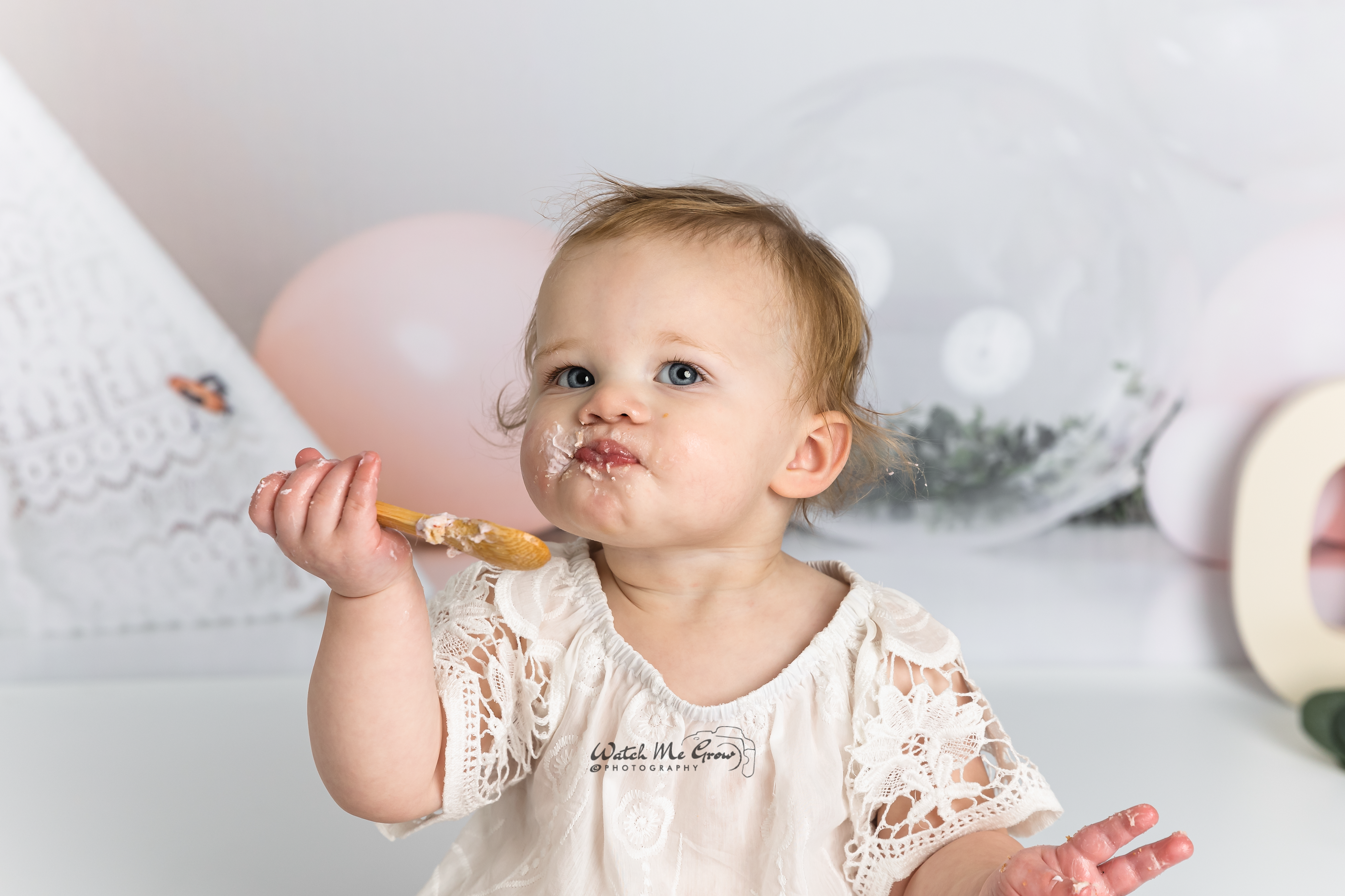 I typically start with a couple portrait images without the cake. Then we move onto the cake / food (and outfit change if needed). Once the cake is put in front of them there will be a few mins of .... "is this ALL for me?" .... "I can actually eat it ALL of it?!" .... "what is this?" looks. Keep in mind 80% of babies are not interested in the cake. This can be anything from the texture, the sweetness of the frosting, or just simply not in the mood. I aim to capture as many fun memories as possible in this part - even if they are not interested in the cake.