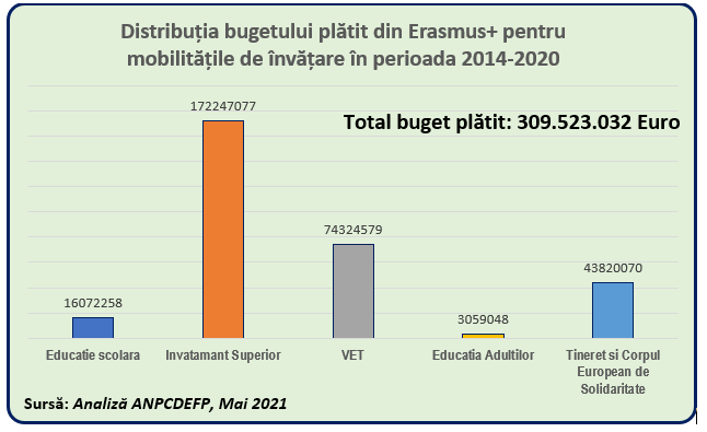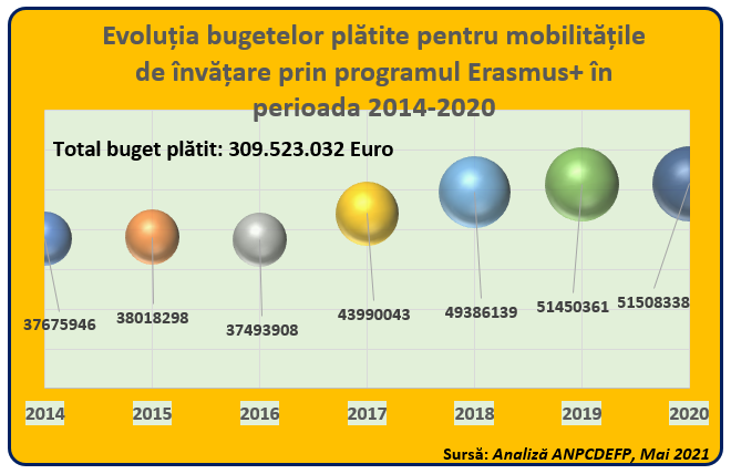 În ceea ce privește repartiția pe cei șapte ani ai programării 2014-2020, se poate observa în Figura C că, de la an la an, bugetele au crescut, cu excepția anului 2016. La finalul acestei perioade, în 2020, s-au plătit pentru mobilitățile de învățare cu 13.832.391 Euro mai mult decât în 2014. Această evoluție ascendentă se datorează creșterii numărului de proiecte de bună calitate care au fost depuse și aprobate pentru finanțare, dar și încrederii beneficiarilor în avantajele și importanța acestui tip de proiecte.