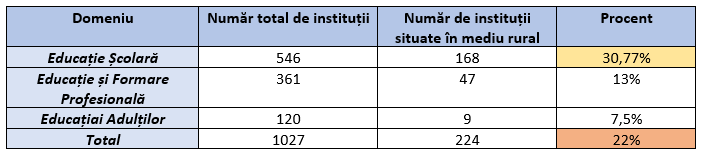 Se pot trage două concluzii foarte importante. În primul rând, ținta globală de 15% de instituții beneficiare din mediul rural a fost depășită cu 7 puncte procentuale (Figura F). În al doilea rând, tința specifică de 22% pentru domeniul Educației Școlare a fost și ea depășită cu mai mult de 8 puncte procentuale. Acest succes se datorează fără îndoială eforturilor depuse de personalul agenției, dar și de rețele sale de inspectori județeni responsabili cu proiectele educaționale europene, de formatori și de multiplicatori. Acțiunile concertate ale tuturor au făcut posibilă aducerea mai aproape de instituțiile și organizațiile interesate de educație și formare, inclusiv a celor din mediul rural, a informației despre oportunitățile și beneficiile pe care programul Erasmus+ le propune și le poate aduce prin proiecte de mobilități pentru învățare.