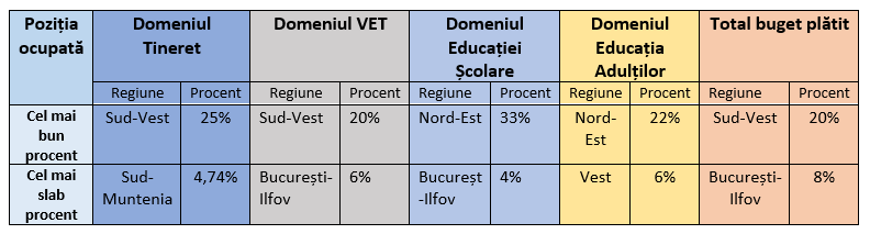 În domeniul Educației Școlare de pildă, regiunea Nord-Est este ”campioană”, ceea ce corespunde nevoilor regiunii de a investi masiv în învățământul preuniversitar. Regiunea se situează, din păcate, tot pe primul loc între cele 8 regiuni de dezvoltare atunci când se ia în calcul precaritatea economică a populației, iar cel puțin unul dintre cele șase județe, repectiv județul Bacău, se situa pe locul trei in ”topul” județelor care înregistrează un risc ridicat de părăsire timpurie a școlii (conform Strategiei privind reducerea părăsirii timpurii a școlii 2015-2020). O analiză similară se poate face și pentru domeniul Educației și Formării Profesionale, unde primul loc la absorbția finanțării pentru mobilități de învățare este ocupat de Regiunea de Sud-Vest, cu un procent de 20%. Acestă preocupare pentru atragerea de proiecte de mobilitate în acest domeniu se corelează foarte bine cu faptul că Regiunea de Sud-Vest are cel mai mic număr de ateliere școlare pentru învățământul profesional (INS, SCL108C - Ateliere școlare pe niveluri de educație, macroregiuni, regiuni de dezvoltare și județe, 2016-2019).