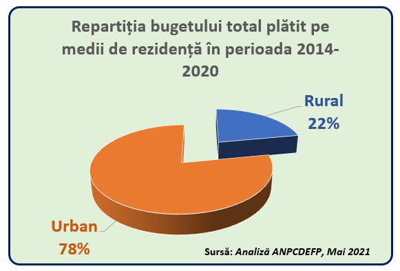 În ceea ce privește repartiția fondurilor alocate pe medii de rezidență, analiza a luat în considerare proiectele aprobate în domeniul Educației Școlare, Educației și Formării Profesionale și Educației Adulților deoarece acestea au fost domeniile vizate în 2014, când ANPCDEFP și-a stabilit prin programul de lucru o tință de 15% pentru procentul personalului din instituțiile care își desfășoară activitatea în mediul rural și care au implementat proiecte de mobilități de învățare. Mai mult decât atât, în 2020, ANPCDEFP a stabilit și o țintă specifică pentru domeniul Educație Școlară, respectiv cel puțin 22% instituții din mediul rural (cei doi indicatori fac referință la personalul beneficiar de mobilități, însă acesta e asociat cu instituția de trimitere și cu mediul de rezidență al acesteia atunci când se calculează gradul de absorbție pentru mediul rural.).