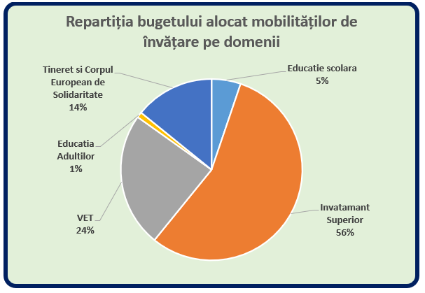 Domeniul Învățământului Superior a absorbit 56% din totalul bugetului alocat pentru mobilități de învățare, în timp ce cel mai mic de procent, de doar 1%, s-a îndreptat către Educația Adulților (Figura B).