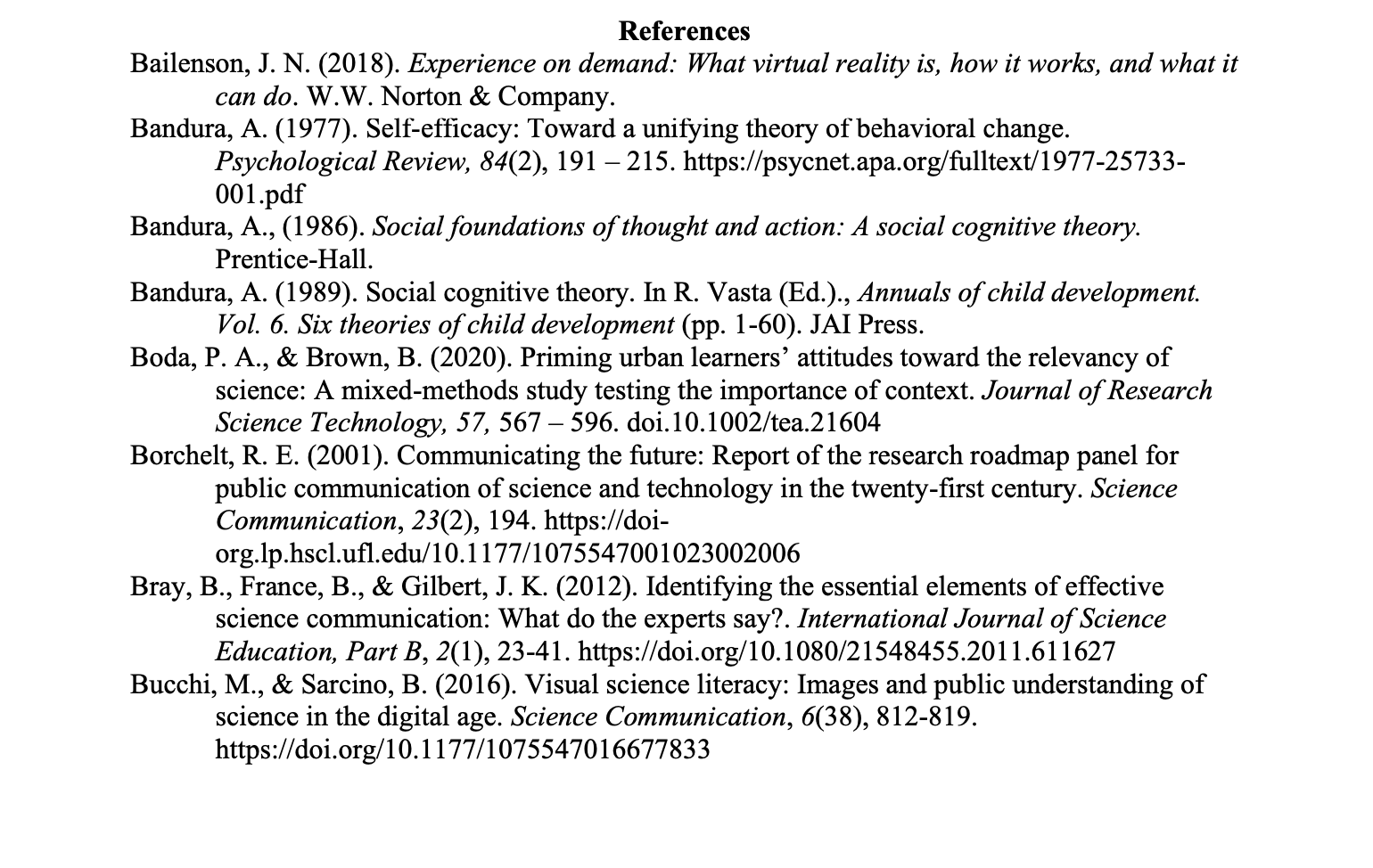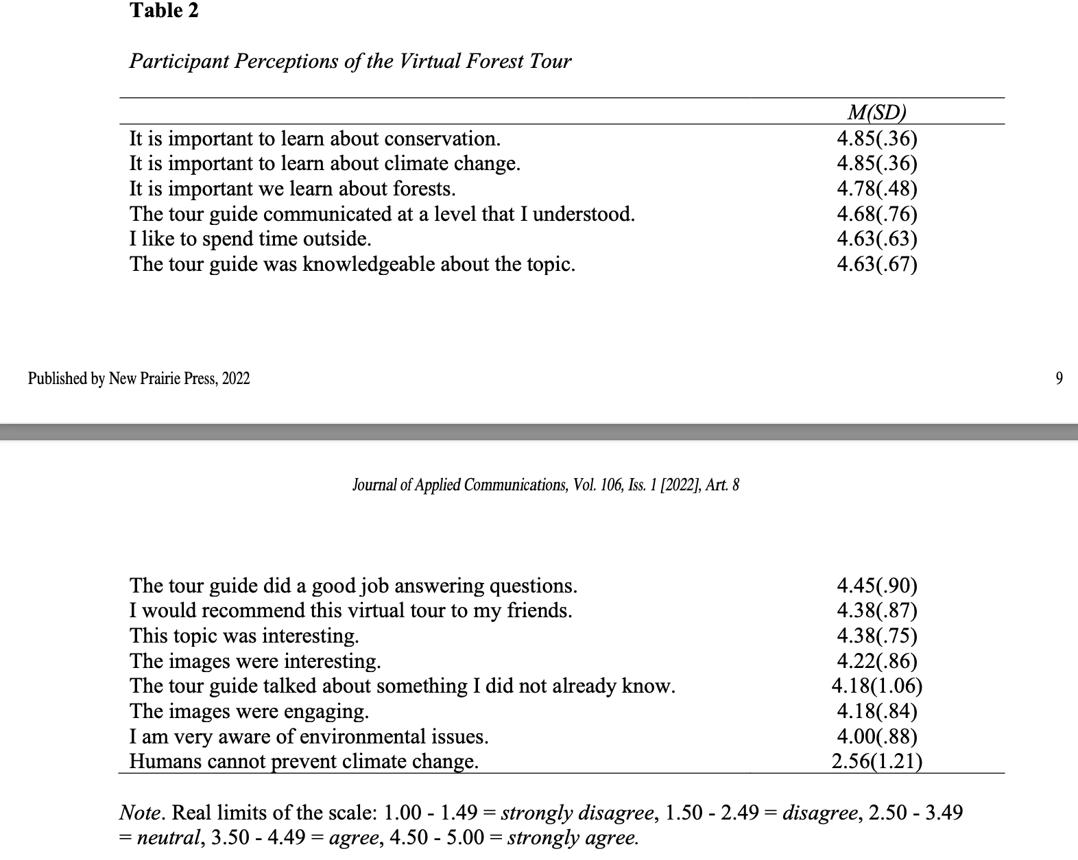 Students increased their self-efficacy when communicating science to public audiences and displayed their own observational learning while working with various audiences and environmental education.Increasing students’ self-efficacy in communicating science is vital since the next generation of science communicators should learn how to explore contentious scientific topics with various public audiences (Bray et al., 2012). The public audiences felt climate change and forest conservation were important but did not agree or disagree that humans could prevent climate change. They also indicated their knowledge increased about VR, and they would likely recommend it to their friends. The quantitative and qualitative data converged to suggest that many participants retained content from tours. However, they blended previous knowledge of environmental conservation behaviors into their VR tour learning, such as not littering. Additionally, the participants discussed their perceived ability, or self-efficacy, to conserve forests as a communal activity, not from their individual behaviors.