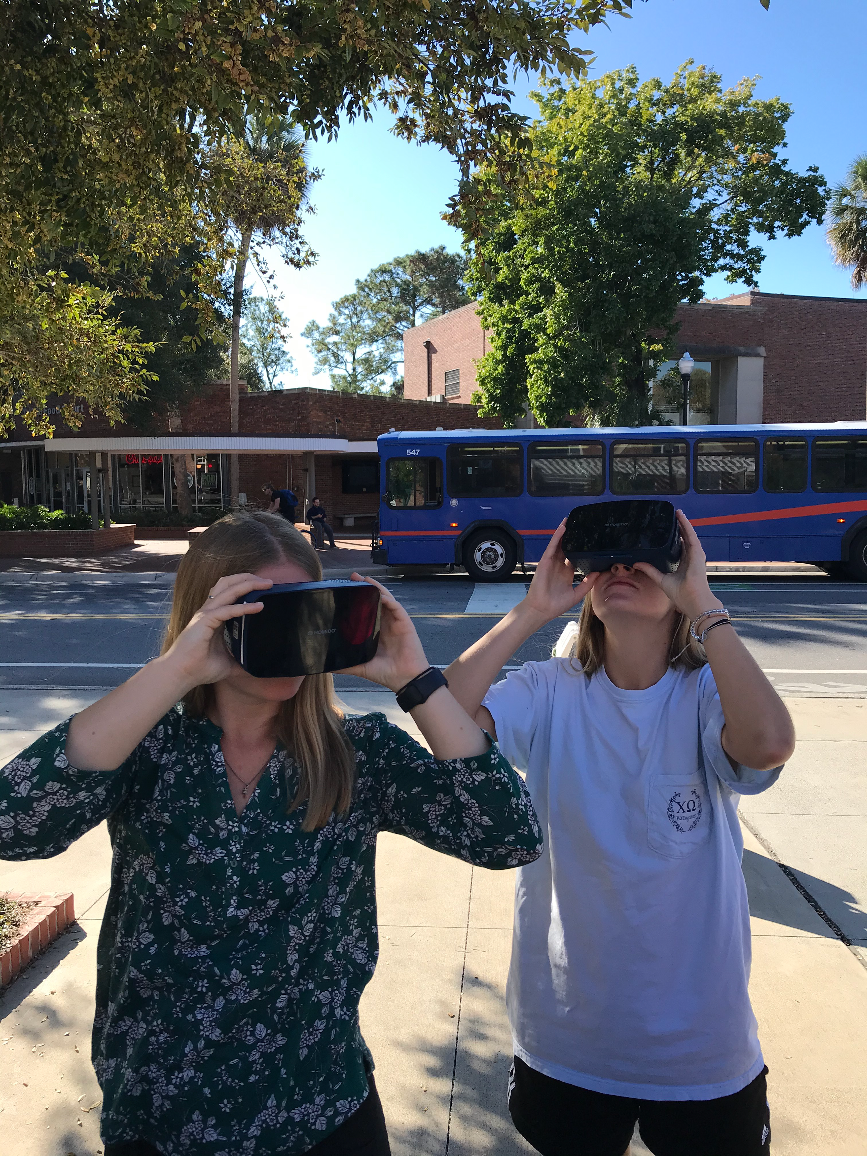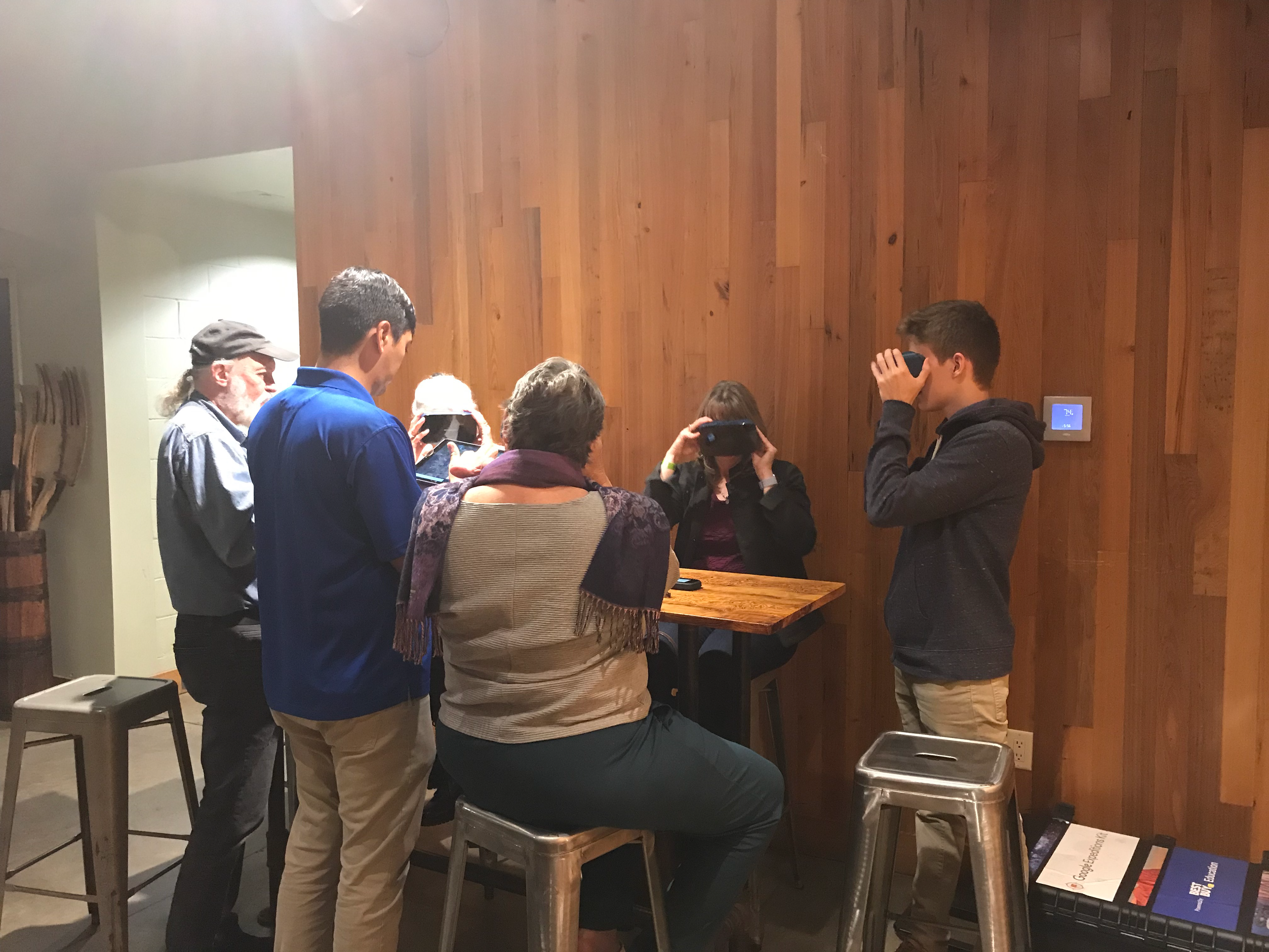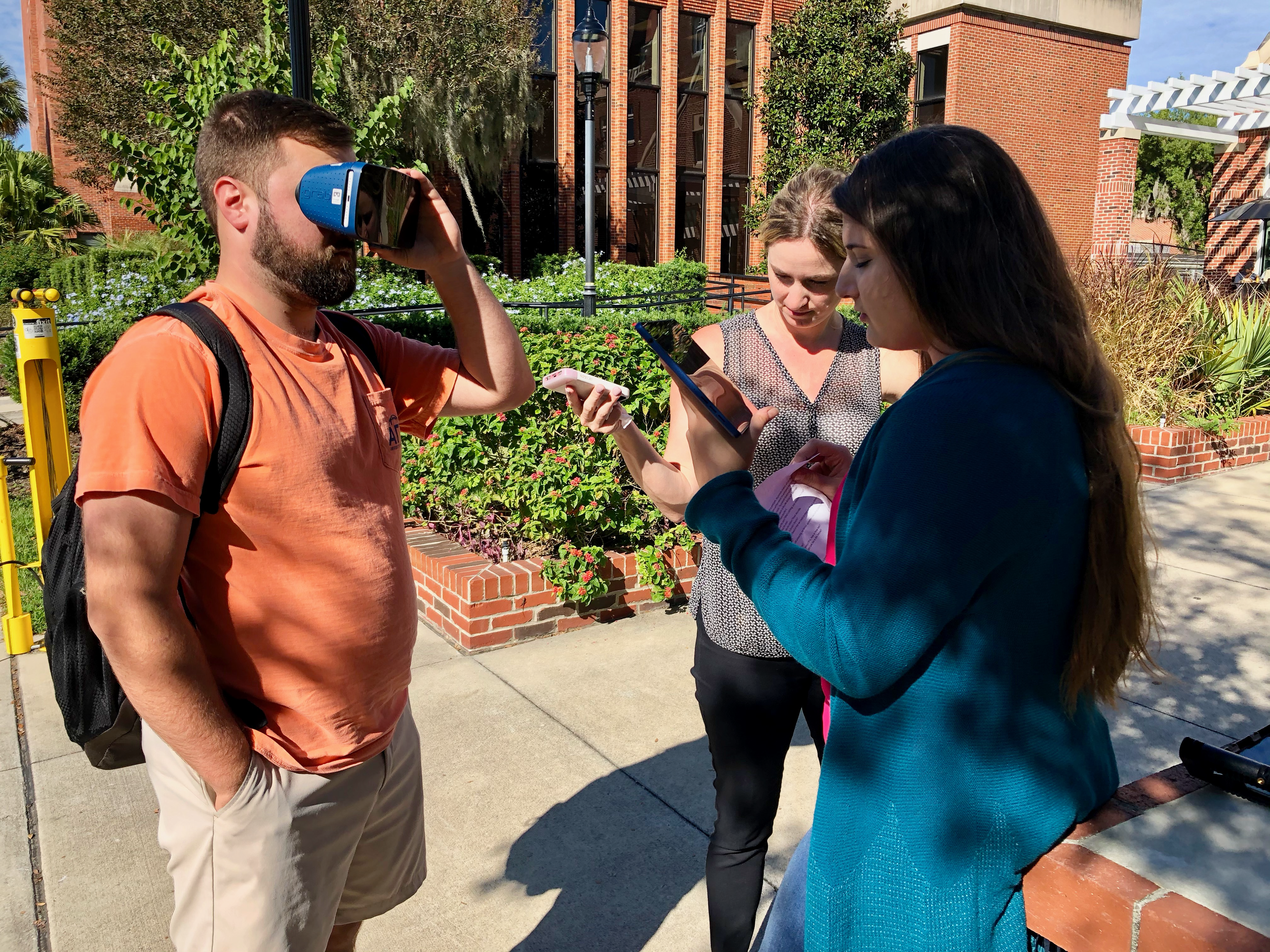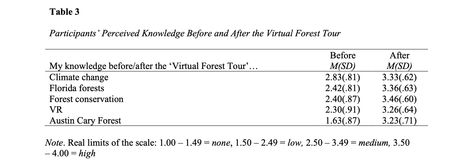 Students delivered the tours by reading a script, a compilation of the students’ writing while the participants simultaneously explored a 360* forest photo tour through VR headsets. They collected three forms of data: a) graduate students’ pre-reflections before giving the VR tours and post-reflections after the experience (qualitative), b) transcripts of audio recordings of the think-aloud discussions between the graduate student VR tour developers and public participants (qualitative), and c) a post-VR survey about community participants’ climate change attitudes and VR tour perceptions (quantitative).