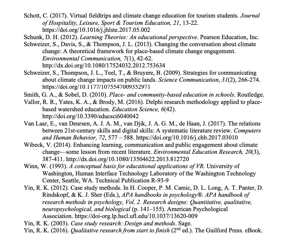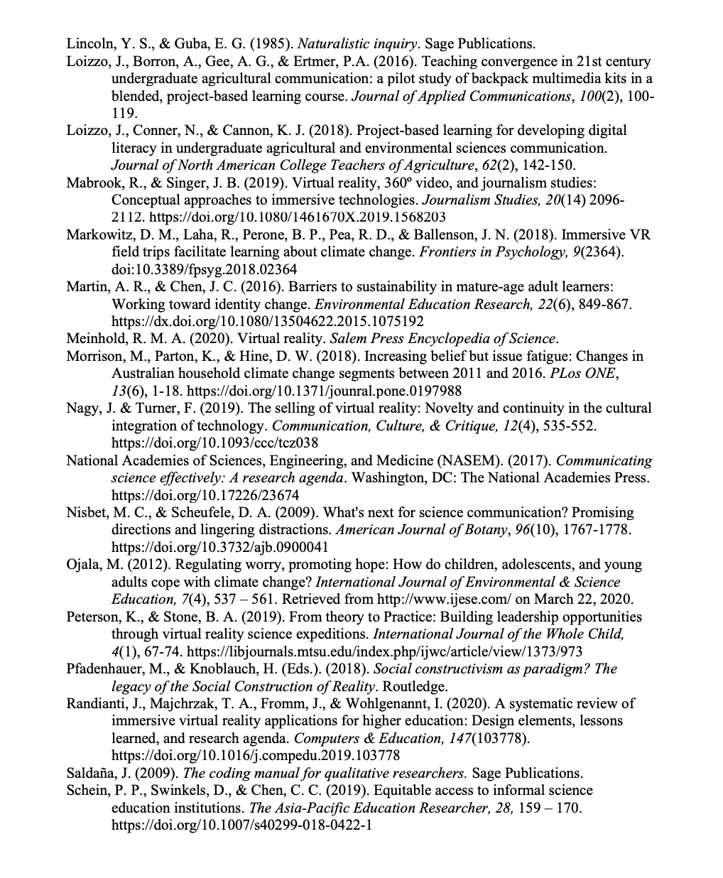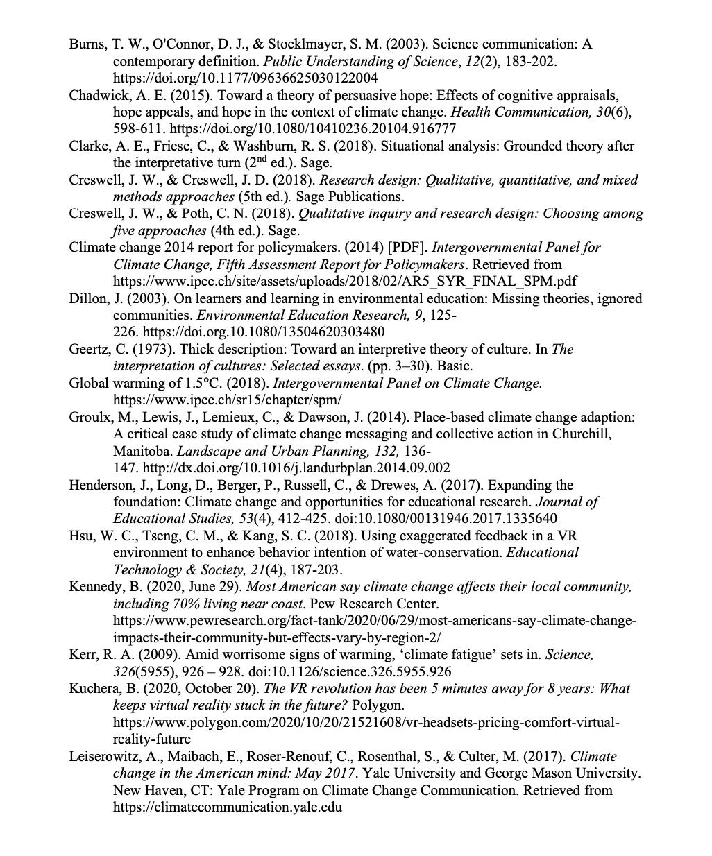This study was performed to examine how developing and hosting virtual reality (VR) tours could serve as a way for science communication graduate students to practice their multimedia and engagement skills through communication with the public about climate change. The team provided literature reviews including Innovative Teaching for 21st Century Science Communication, Climate Change Communication, and Virtual Reality (VR) for Informal Science Engagement (ISE). These literature reviews provided foundation for the reasons why this study was performed, the need for advanced science communication, climate change communication specifically and how virtual reality can help to communicate science literacy effectively.