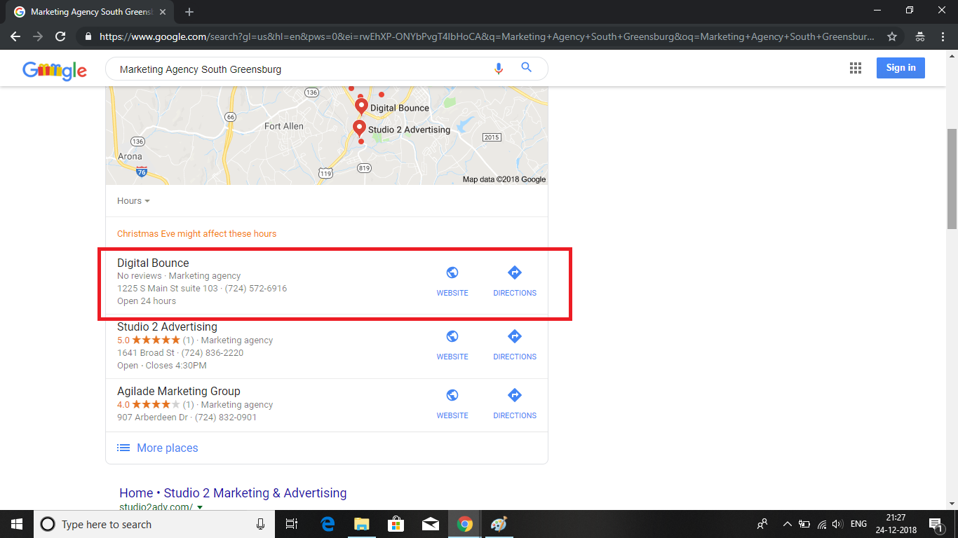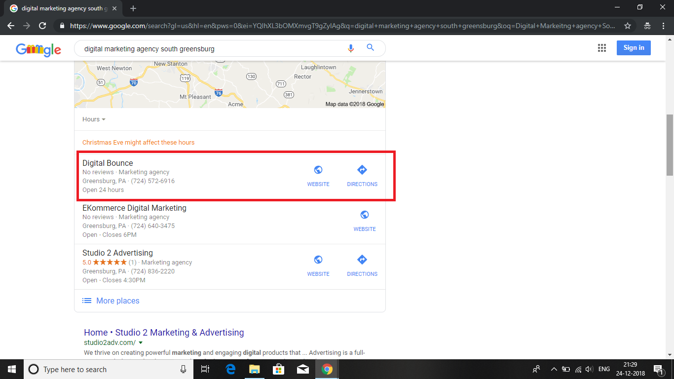 Listed Digital Bounce in Map Pack for keyword " Digital Marketing Agency South Greensburg"