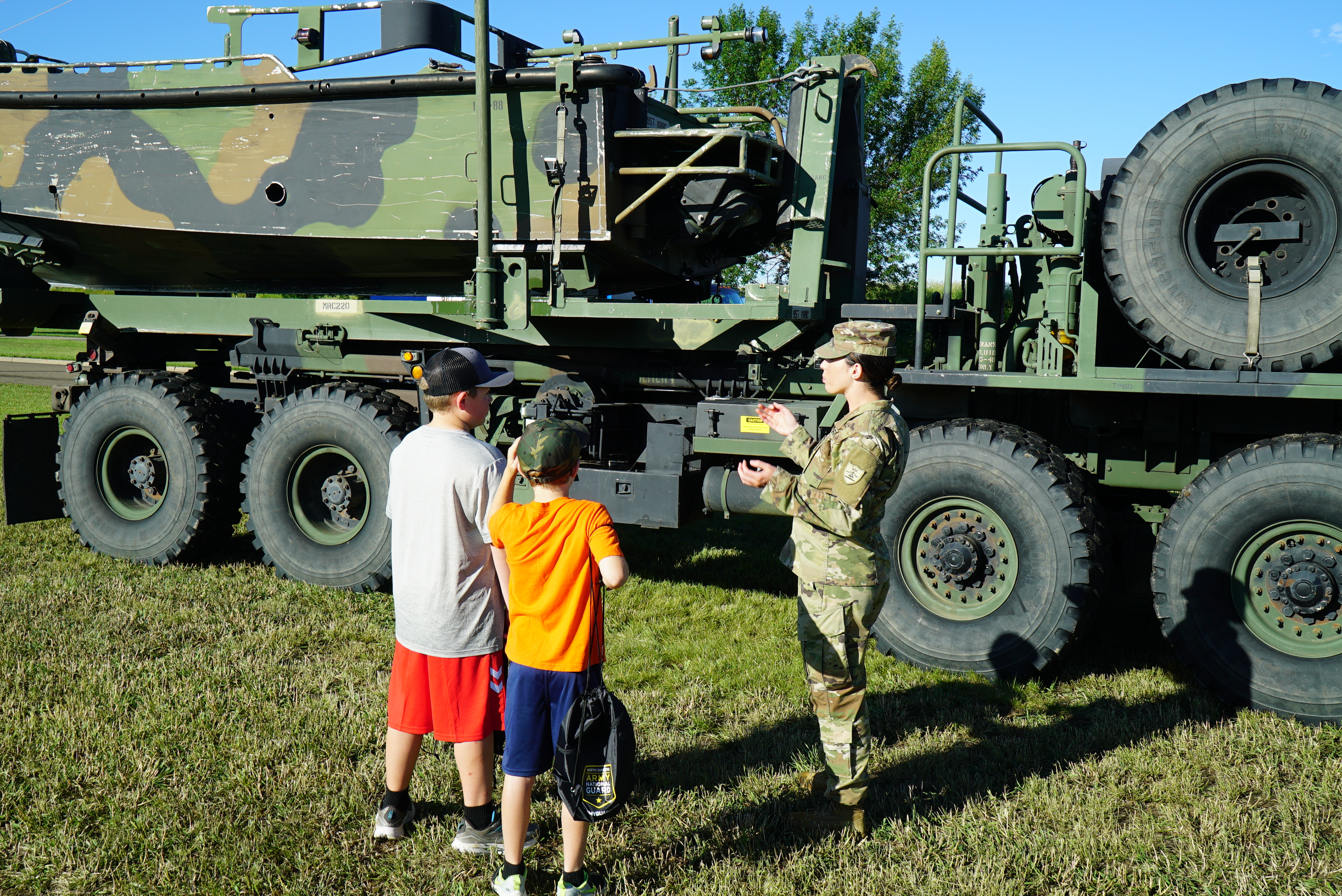 Spc. Nicole Streyle, 957th Engineer Company, talks with children about the M1977 Common Bridge Transporter before the Mandan Independence Day parade, Mandan, July 4, 2022.