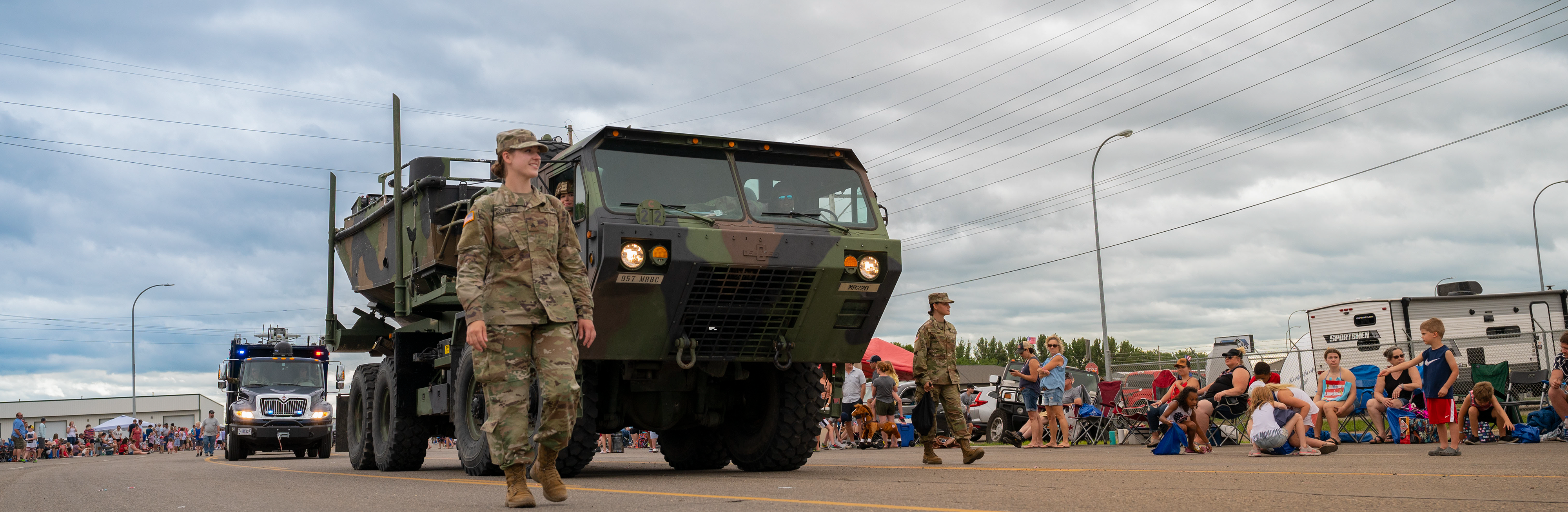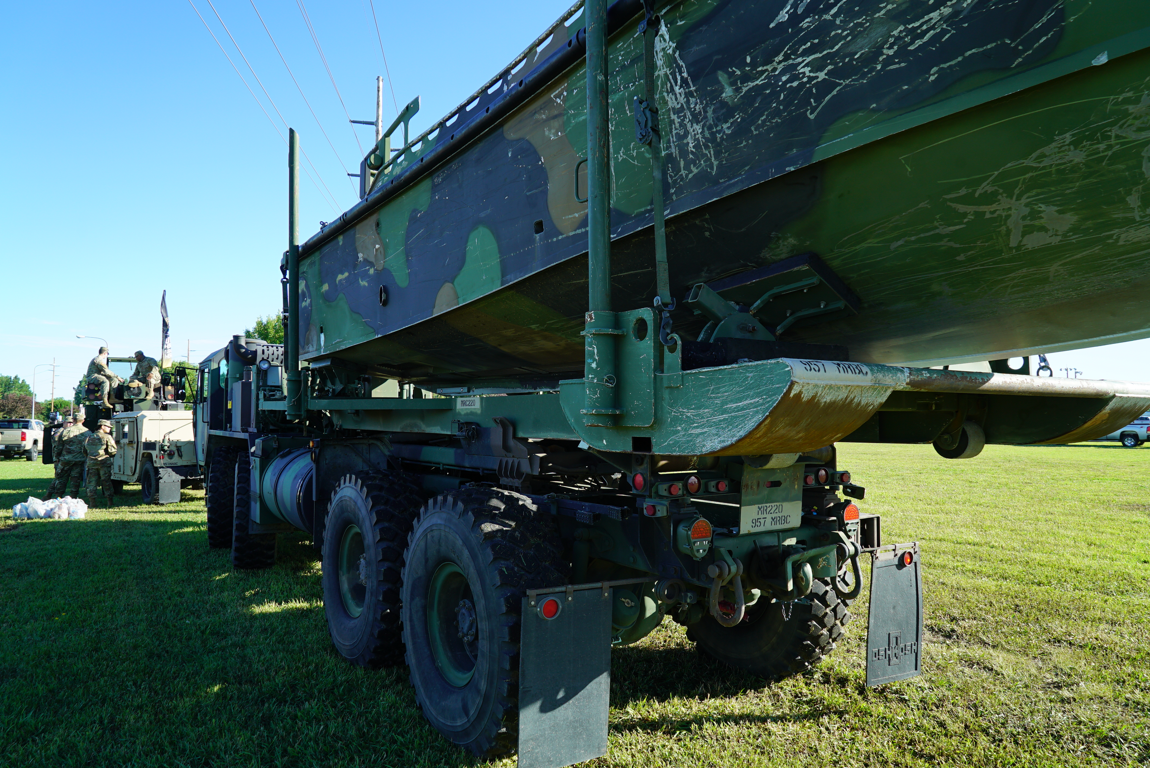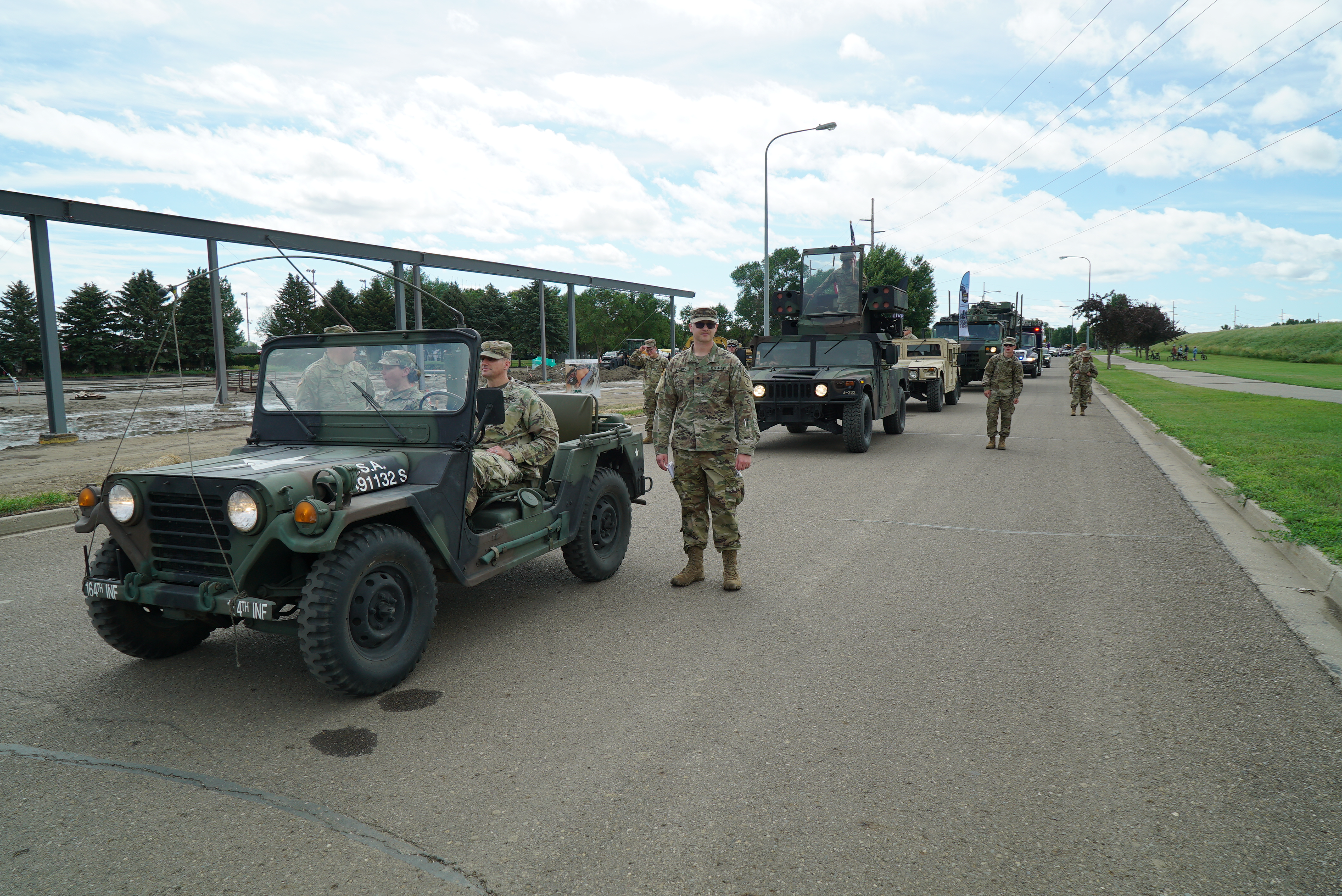 The Soldiers operated five pieces of equipment in the parade led by the adjutant general's privately owned U.S. Army Jeep. Soldiers of the 1st Battalion, 188th Air Defense Artillery Regiment drove an AN/TWQ-1 Avenger Air Defense System followed by a High Mobility Multipurpose Wheeled Vehicle (HMMWV), and a M1977 Common Bridge Transporter with Standard Ribbon Bridge, 957th Engineer Company (Multi-role Bridge). Members of the 81st Civil Support Team operated a Unified Command Suite and N.D. Air National Guard recruiters operated a patrol vehicle from the Minot Air Force-based 219th Security Forces Squadron.