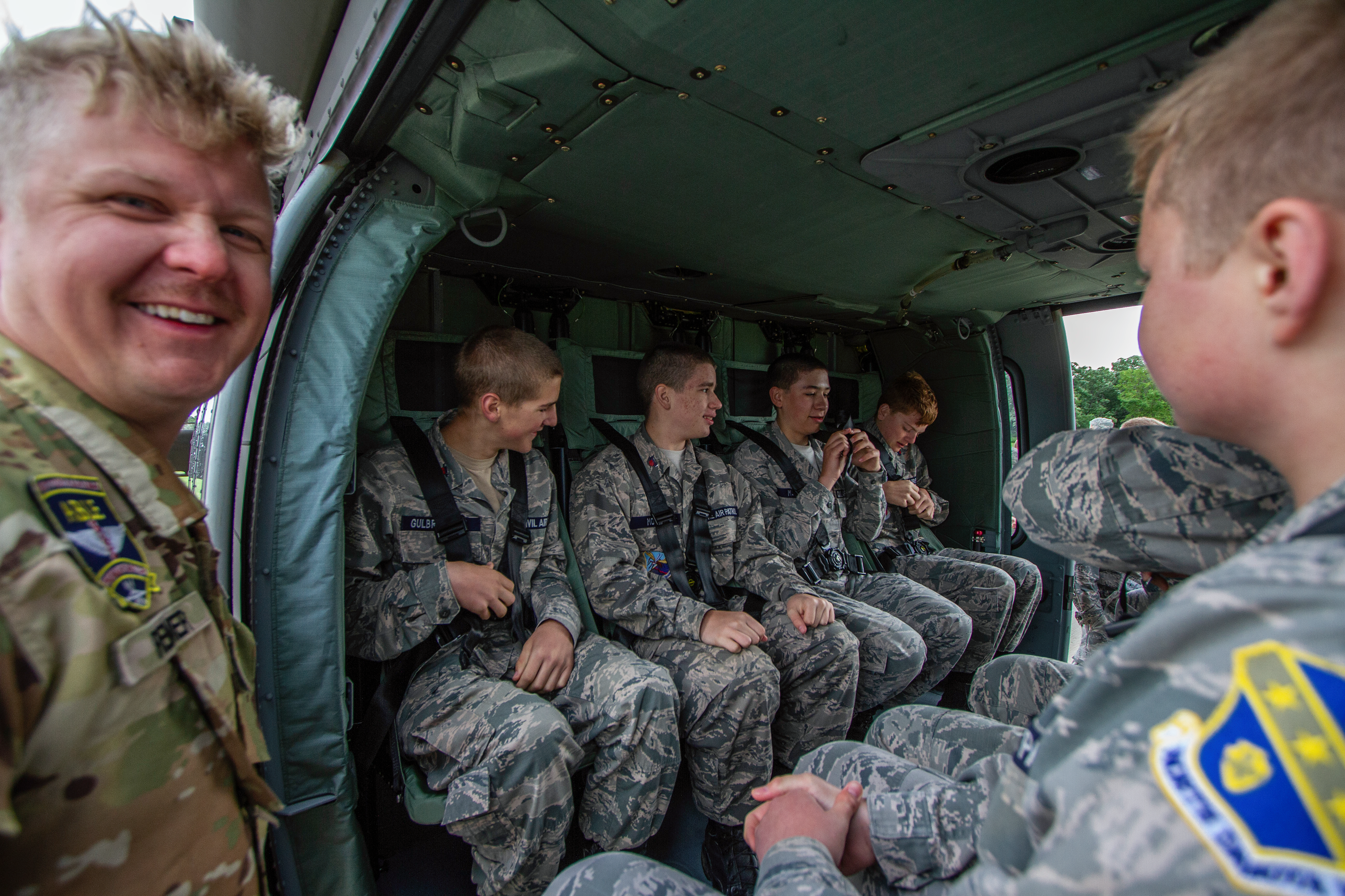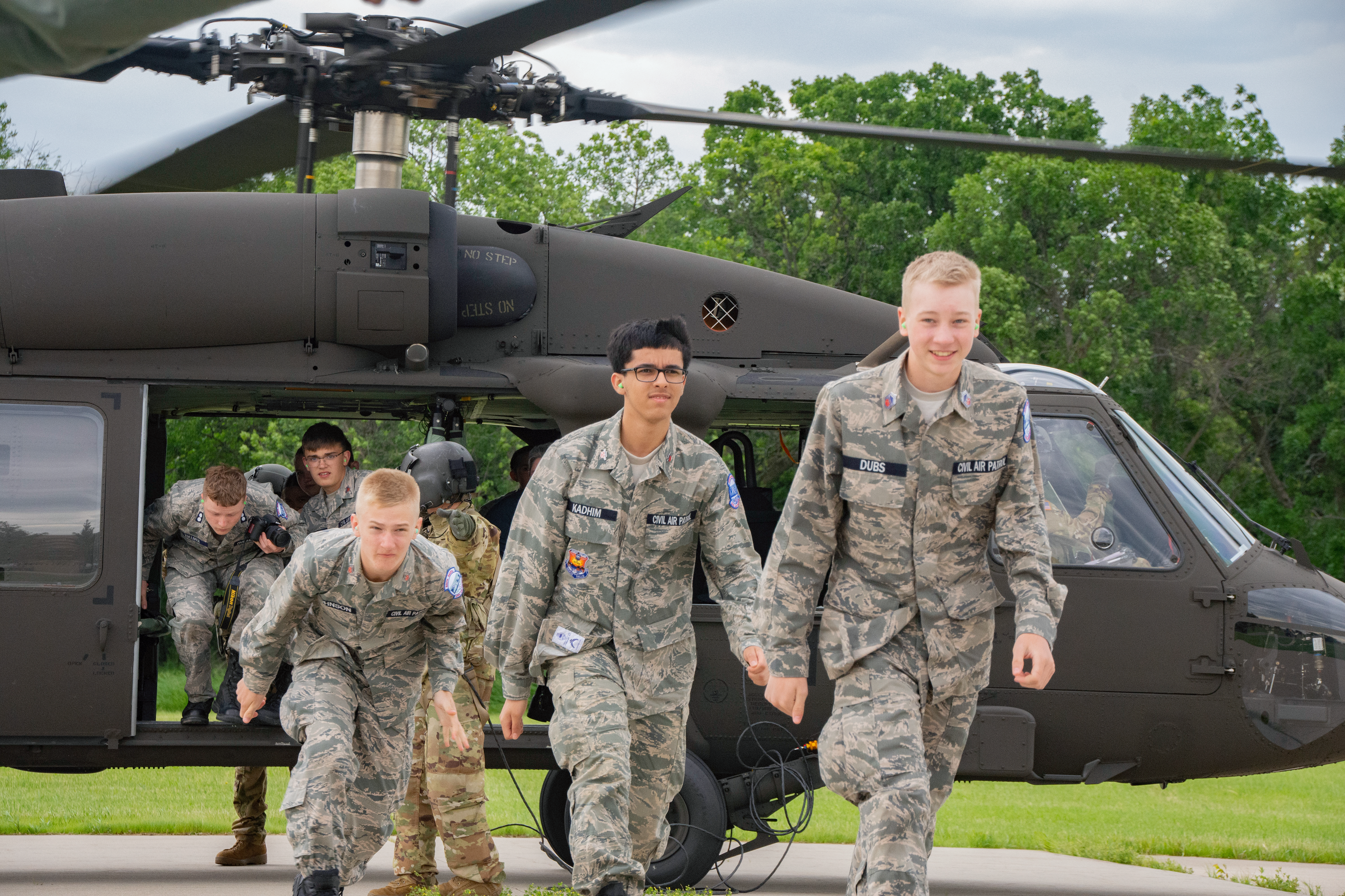 Cadets disembark a UH-60 Black Hawk after their orientation flight at the Civil Air Patrol Joint Dakota Encampment, Camp Grafton Training Center, June 29, 2022.