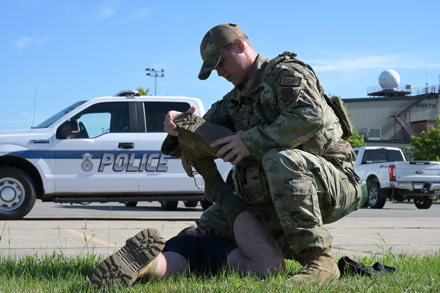 Staff Sgt. Austin Bonn, 119th Security Forces Squadron, conducts a search of simulated gate runner suspect Airman 1st Class Lucas Hofer, 119th Communications Flight, during a security forces training exercise at the N.D. Air National Guard Base, Fargo, July 6, 2022. (National Guard photo by David Lipp, 119th Wing Public Affairs Office)