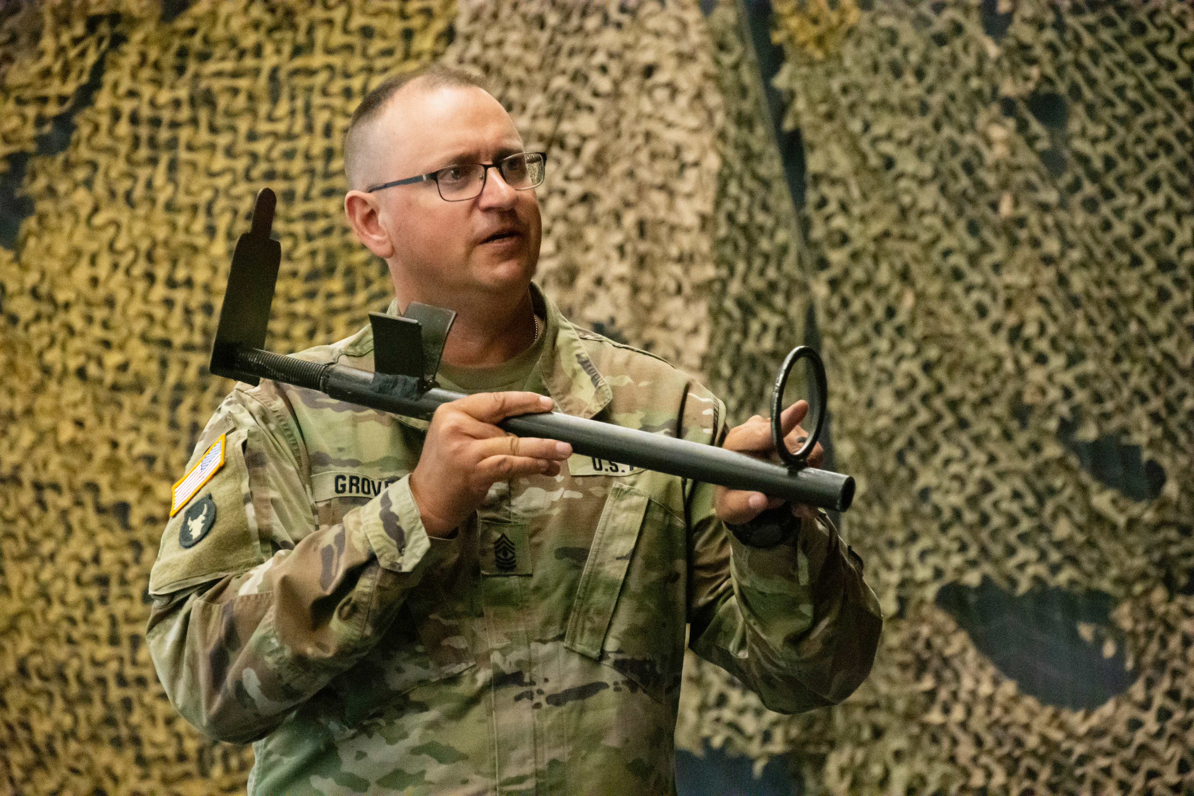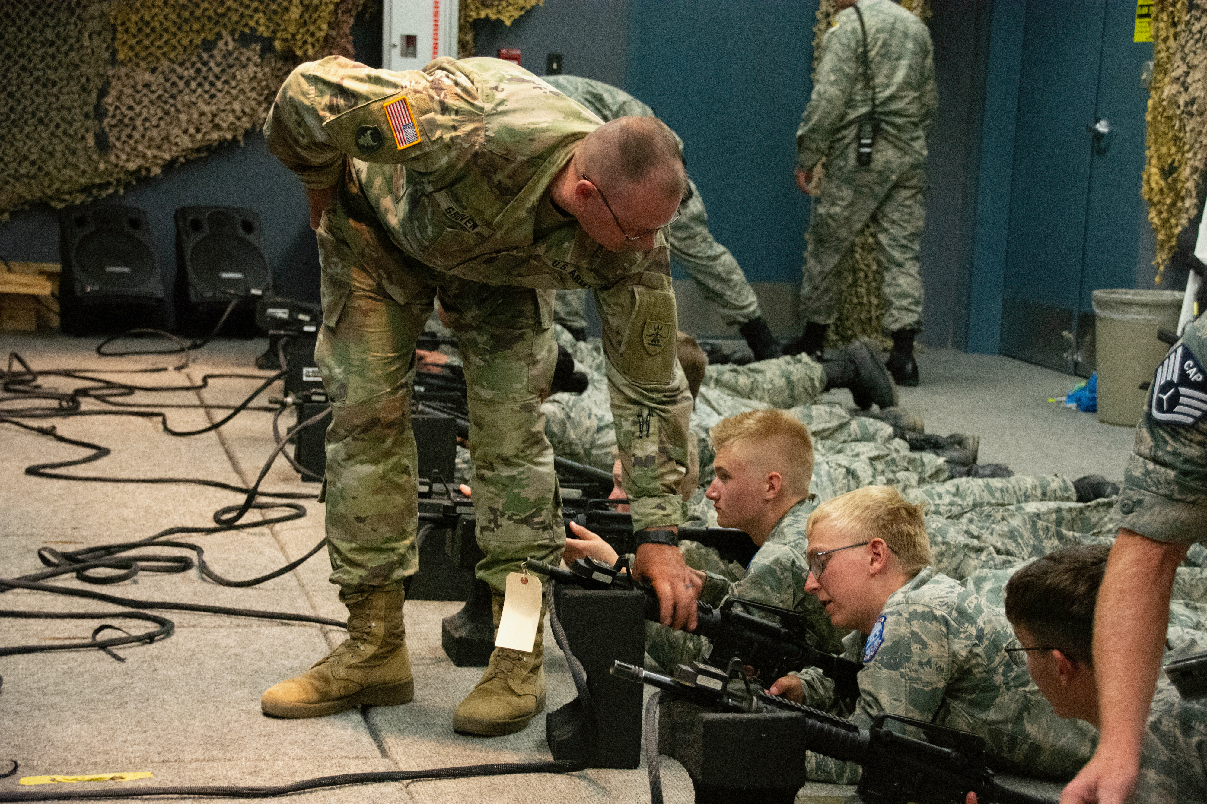 1st Sgt. Michael Groven, N.D. National Guard, coaches Civil Air Patrol cadets on the proper operation of the M4 carbine rifle in the Engagement Skills Trainer, Camp Grafton Training Center, June 29, 2022.