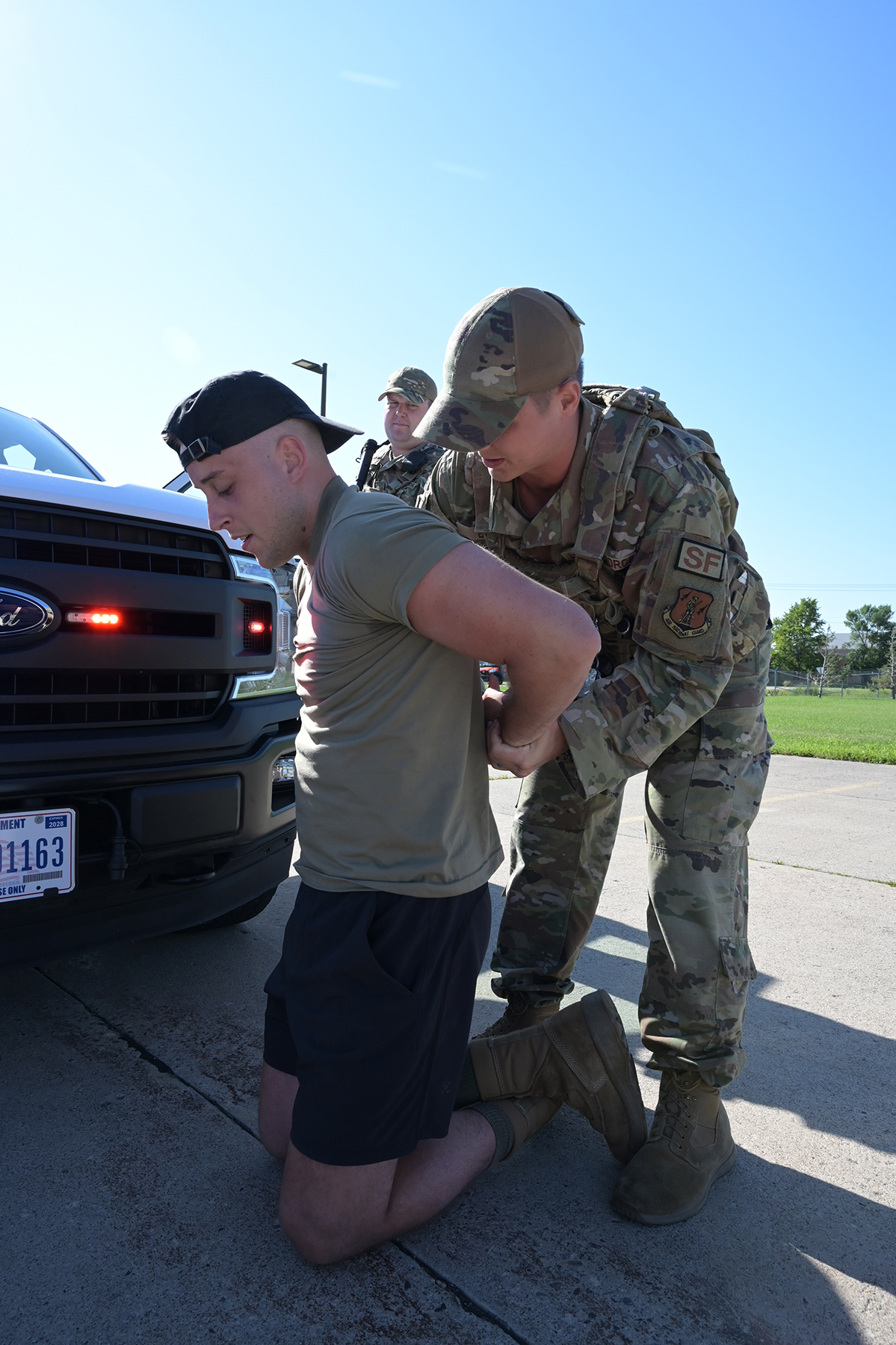 Simulated gate runner Airman 1st Class Lucas Hofer, 119th Communications Flight, surrenders as 119th Security Forces Squadron members Staff Sgt. Austin Bonn, right, and Tech. Sgt. Steven Brauner direct him during a high-risk stop during a security exercise at the N.D. Air National Guard Base, Fargo, N.D., July 6, 2022.