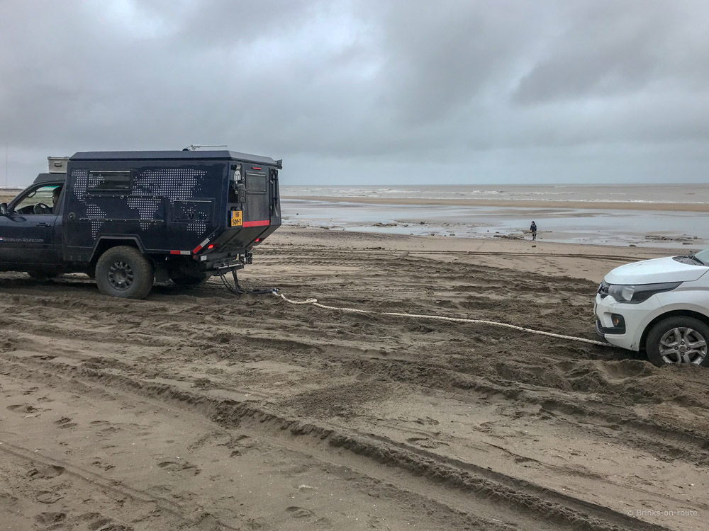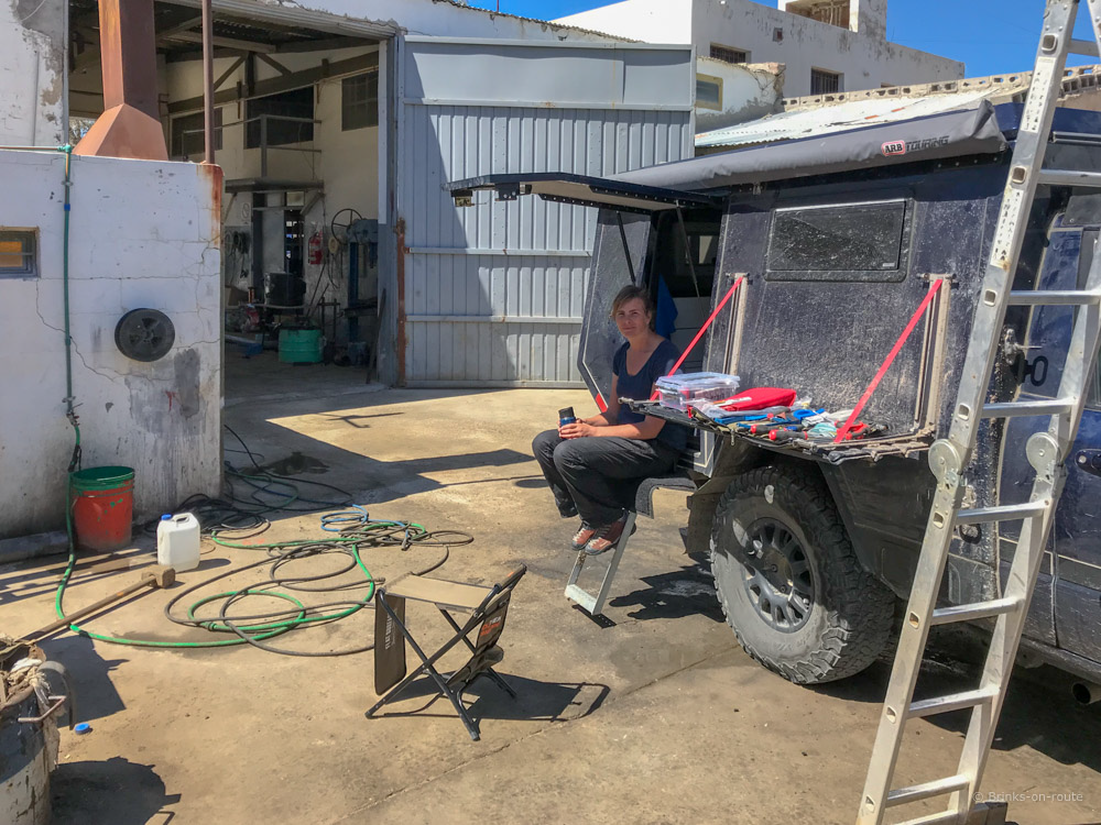 Via de "A"1 rijden we over de onverharde weg naar het zuiden. Al het gehobbel blijkt net even teveel wanneer er plotseling een luide tik op het dak klinkt en er iets begint te rammelen. Bij nader inspectie blijken er 3 popnagels van het roofrack geknapt te zijn. Omdat we geen popnageltang en nagels mee hebben gaan we op zoek naar een garage. Hier kunnen we gebruik maken van zijn spullen en hoeven alleen de popnagels af te rekenen. Voor de zekerheid zet Sven er nog een aantal extra bij. En schaffen we zelf een popnageltang aan. Dit zal in de toekomst wel vaker gebeuren.