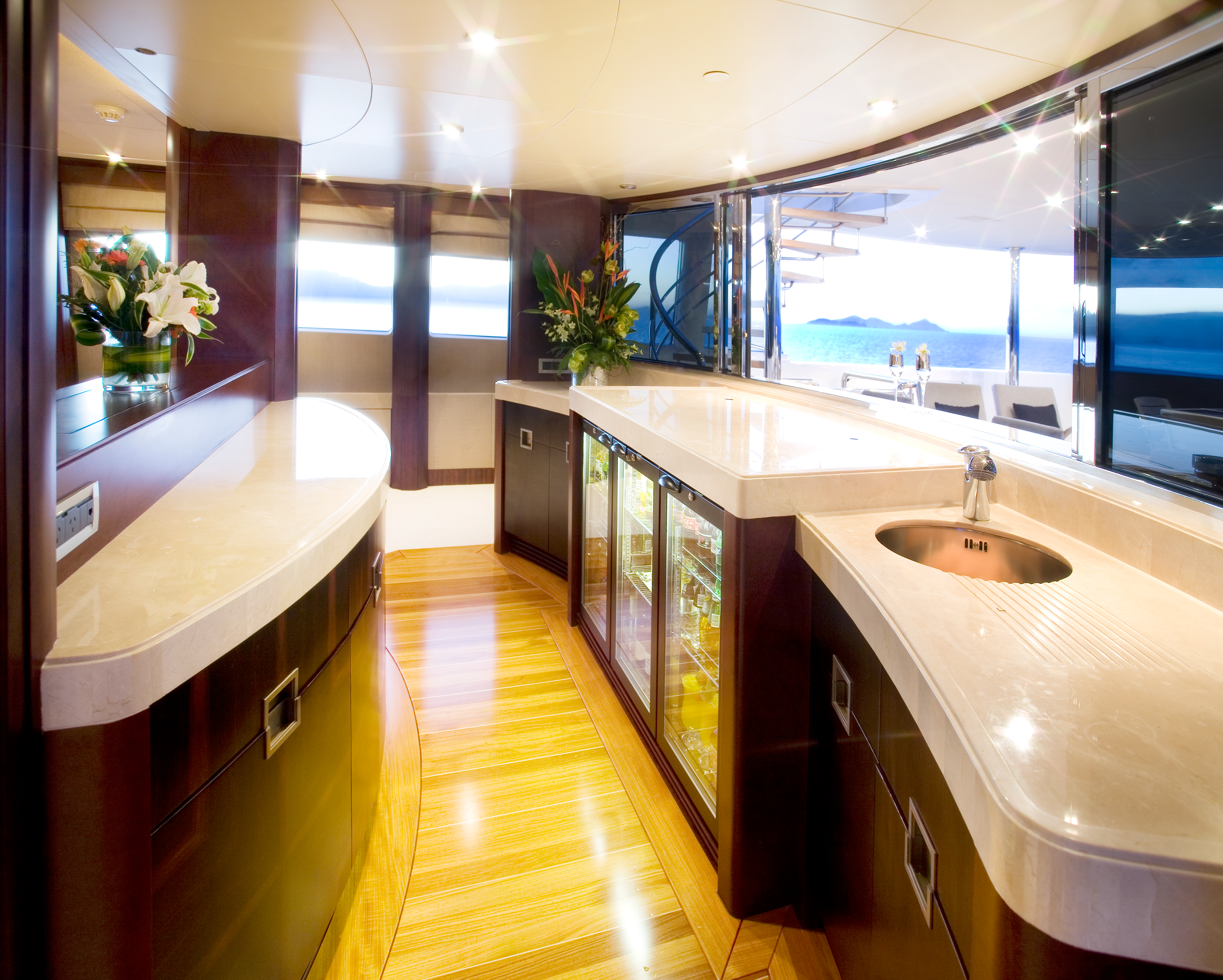 With exceptional space and superior stability, DE LISLE III is perfectly suited to alfresco entertaining, offering expansive exterior living areas across every level. The main deck features a generous aft deck with plush seating and a dining table, while the transom lowers to reveal a stunning teak swim platform for easy access to the water. On the upper deck, guests can enjoy a central wet bar with barstools, shaded lounging, and additional dining. The sun-drenched top deck provides panoramic views of the surrounding destinations, complete with an outdoor jacuzzi and inviting seating area — the ultimate space to unwind while cruising.