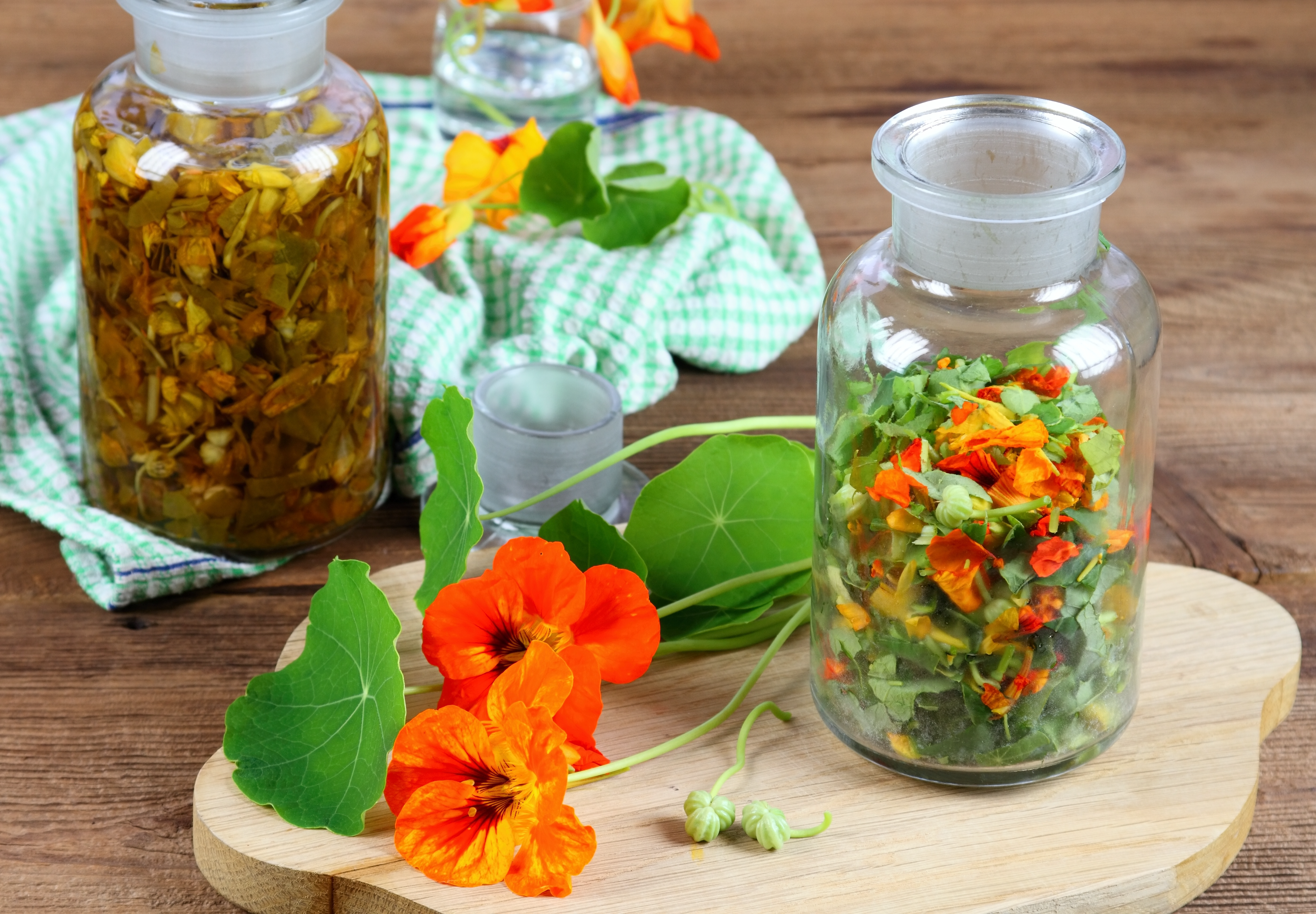Nasturtiums like even keel. They can handle sun with enough good, well watered soil where they can cascade down the side of a pot or over a raised bed. Let the flowers mature and the seeds form. Pick them while they are still green.